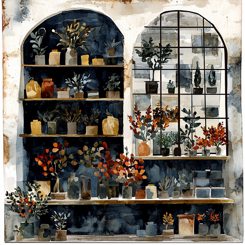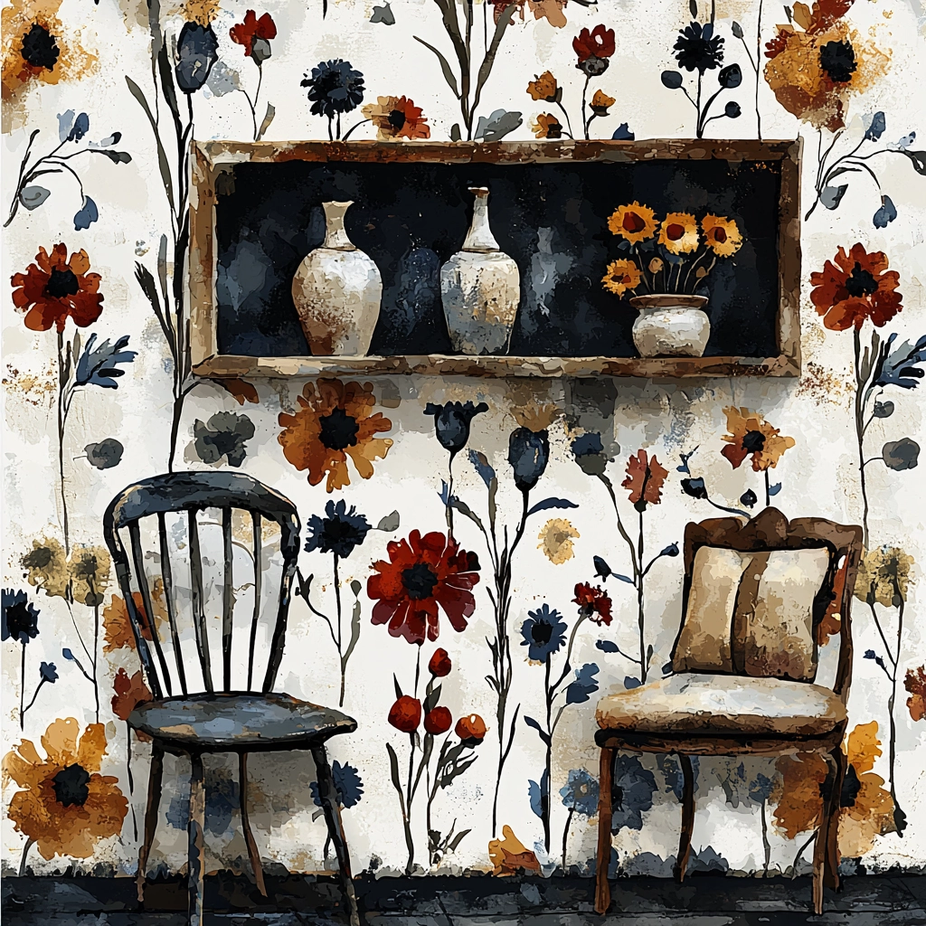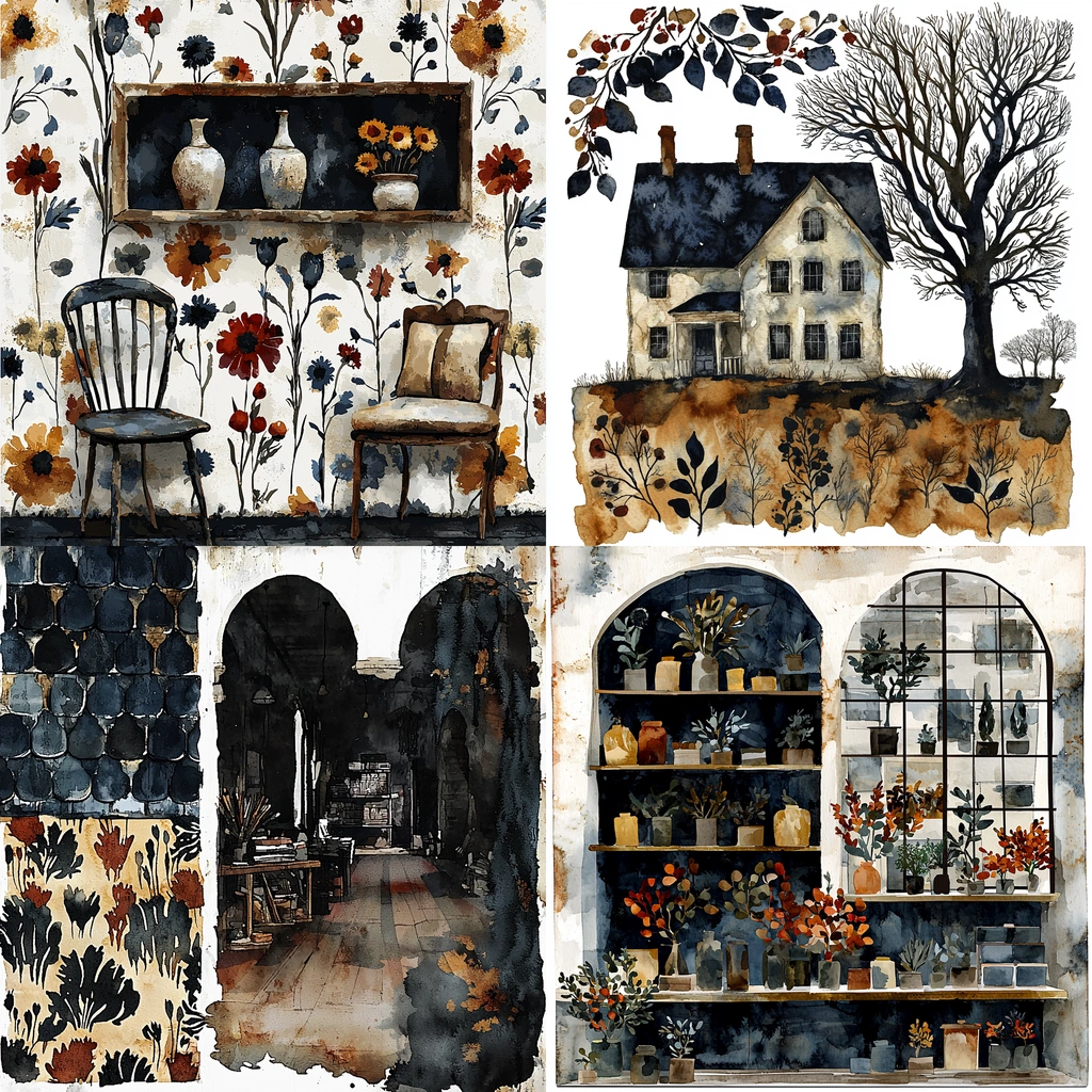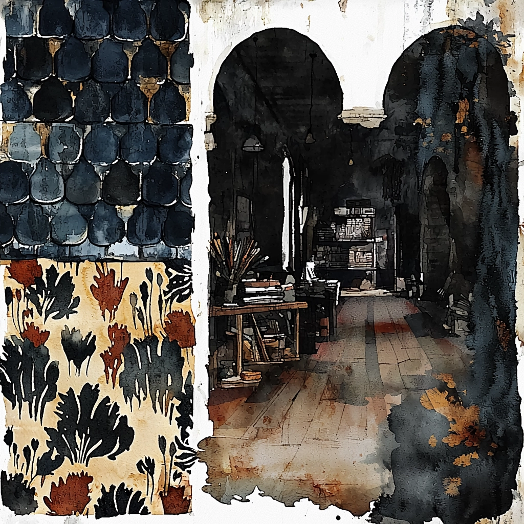 Soft lighting combined with muted tones creates a seamless blend of textures. Dark blue and brown provide depth, while white spaces offer balance. Detailed patterns convey a sense of motion and flow.