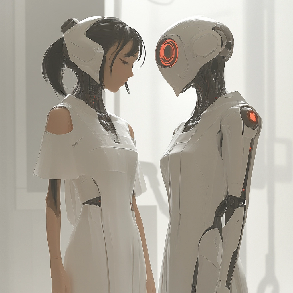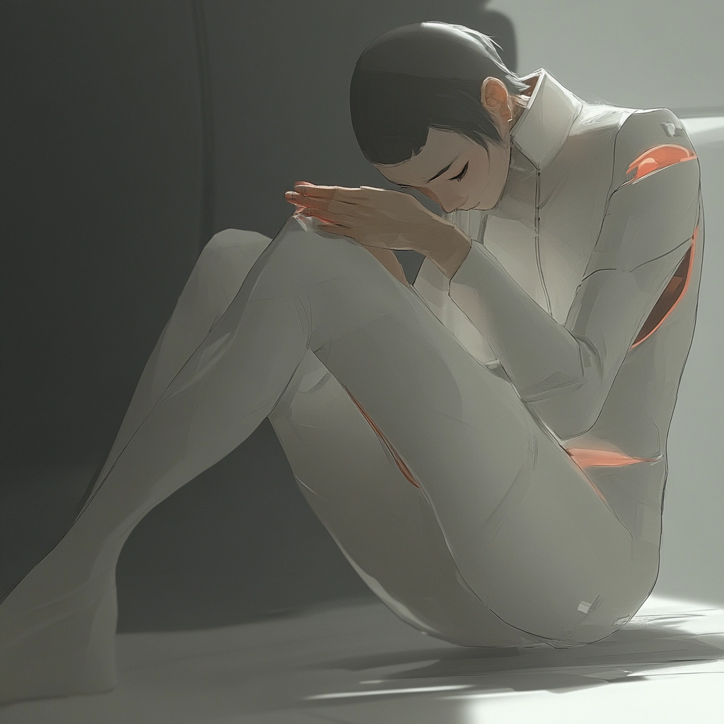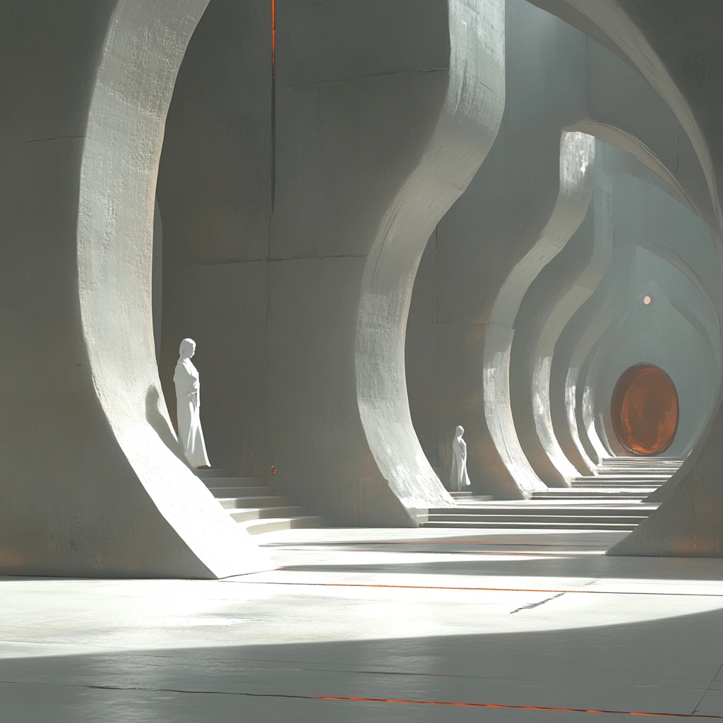 The lighting is soft and diffused, creating gentle shadowing and enhancing the smooth, sleek textures. Subtle spatial depth is suggested through the arrangement of forms. The gray and white palette is punctuated by deliberate, vivid orange highlights.