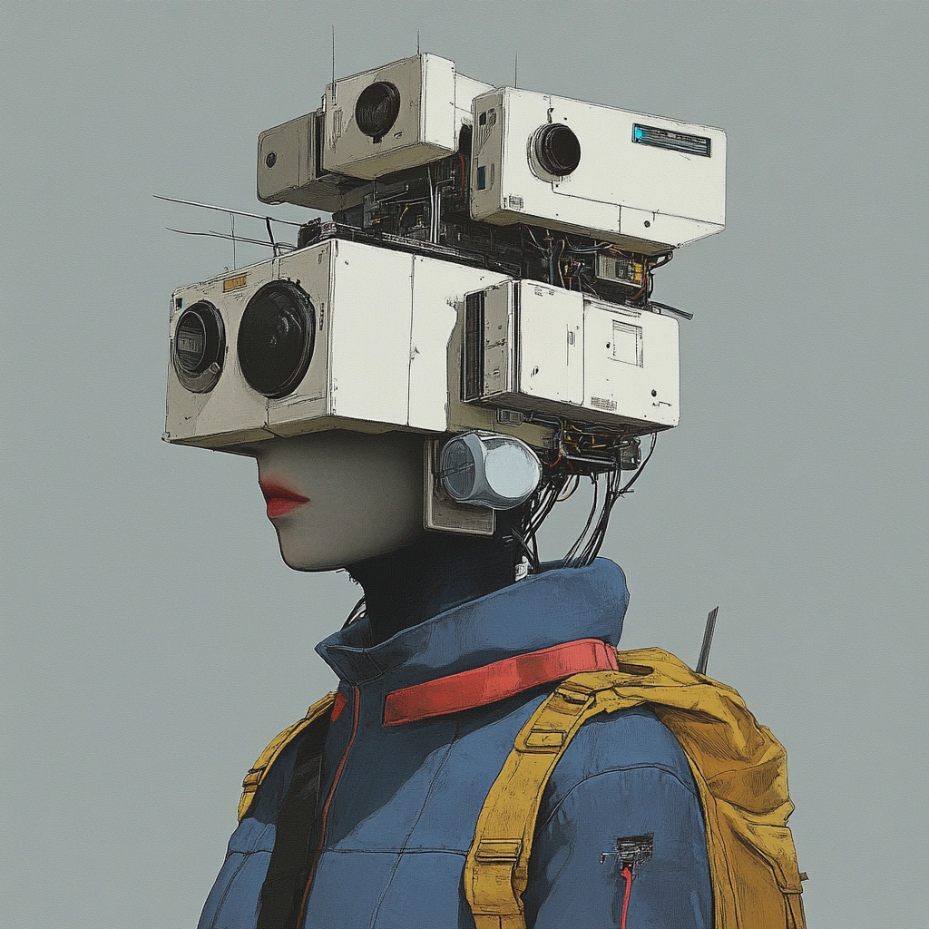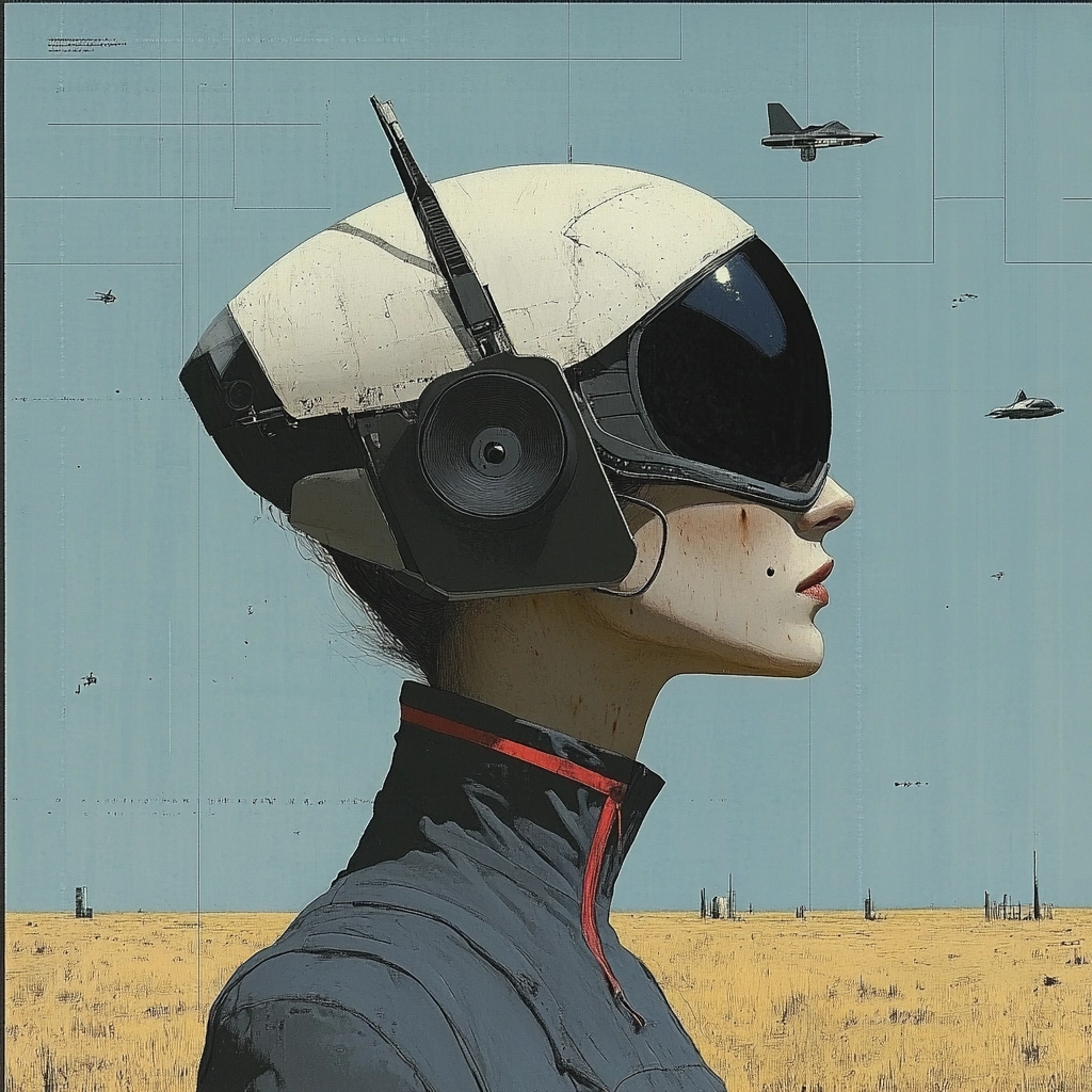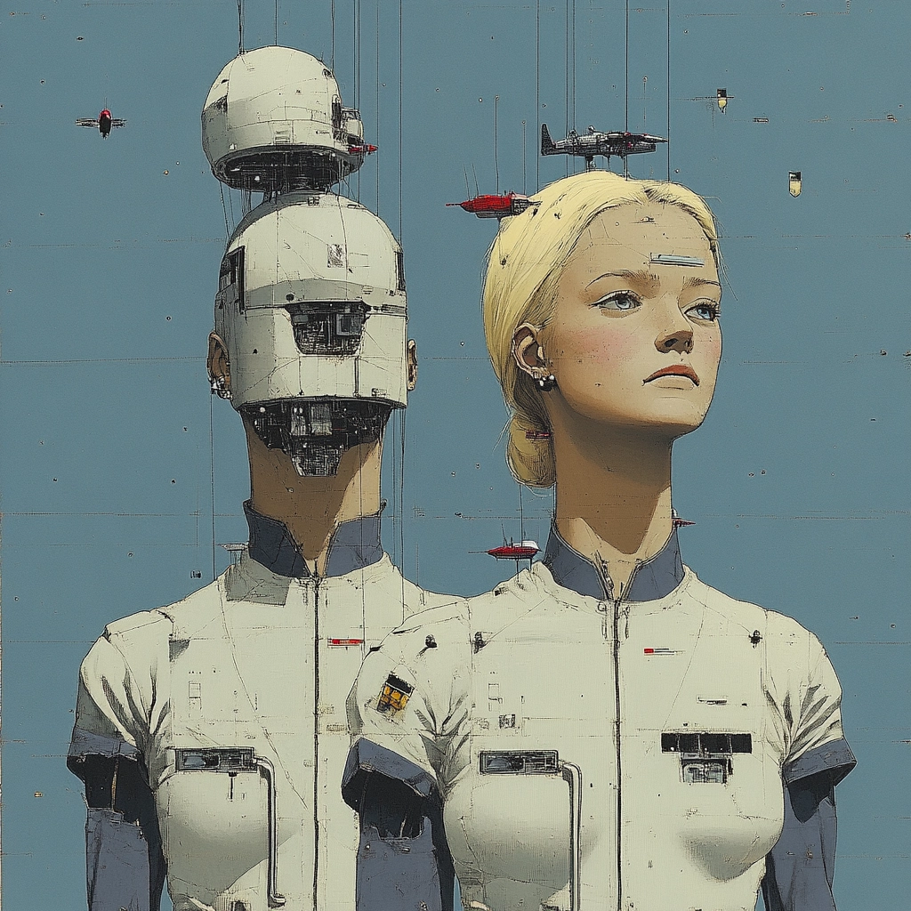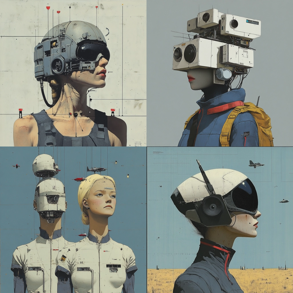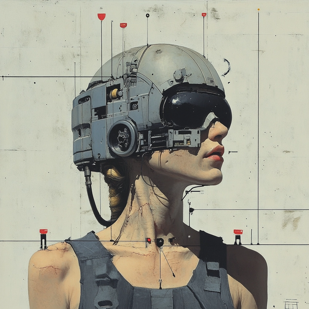 A focus on muted color combinations integrated with geometric and cybernetic elements.