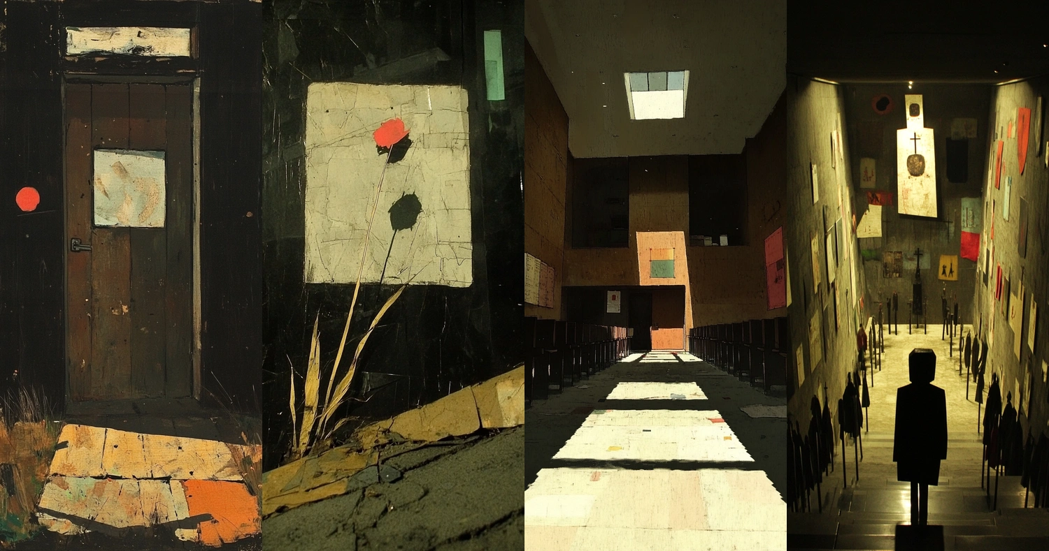 The use of stark lighting differentiates shadowed and illuminated areas, creating a strong sense of depth and space. Soft textures and muted colors emphasize geometric shapes, highlighting balance in design.
