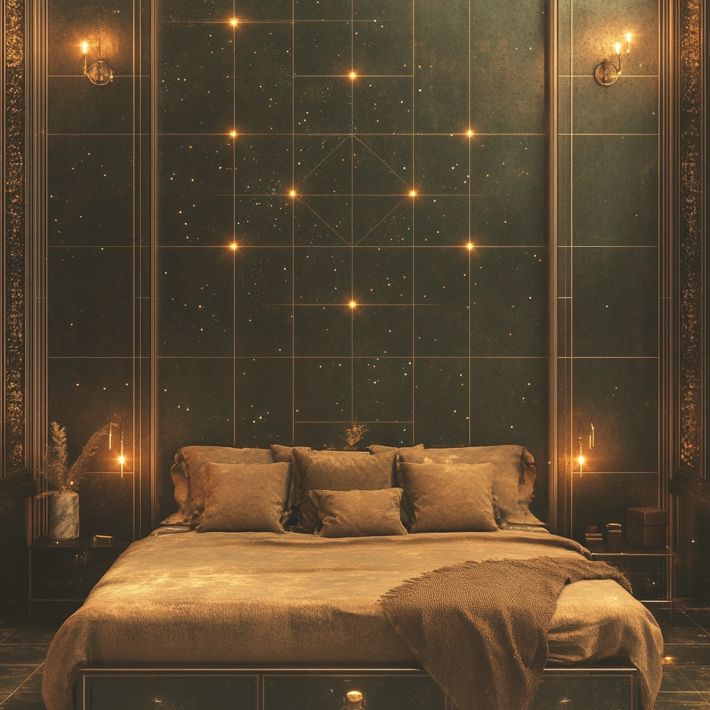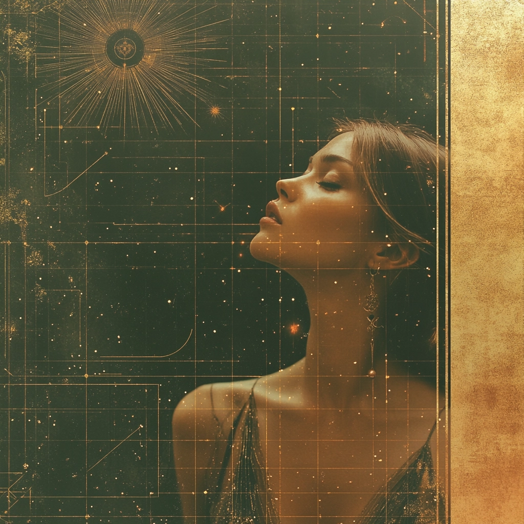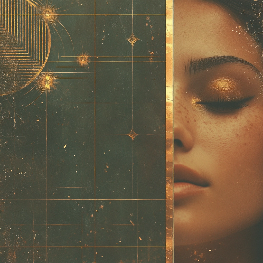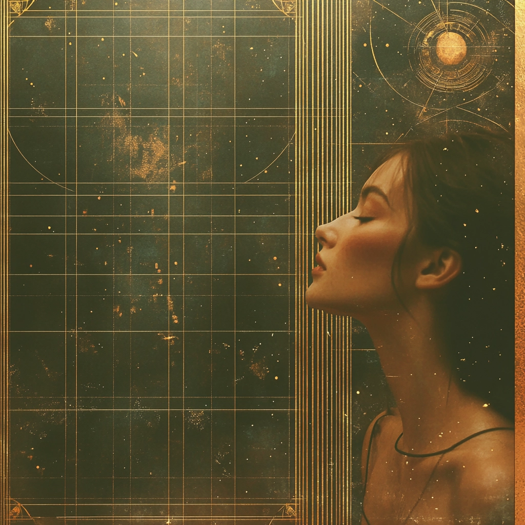 Lighting is diffused and warm, emphasizing smooth skin tones and subtle facial features, contrasted with a grid-based golden linear overlay that introduces spatial segmentation. The color palette restricts to muted gold and brown hues against dark backgrounds, enhancing contrast and texture clarity. Surfaces appear velvety with gentle gradations, while geometric lines add a sense of order and plane division.