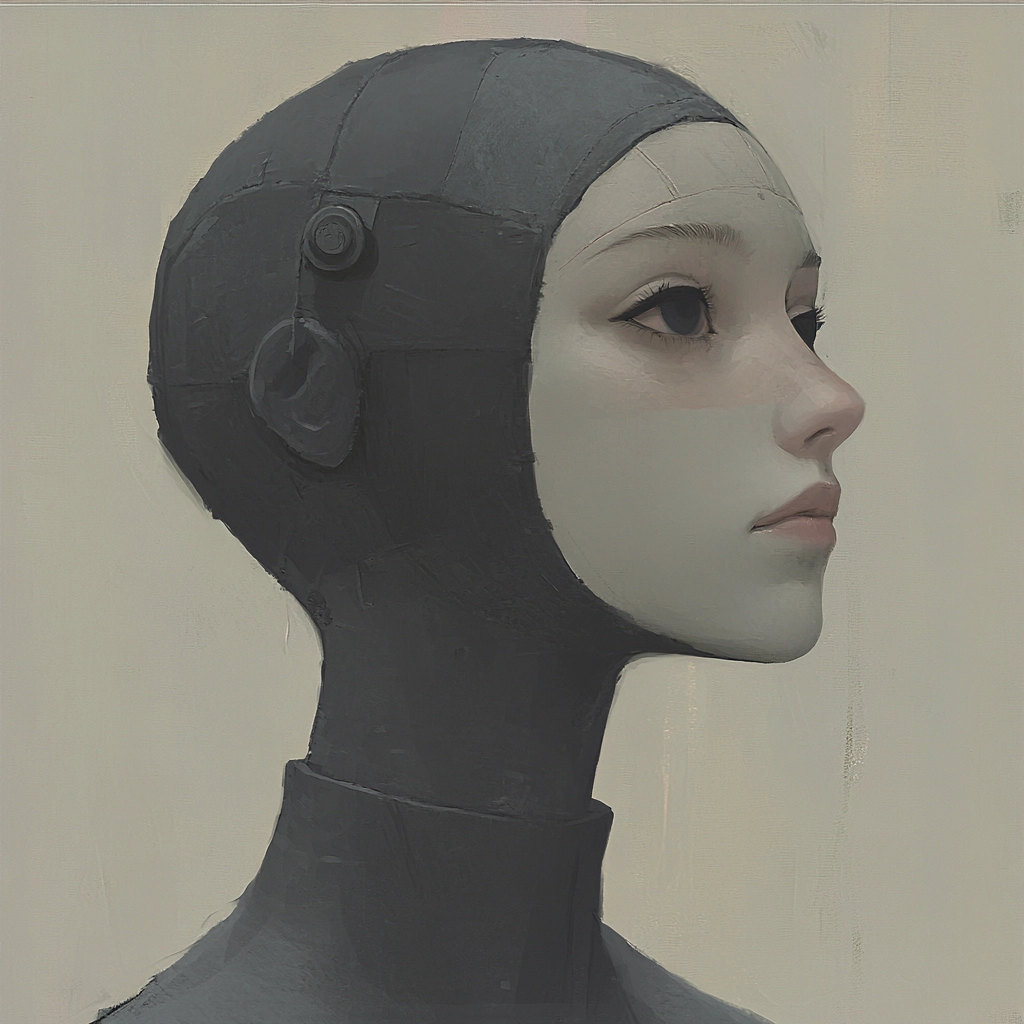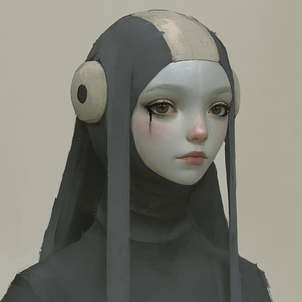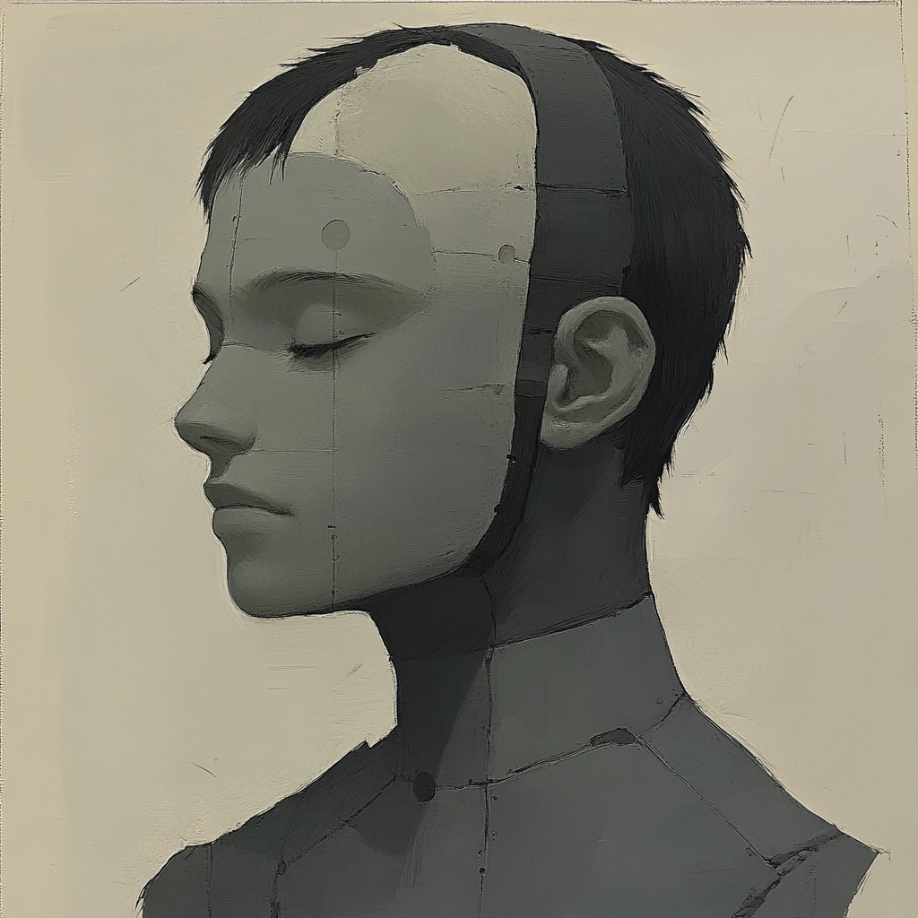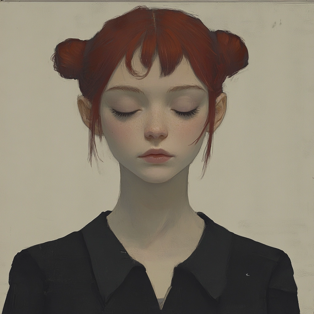 The lighting is soft and diffused, creating gentle shadows that accentuate the subtle transitions of gray tones. The use of gray offers a neutral base, while the red hair provides contrast and focal points. Textures are smooth and polished, contributing to a clean and minimalist aesthetic. The spatial sense is flat, giving an almost two-dimensional feel.
