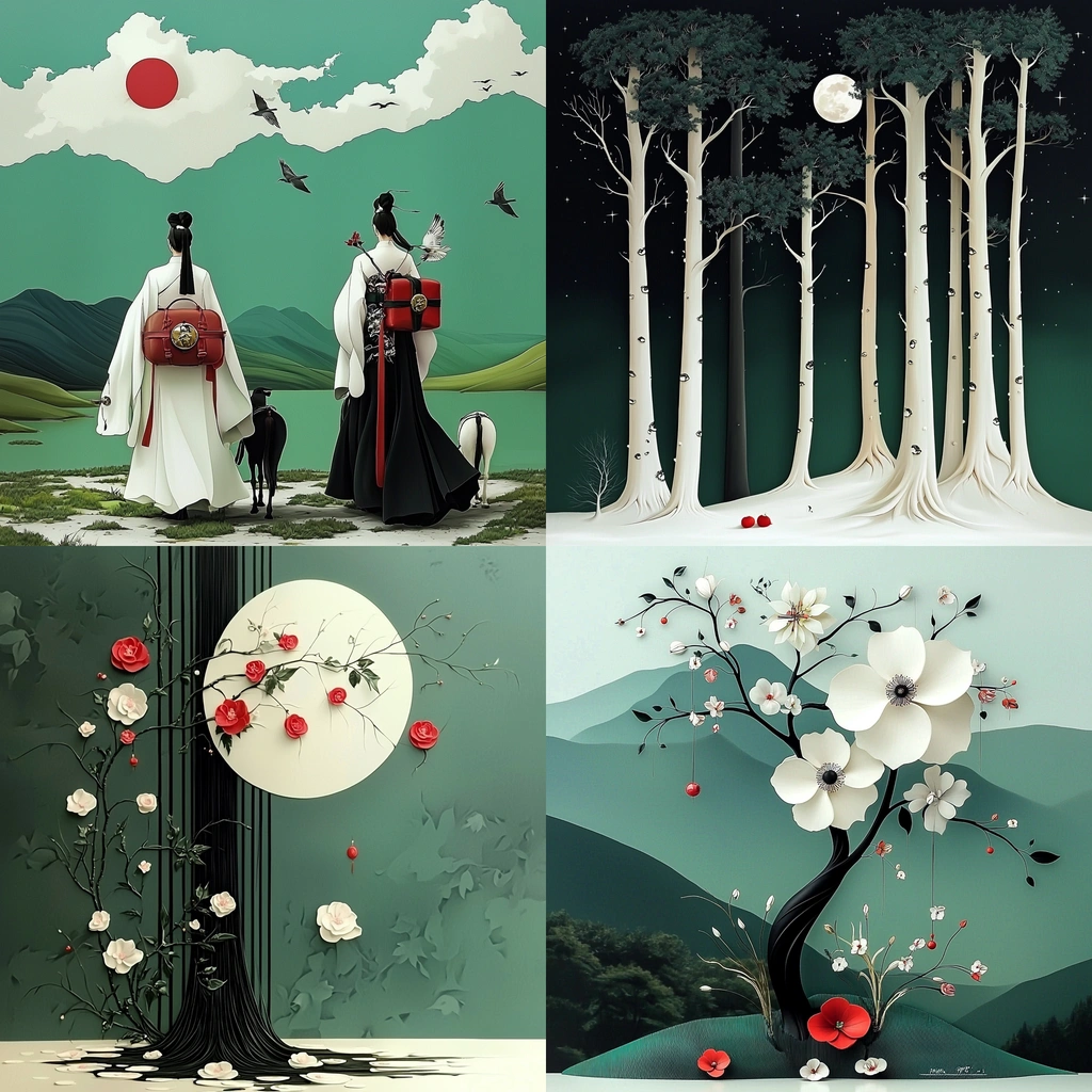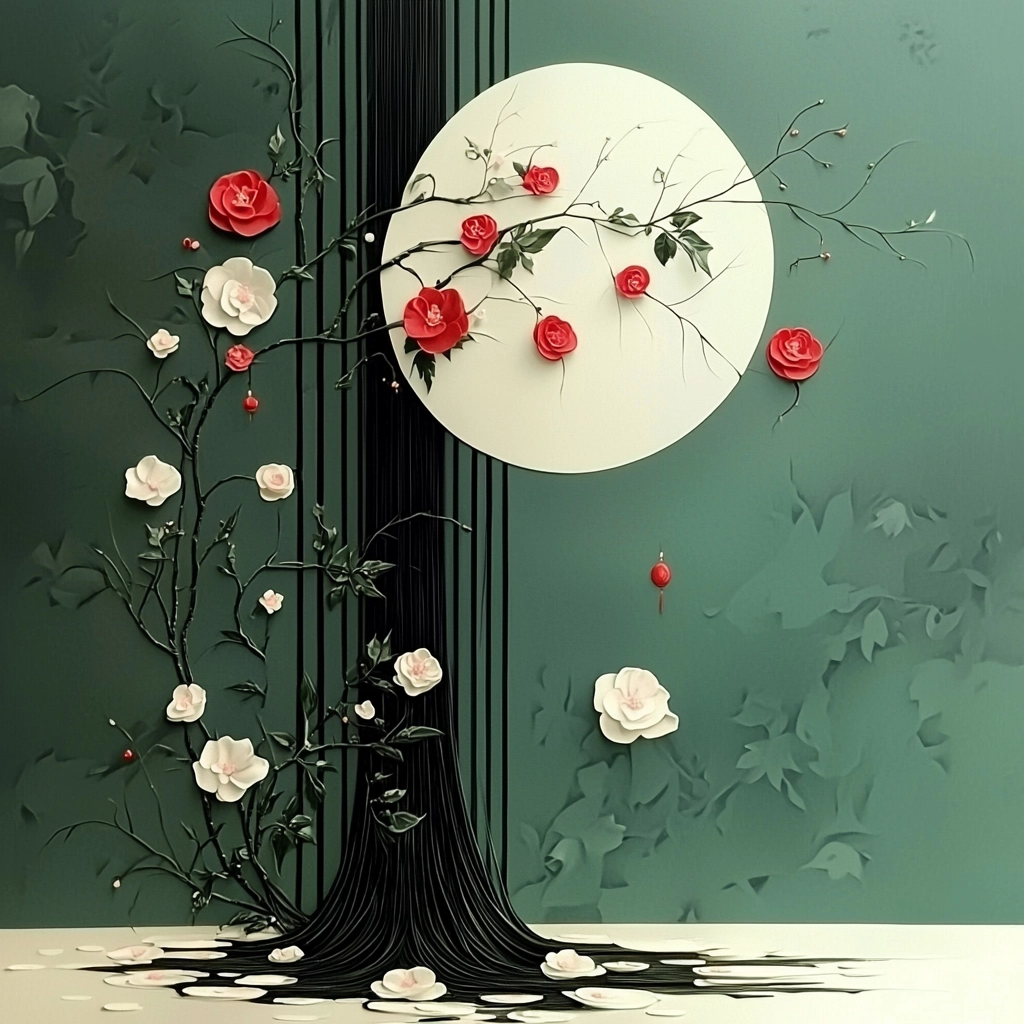 Subtly illuminated visual elements with a harmonious blend of muted green and striking red accents against a balanced spatial composition. Smooth textures and clear contours emphasize an elegant simplicity.