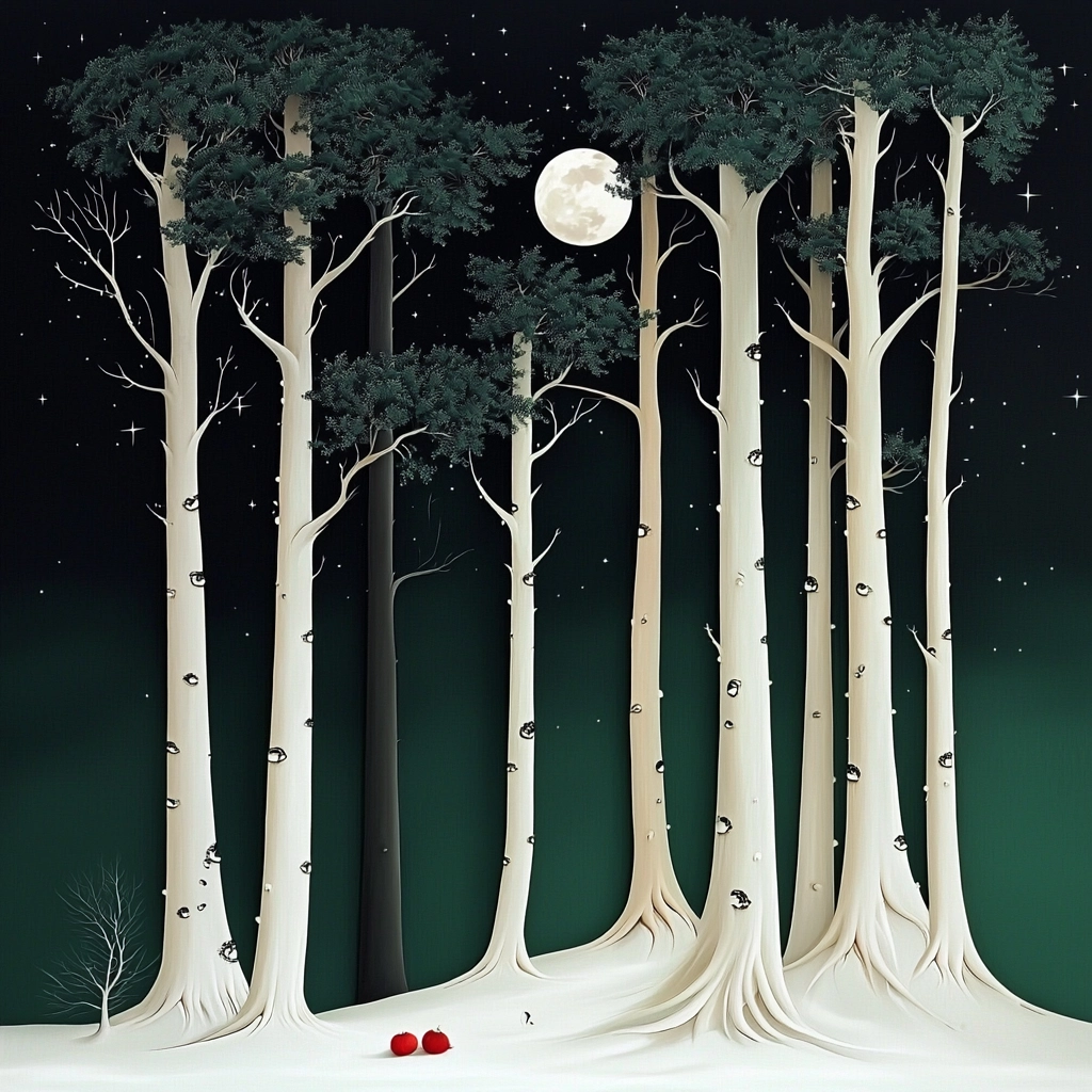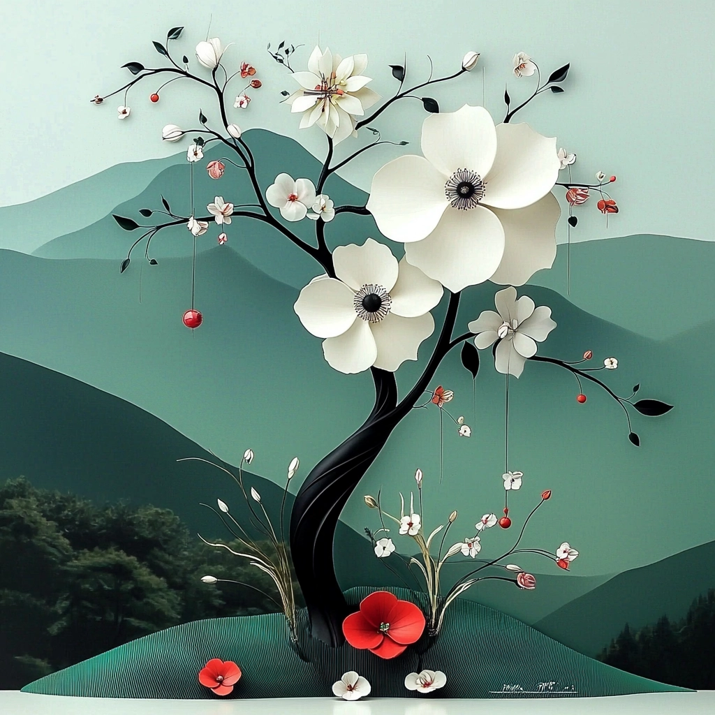A serene balance of subdued colors with stylized forms.