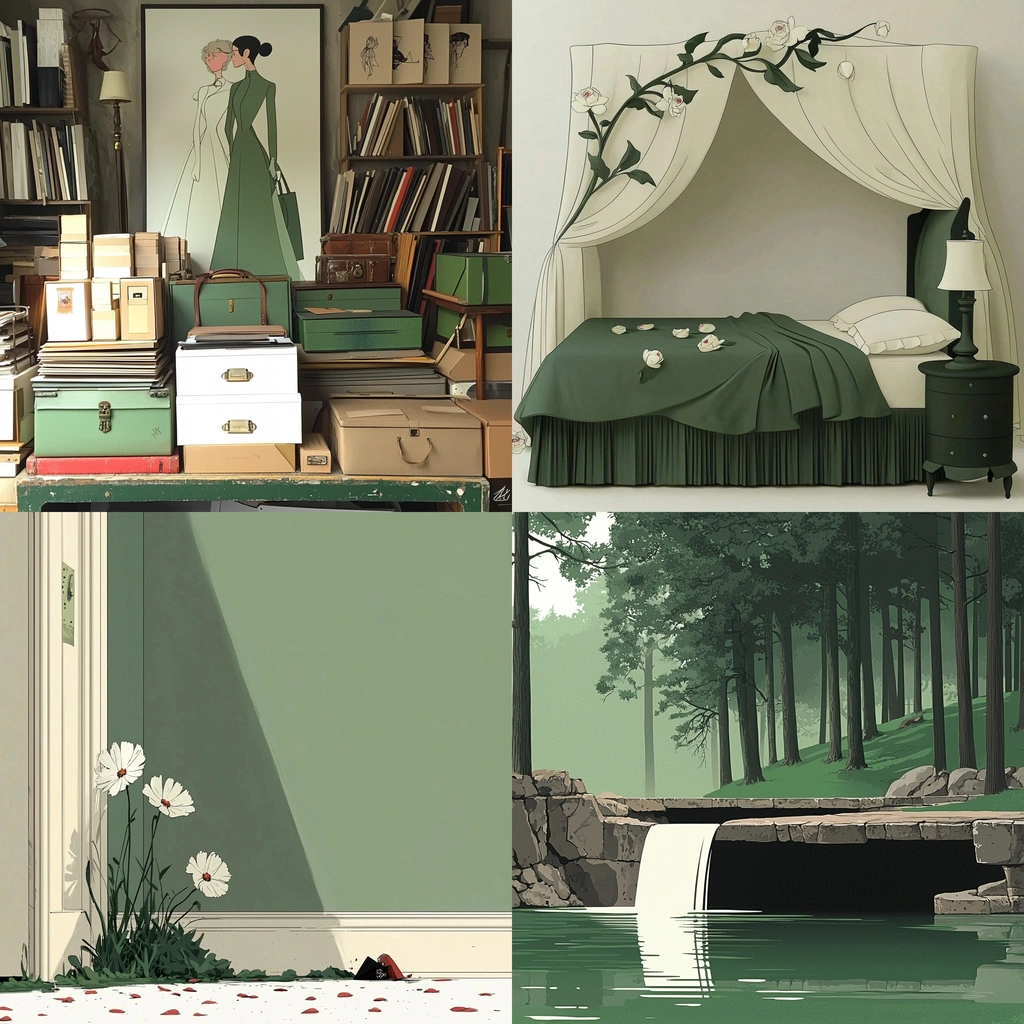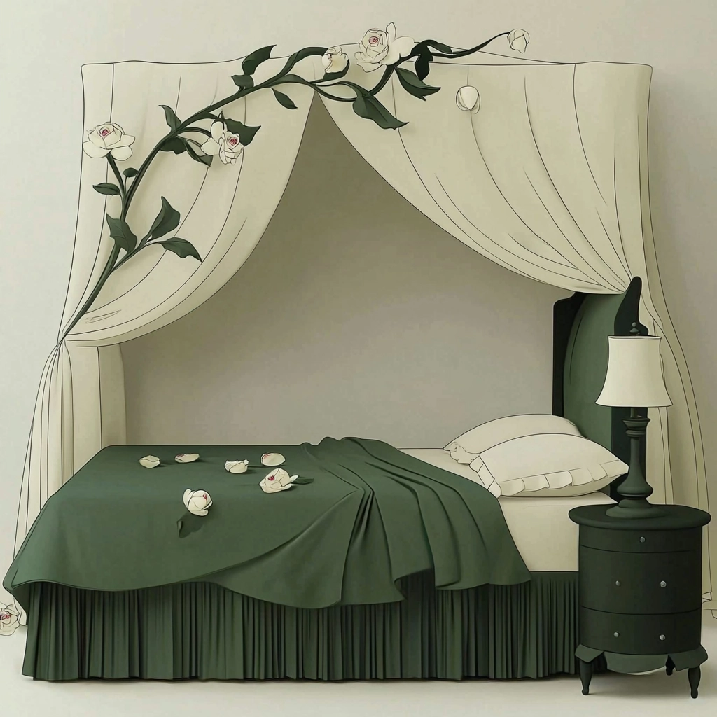 Gentle shadows and soft lighting enhance the muted green and beige colors, providing a calm spatial perception. Textures are smooth, with fabric and greenery details enriching the visual experience.