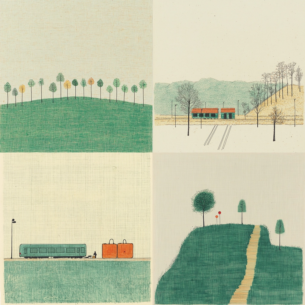 Muted colors arranged in simple, clean-lined compositions.