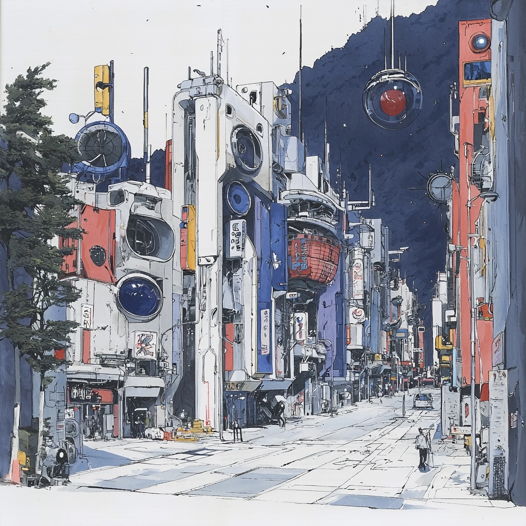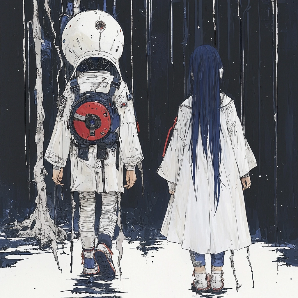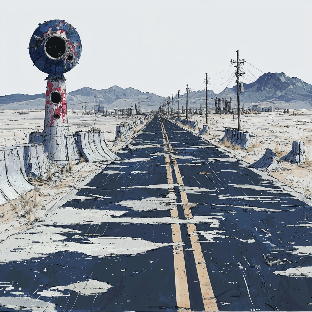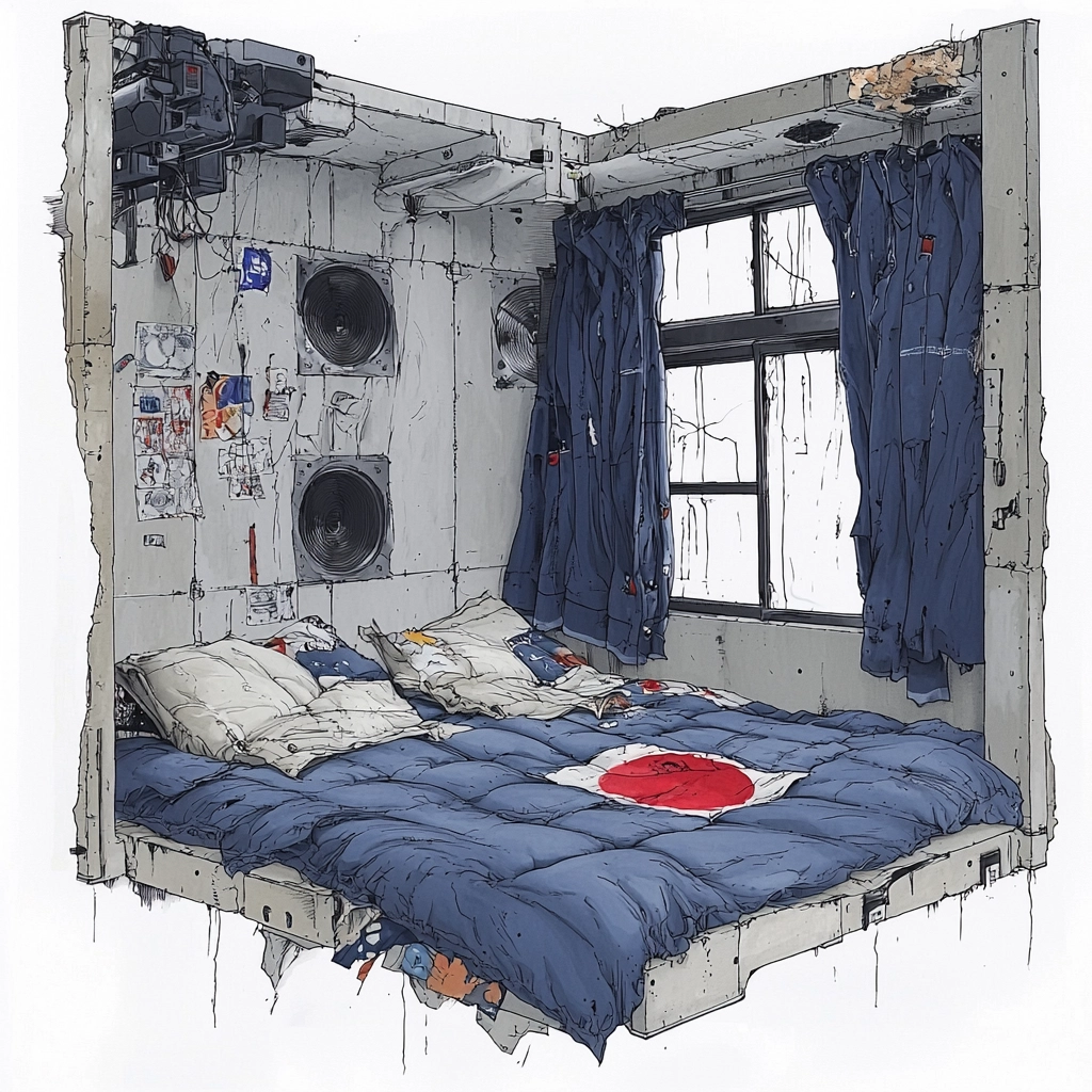 The use of lighting emphasizes strong contrast between dark and light elements, enhancing depth. Dark blue is given prominence with strategic red highlights, adding sharp visual tension against soft whites. Textural elements offer a rugged, industrialized feel.