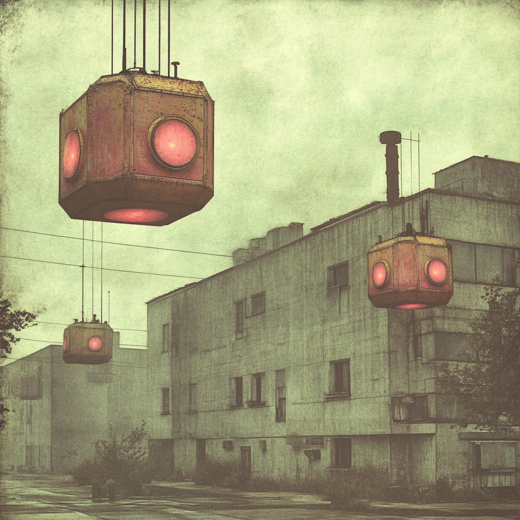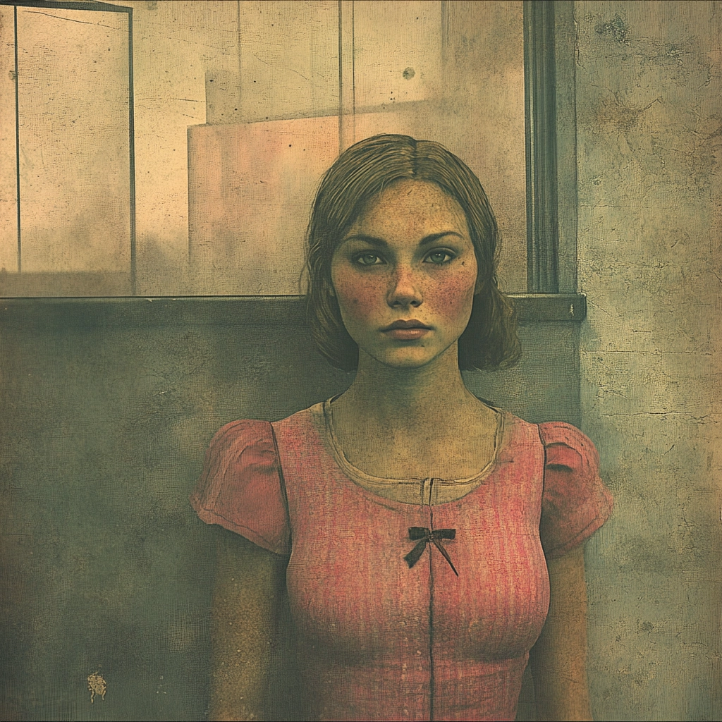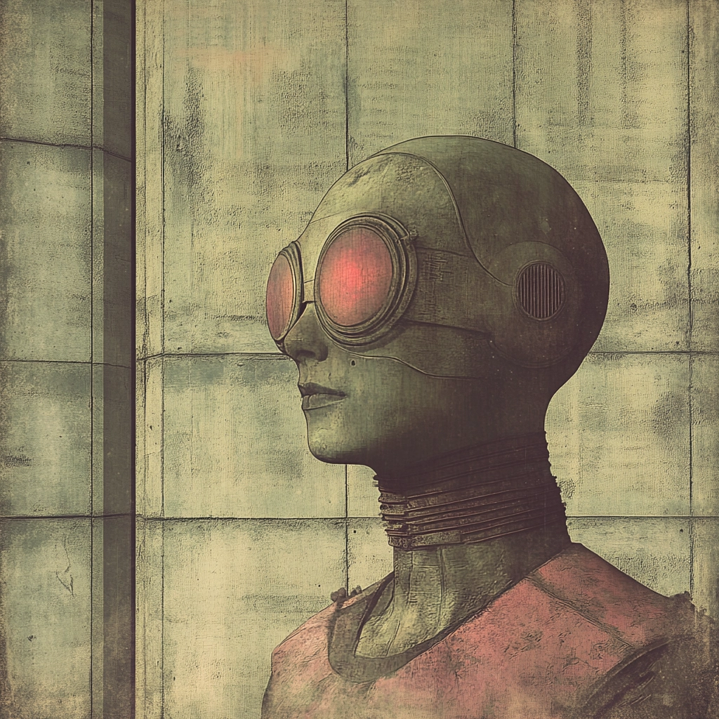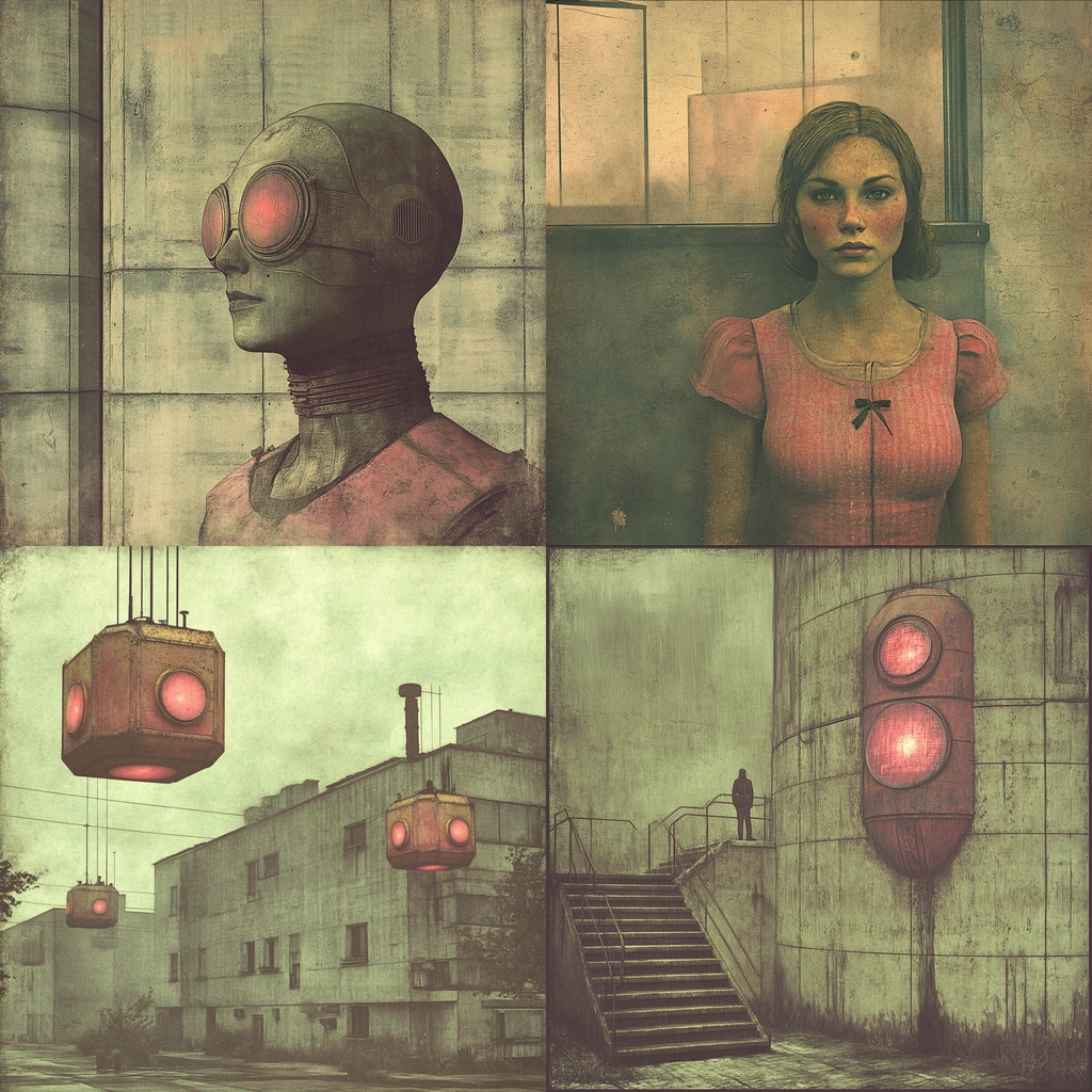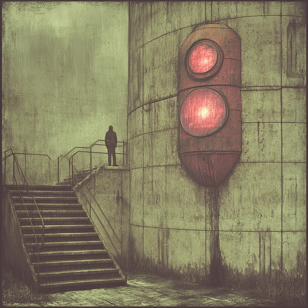 Soft lighting creates a diffused effect, with the green and pink hues adding an unsettling contrast. The composition uses geometric structures, generating an intriguing spatial depth.