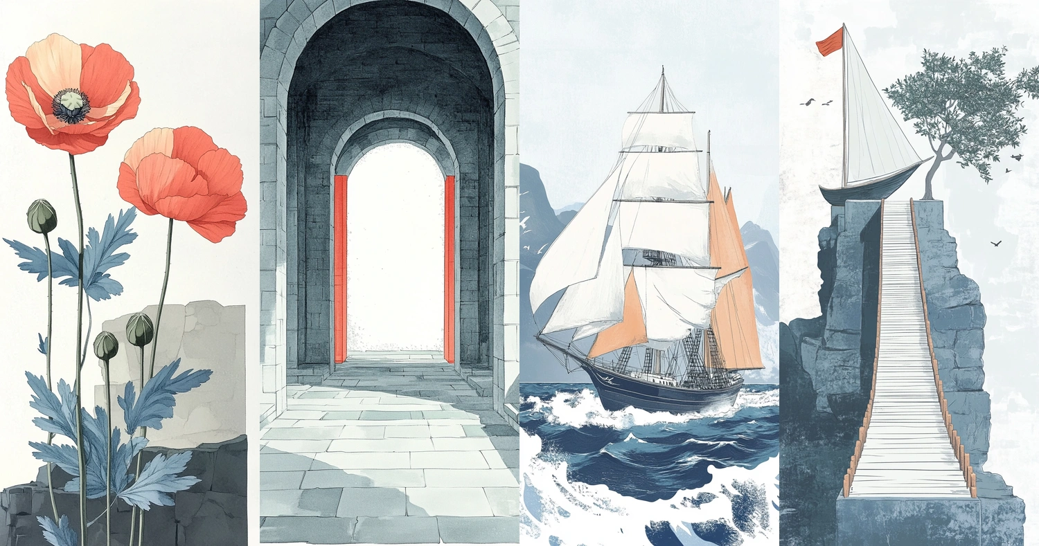 Soft lighting enhances gentle color gradients, providing depth and dimension. The use of muted blues and whites with a sparse, airy feel introduces a sense of vast space. Subtle textures convey natural elements.