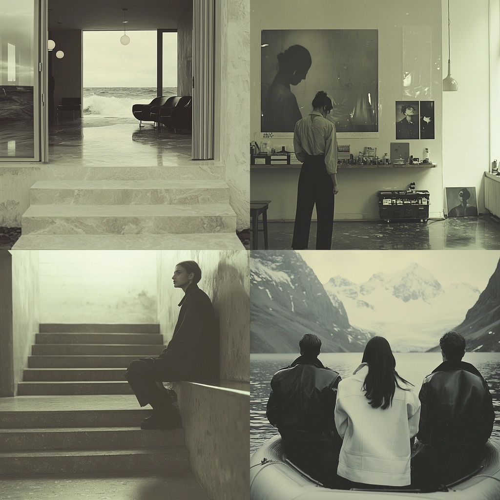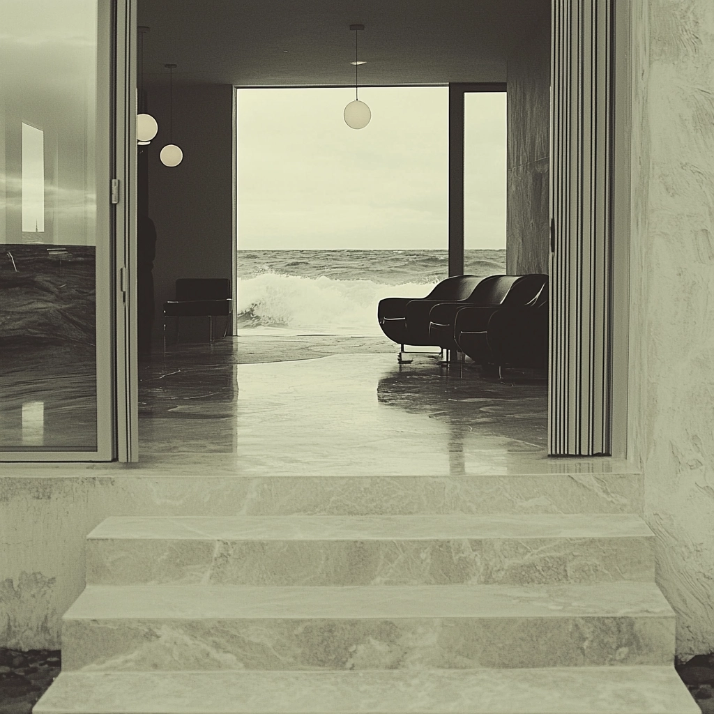 The lighting is gentle and diffused, allowing muted tones to create a serene atmosphere. Spatial arrangements emphasize vast, open spaces with a calm, contemplative quality. Textures are smooth and refined, adding to the understated elegance.