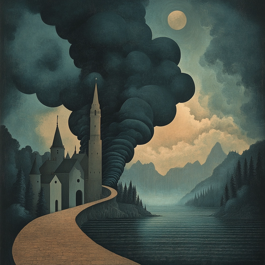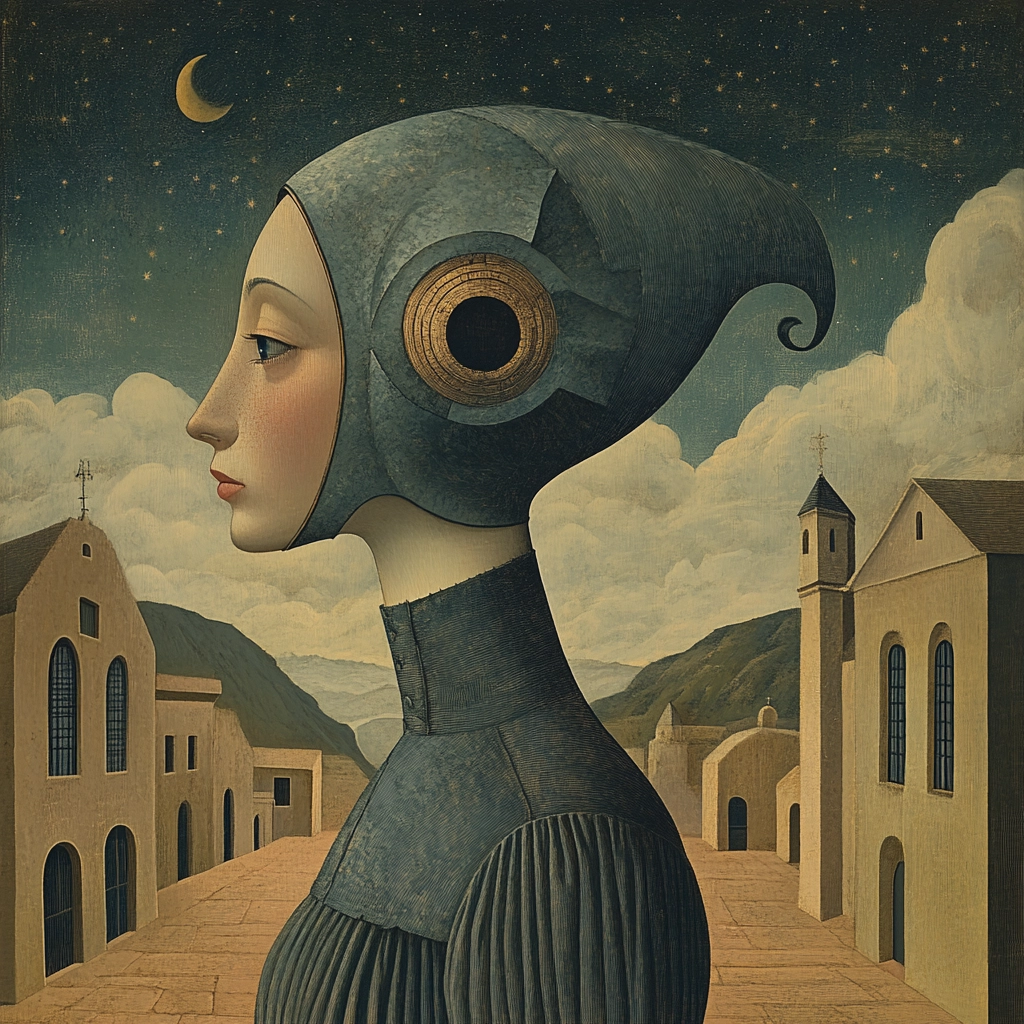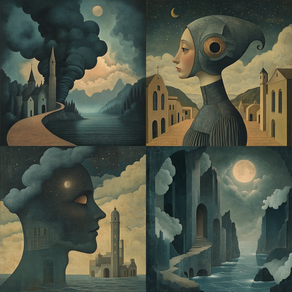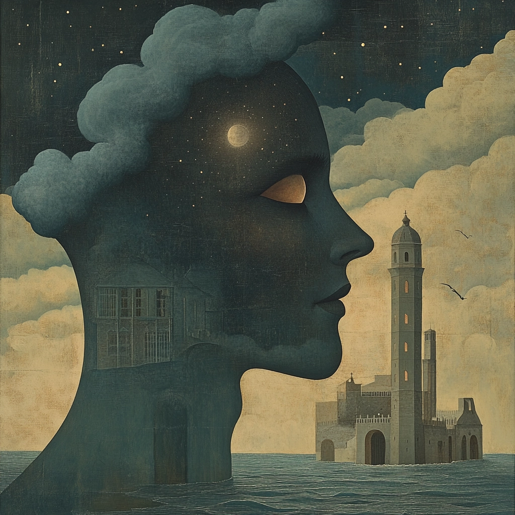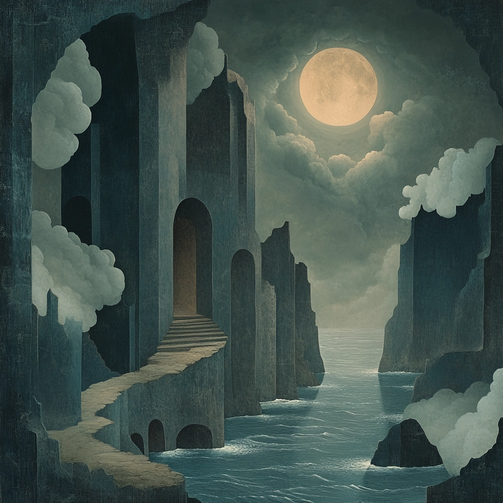 Dim lighting creates gentle contrasts, emphasizing a muted yet rich tonal range. Soft textures subtly evoke depth, while the spatial arrangement draws focus to architectural elements and open skies.