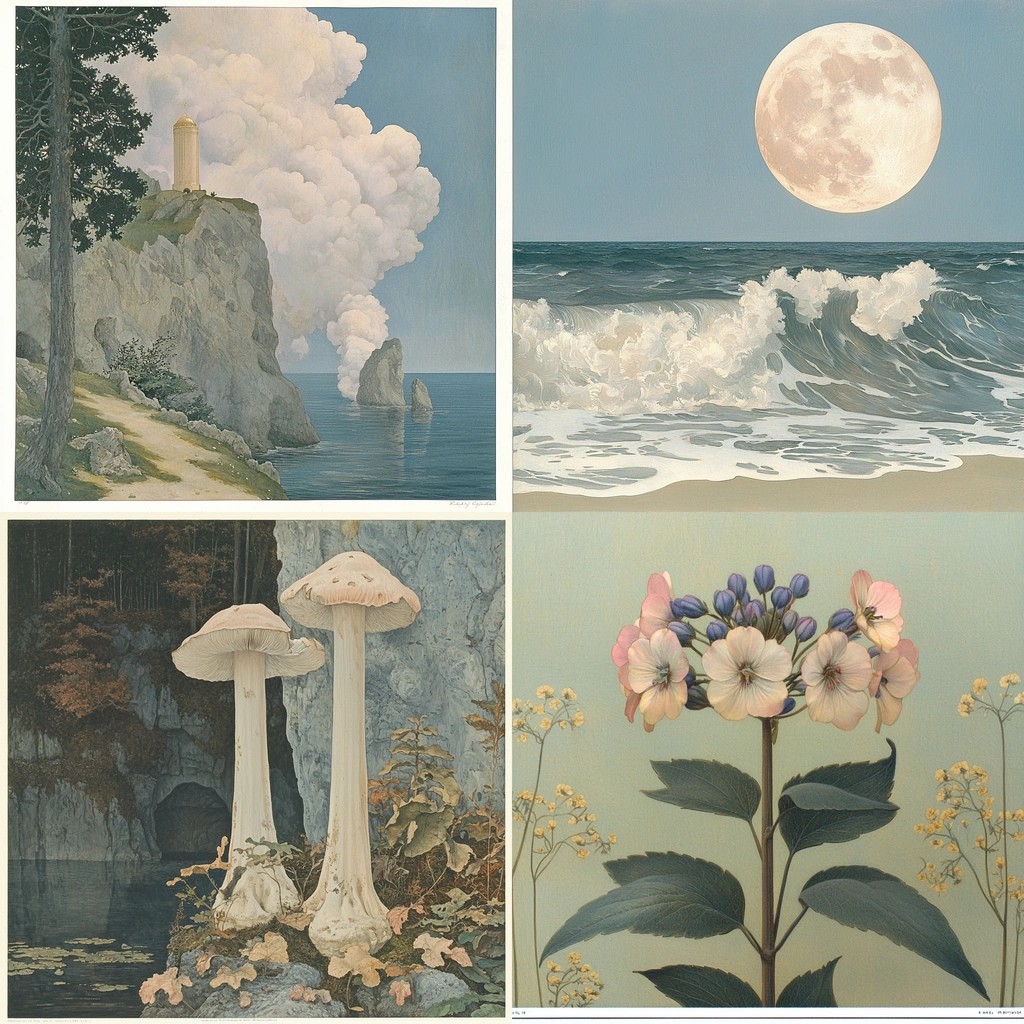 The gentle lighting softly illuminates each scene, highlighting layered textures and tonal depth. Colors are muted and harmonious, with a realistic spatial arrangement adding depth to each element.