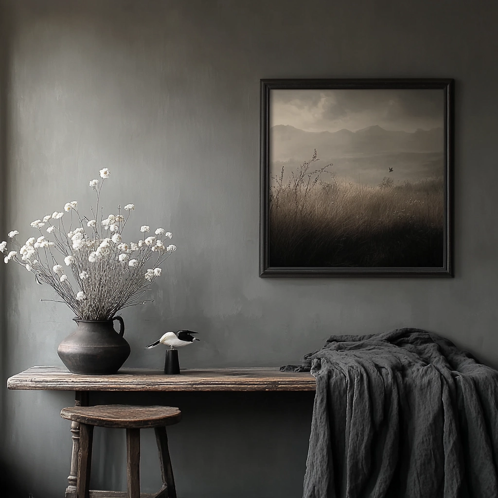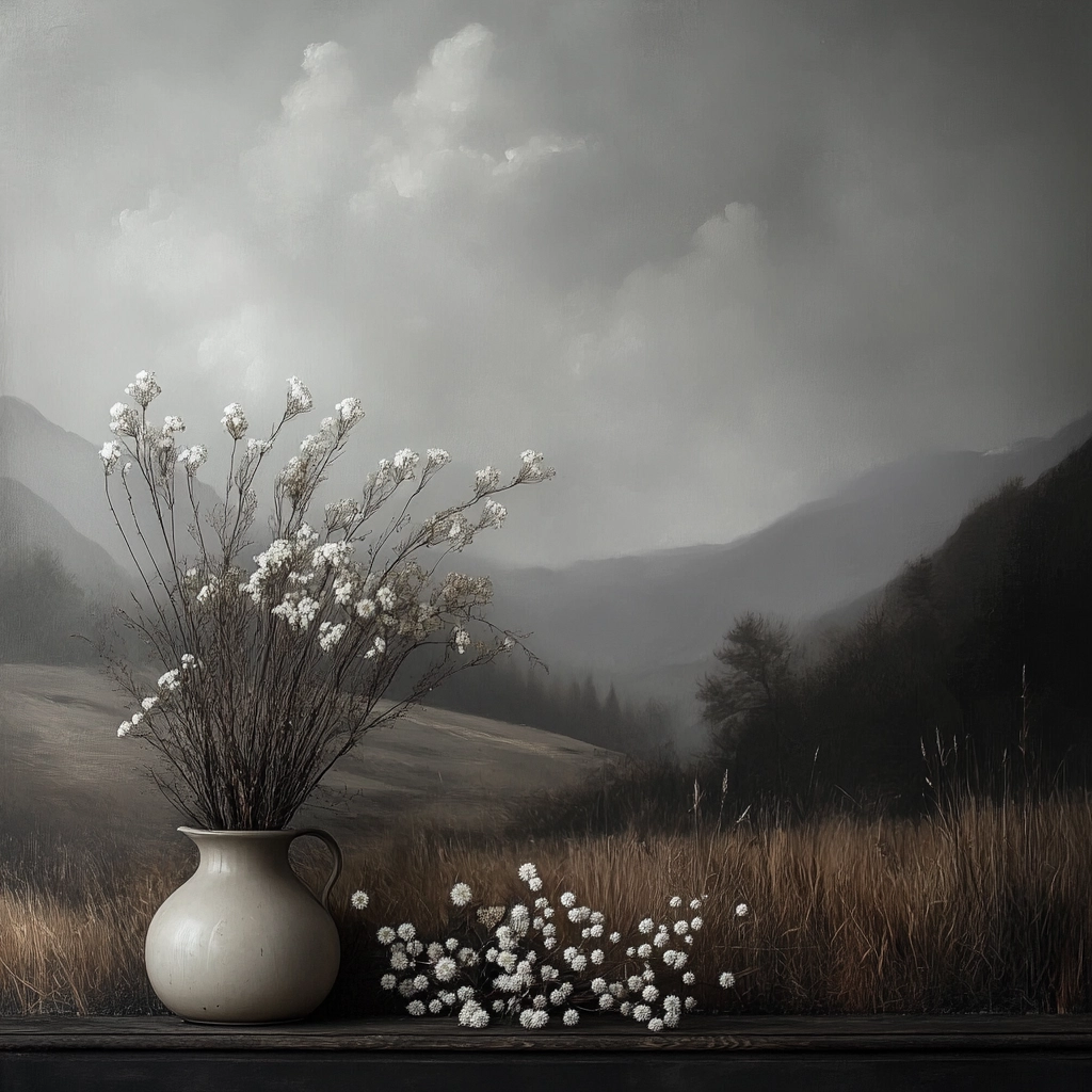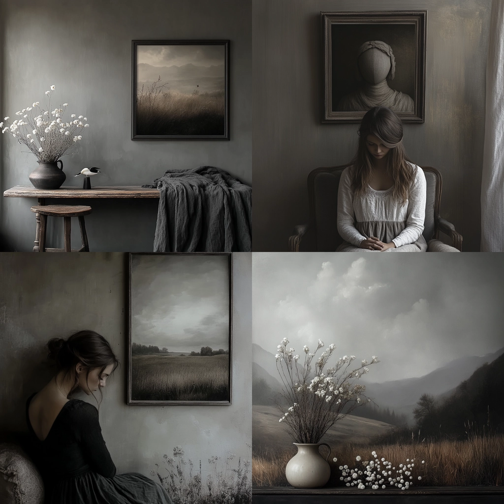 The use of soft, diffuse lighting enhances a sense of subtlety and muted realism. Earthy tones of brown and gray dominate the palette, while the application of delicate textures gives the surfaces a tactile, almost palpable feel. The spatial composition is mostly horizontal, directing focus to the serene landscapes and still-life arrangements.