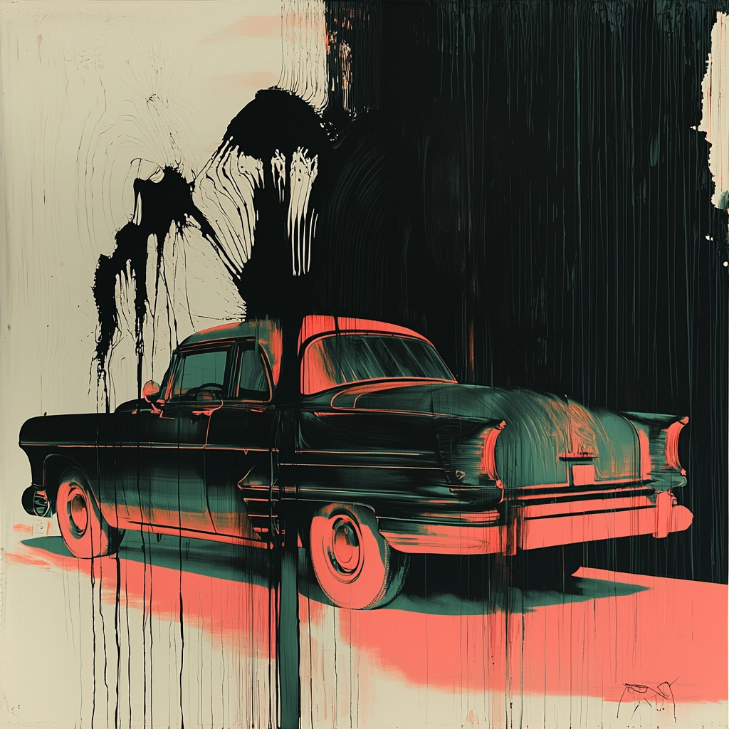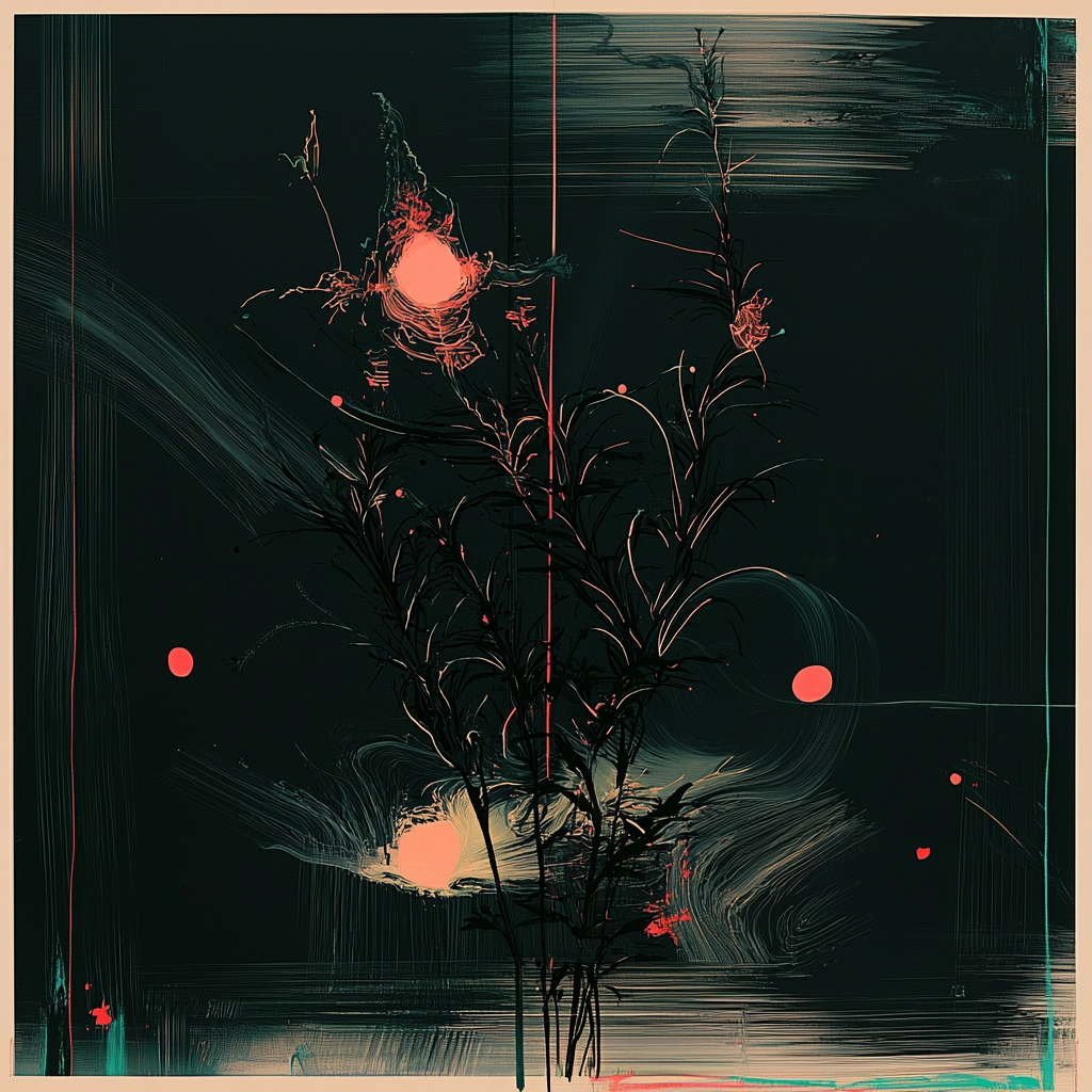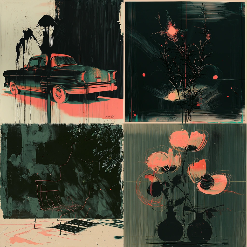 Bold contrasts of muted orange and green against deep blacks create striking compositions.