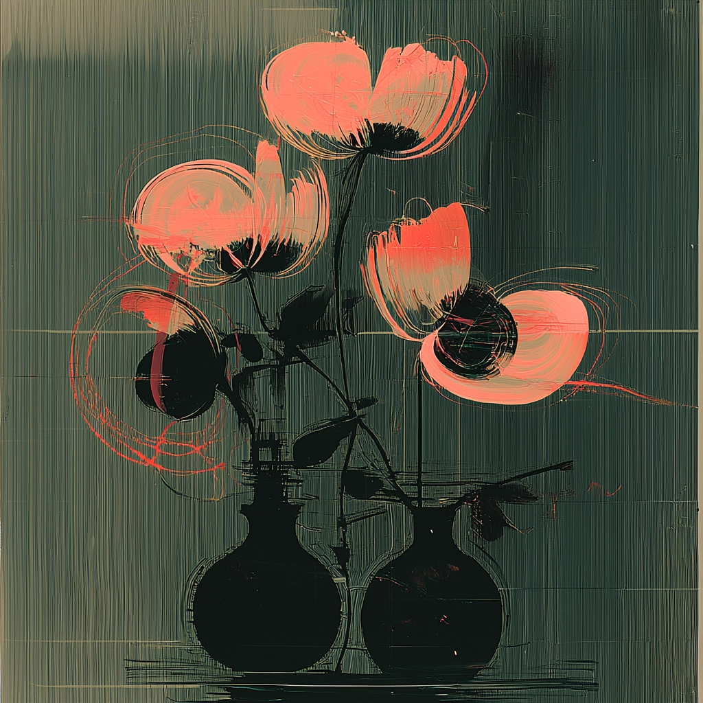 The use of diffused lighting enhances the silhouettes, offsetting them starkly against dark spaces. Colors are smooth and matte, creating a sense of depth. The spatial arrangement is calculated, with gradients subtly enhancing texture.