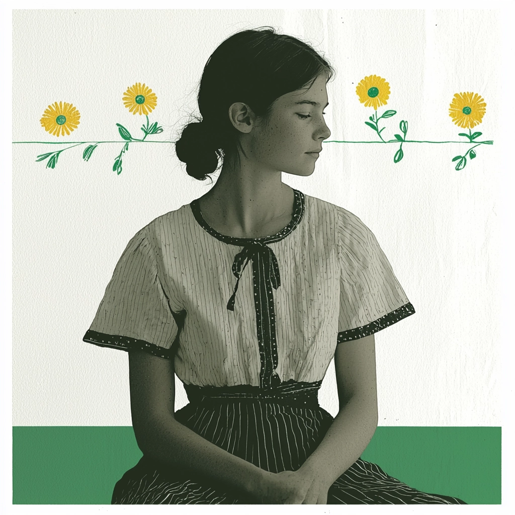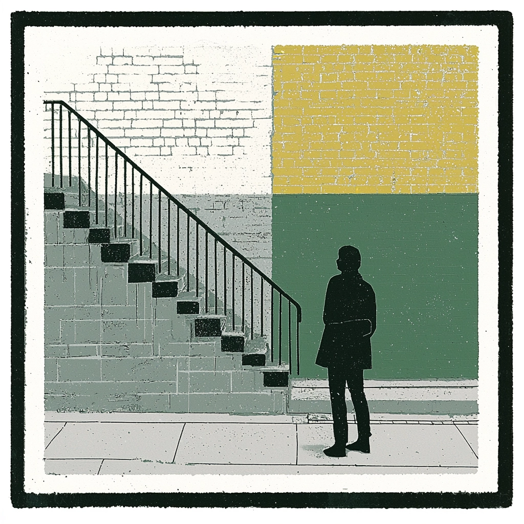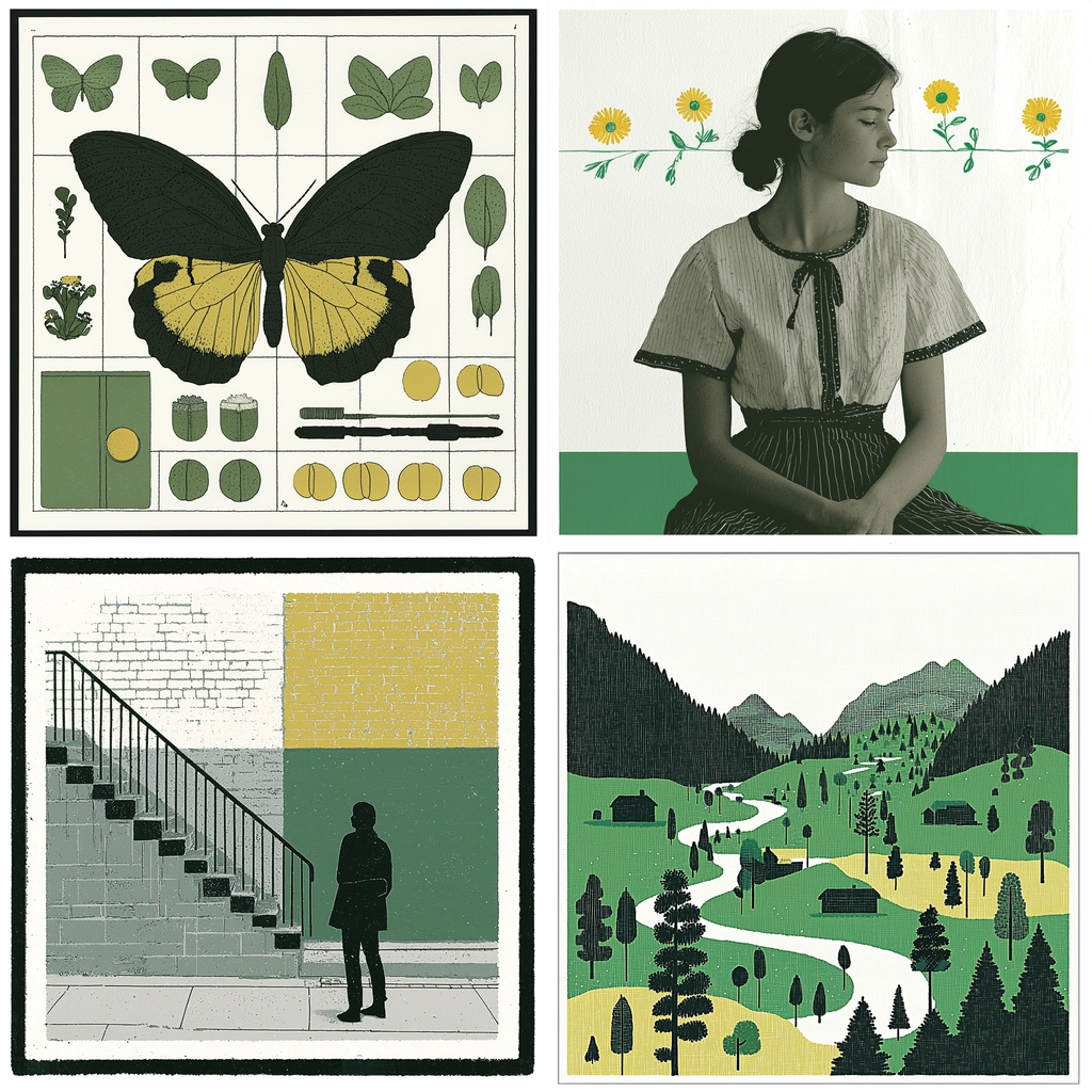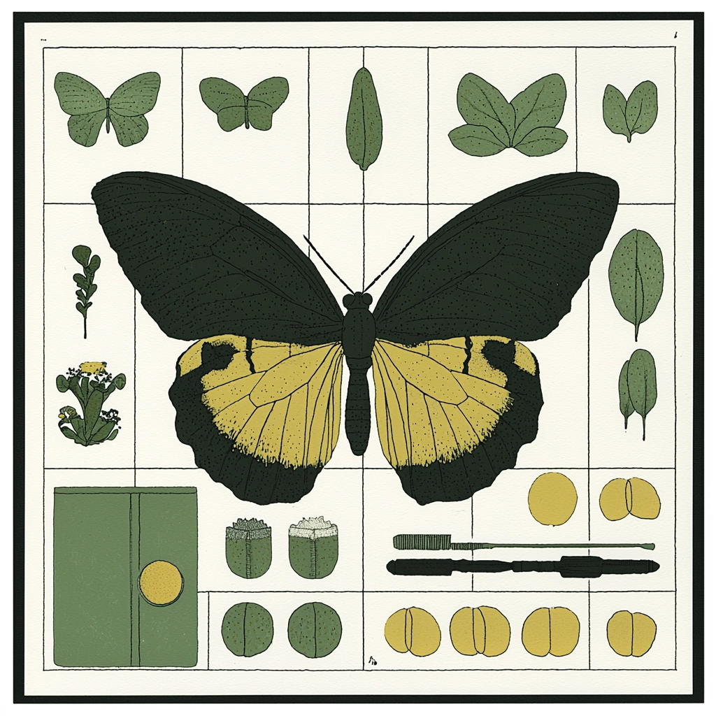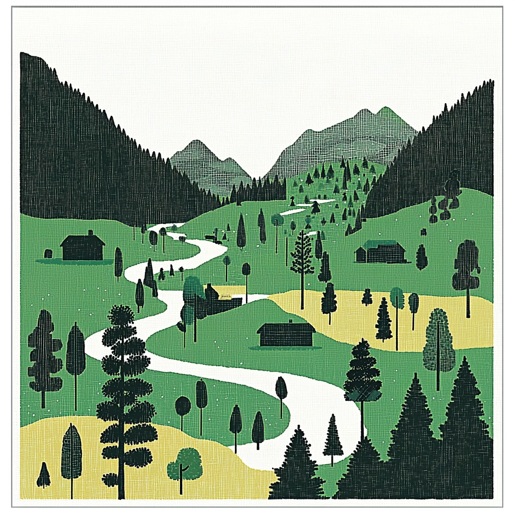 Lighting emphasizes flat, muted colors with shadows outlining forms. Spatially, the visual is evenly distributed across well-defined zones, enhancing clarity. The textures hint at soft pencil strokes and fine detailing.