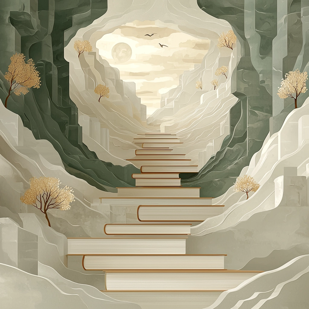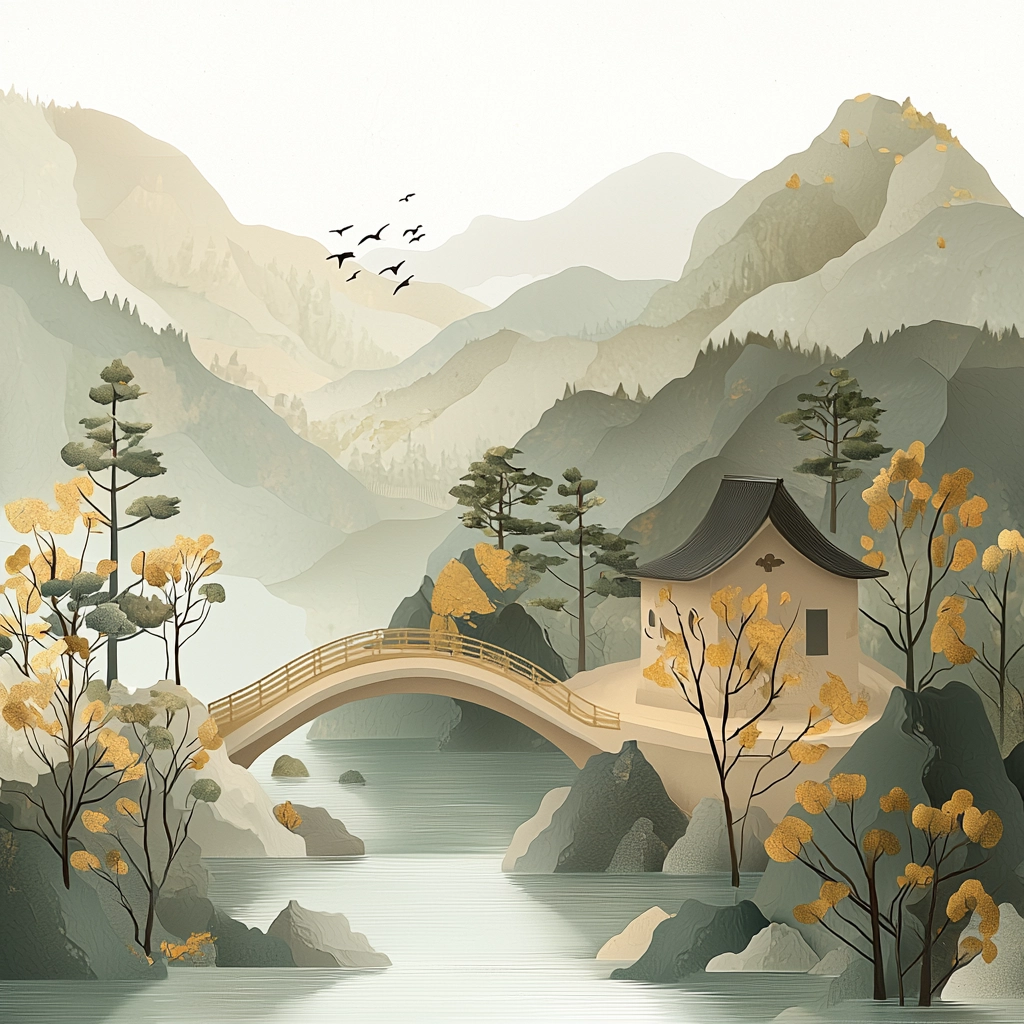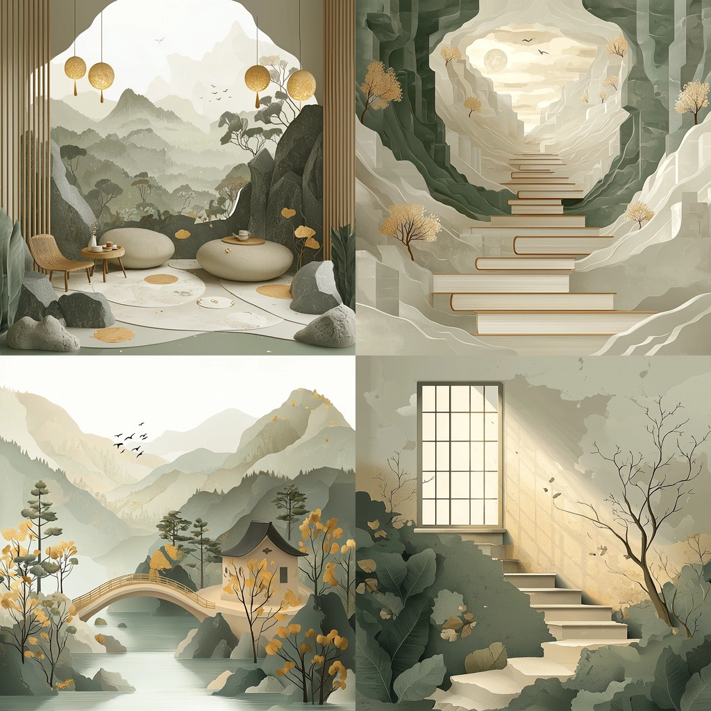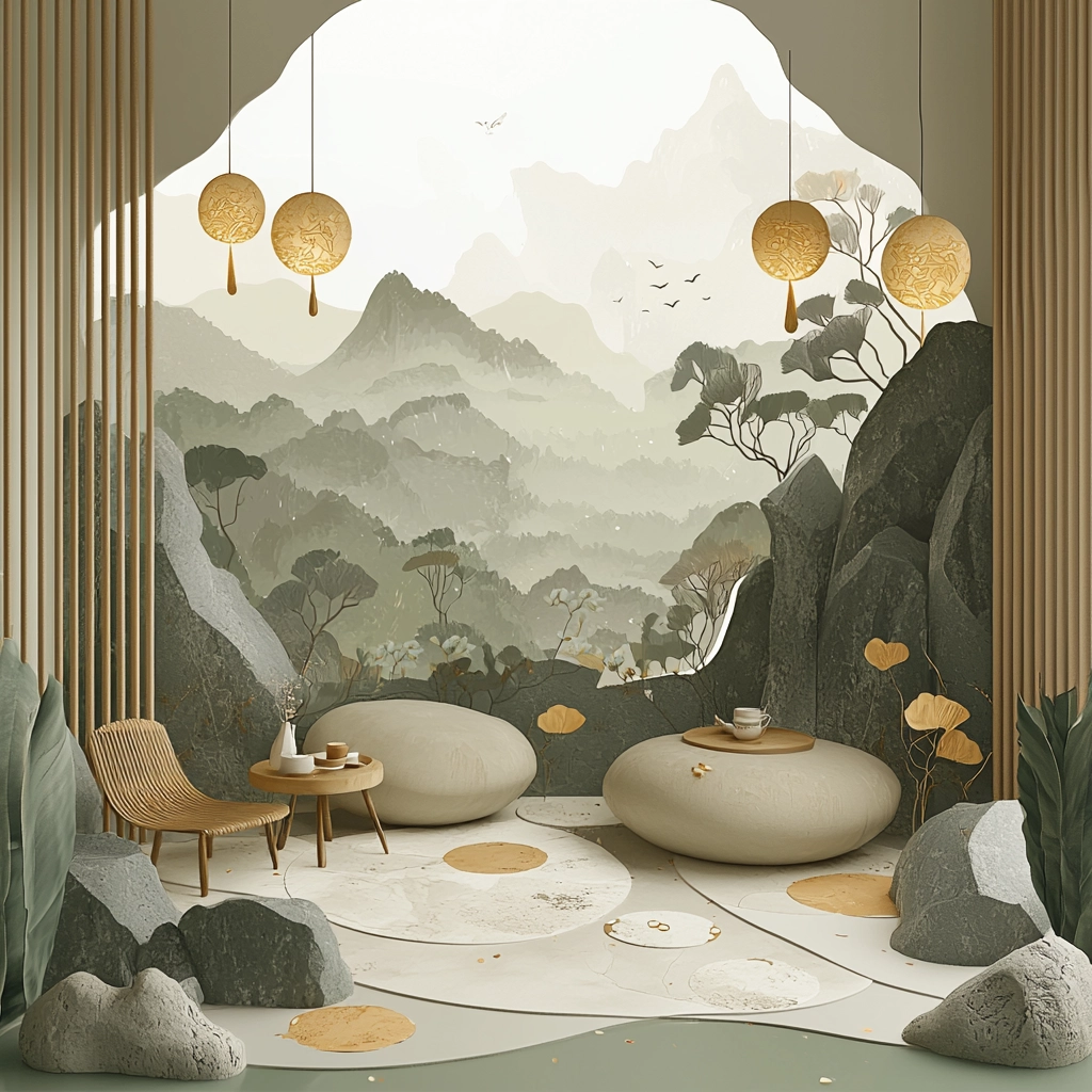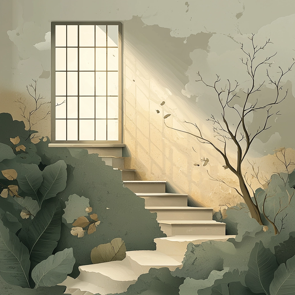 The use of subdued lighting enhances layered perspectives, while soft greens and golds blend gently against a beige background. The gentle variation in textures gives a tactile sense, emphasizing serene depth and clarity.