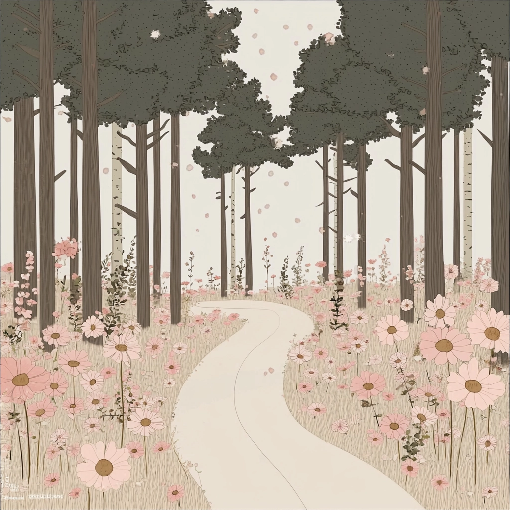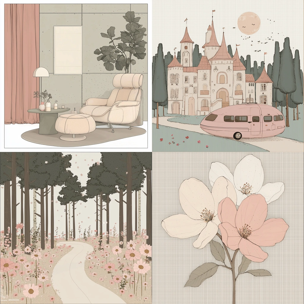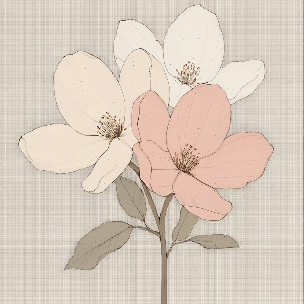 Soft pastel tones with delicate compositions and balanced forms.