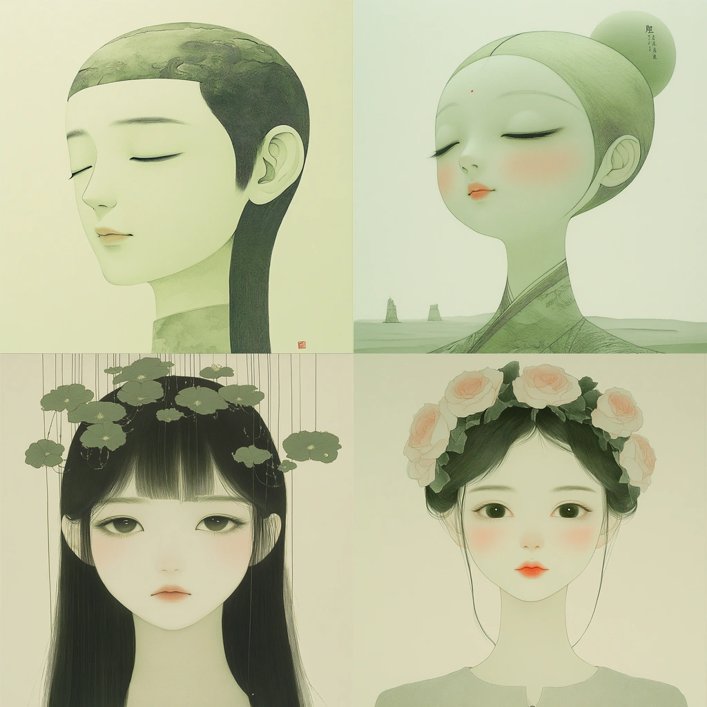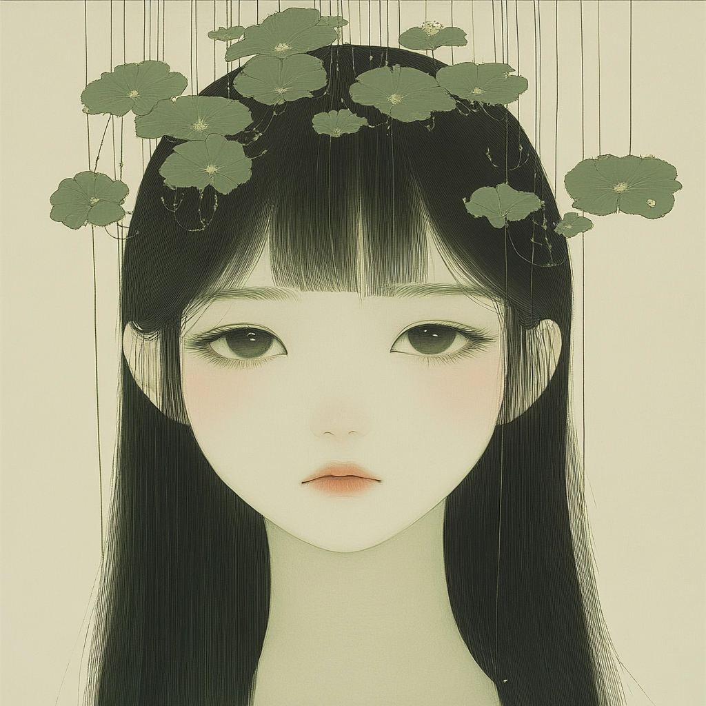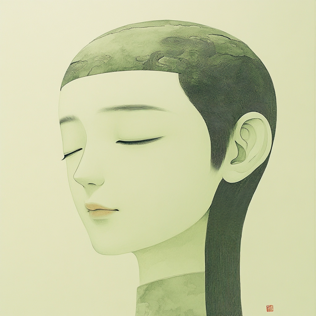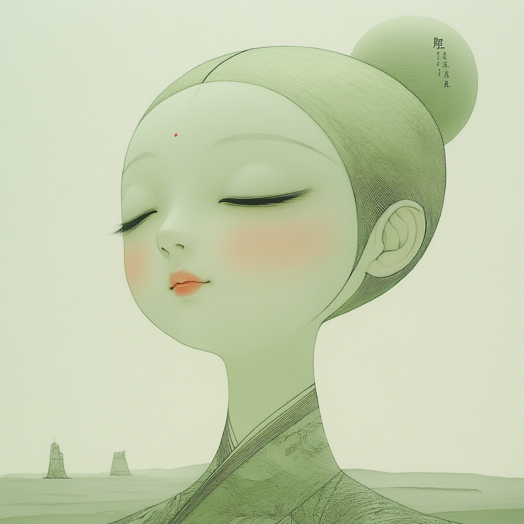 The composition features muted pastel tones and minimalist form with subtle, intricate outlines.