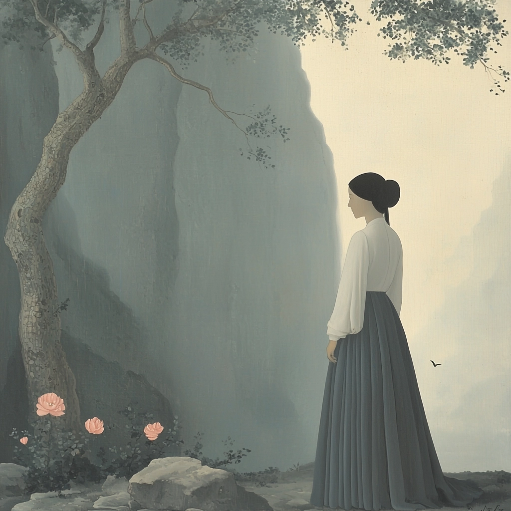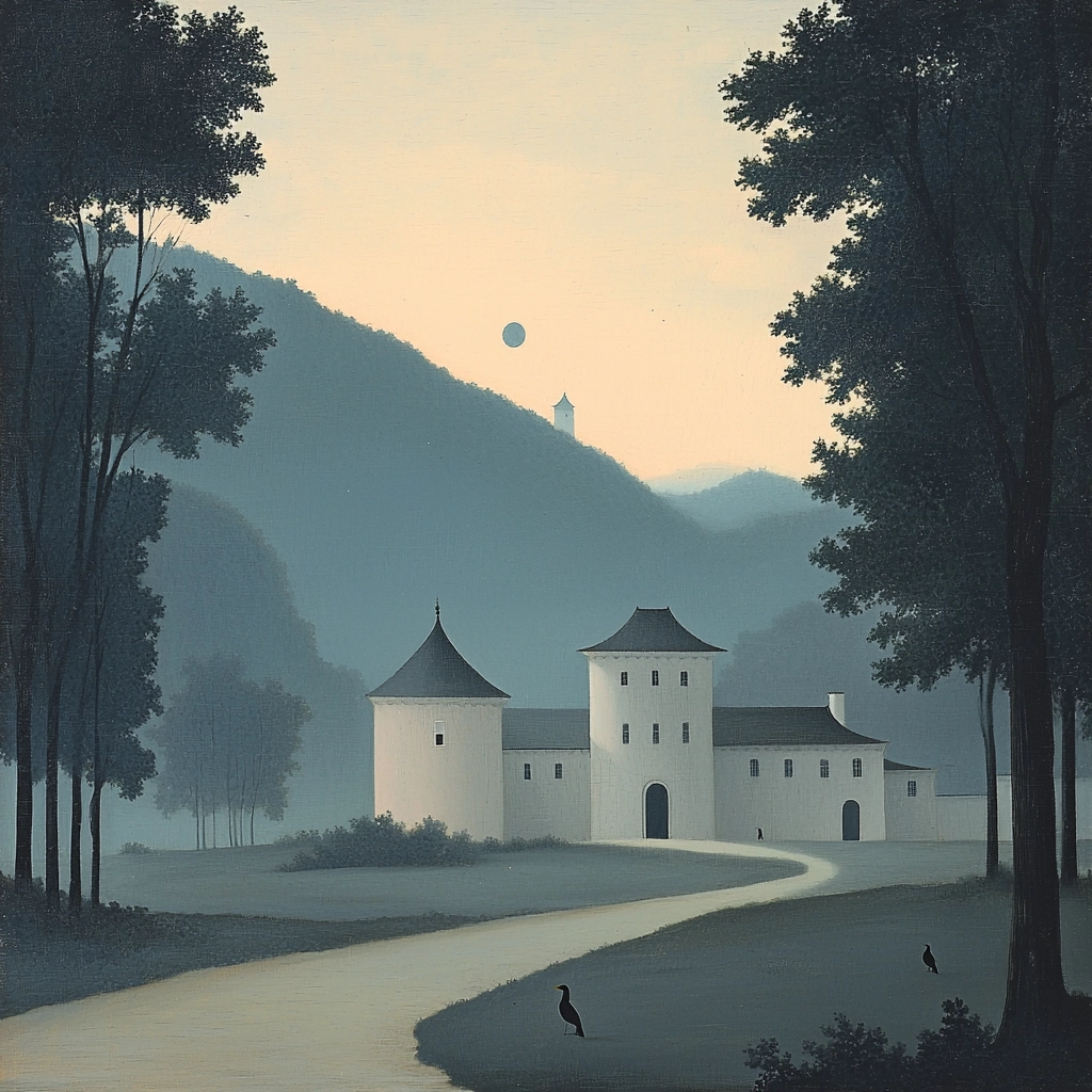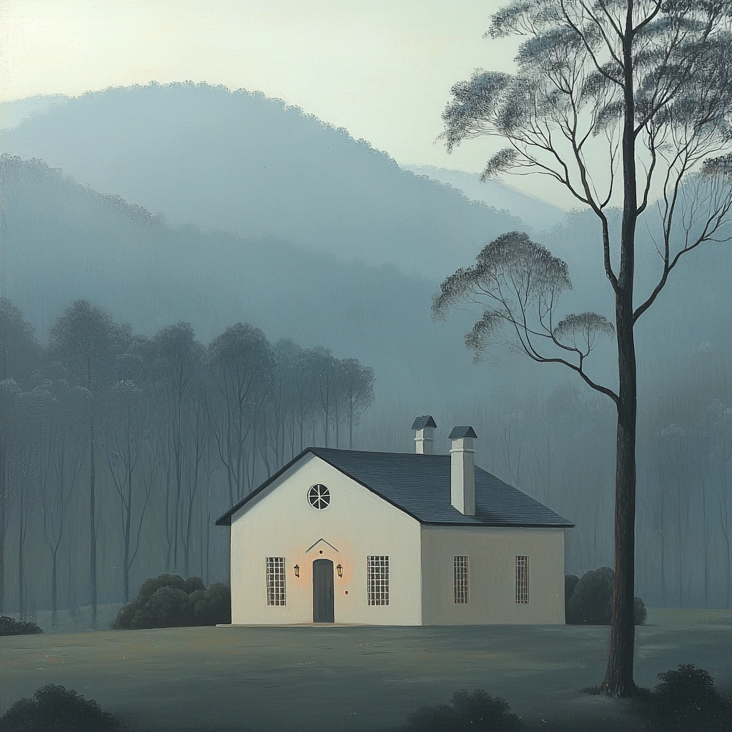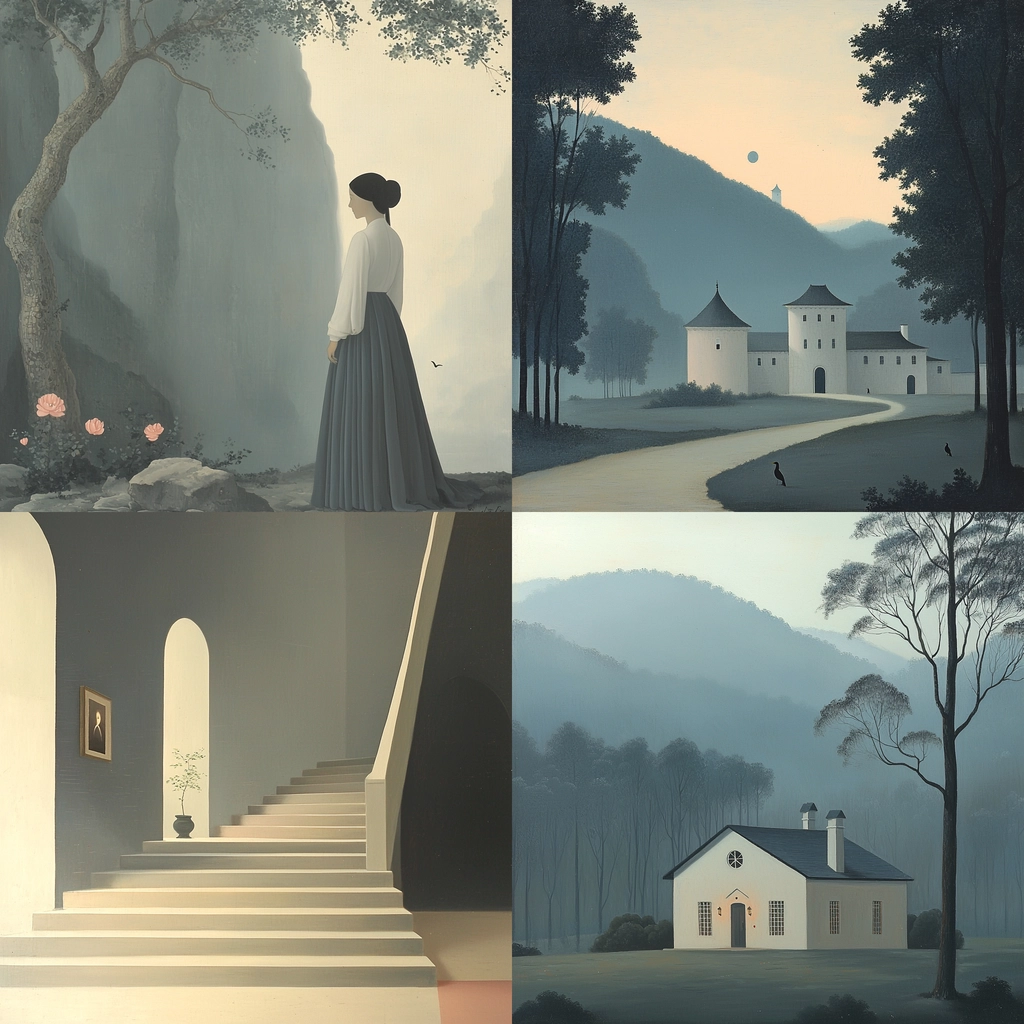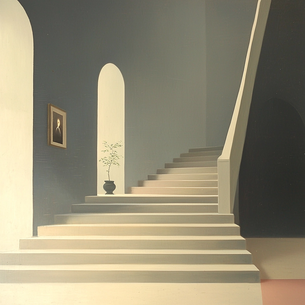 Lighting is gentle and evenly distributed, lending a subtle illumination throughout. Colors are muted, contributing to a cohesive and understated palette. Space expertly balances foreground and background elements, enhancing depth perception. Textural details are minimalist yet refined, creating an elegant surface quality.