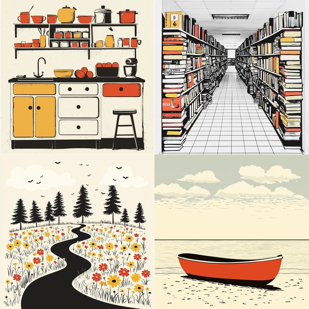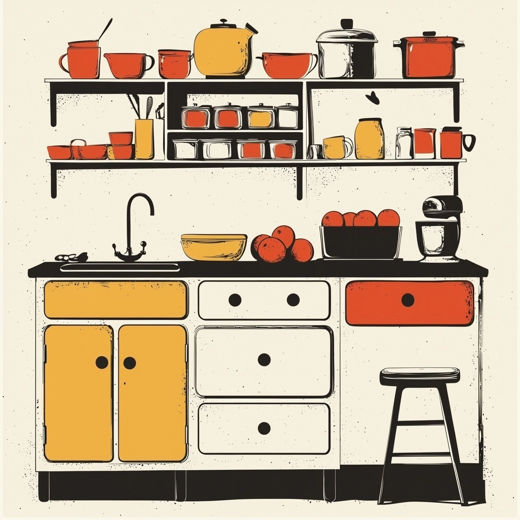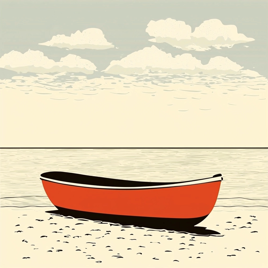Lighting is minimal and even, emphasizing the flatness and outline clarity. Colors are subdued primary hues, dominated by reds and oranges against a pale backdrop. Textures are smooth and stylized.