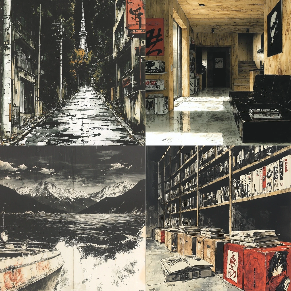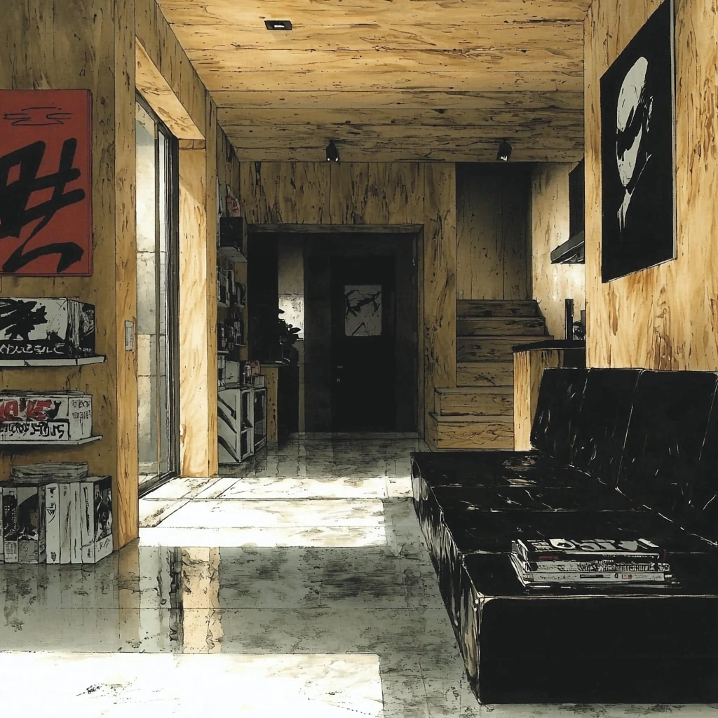 Soft lighting contrasts highlight architectural and natural settings. Muted colors create cohesion, while tactile textures emphasize material surfaces. Precise linear details add spatial depth and clarity.