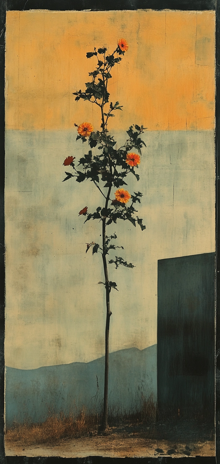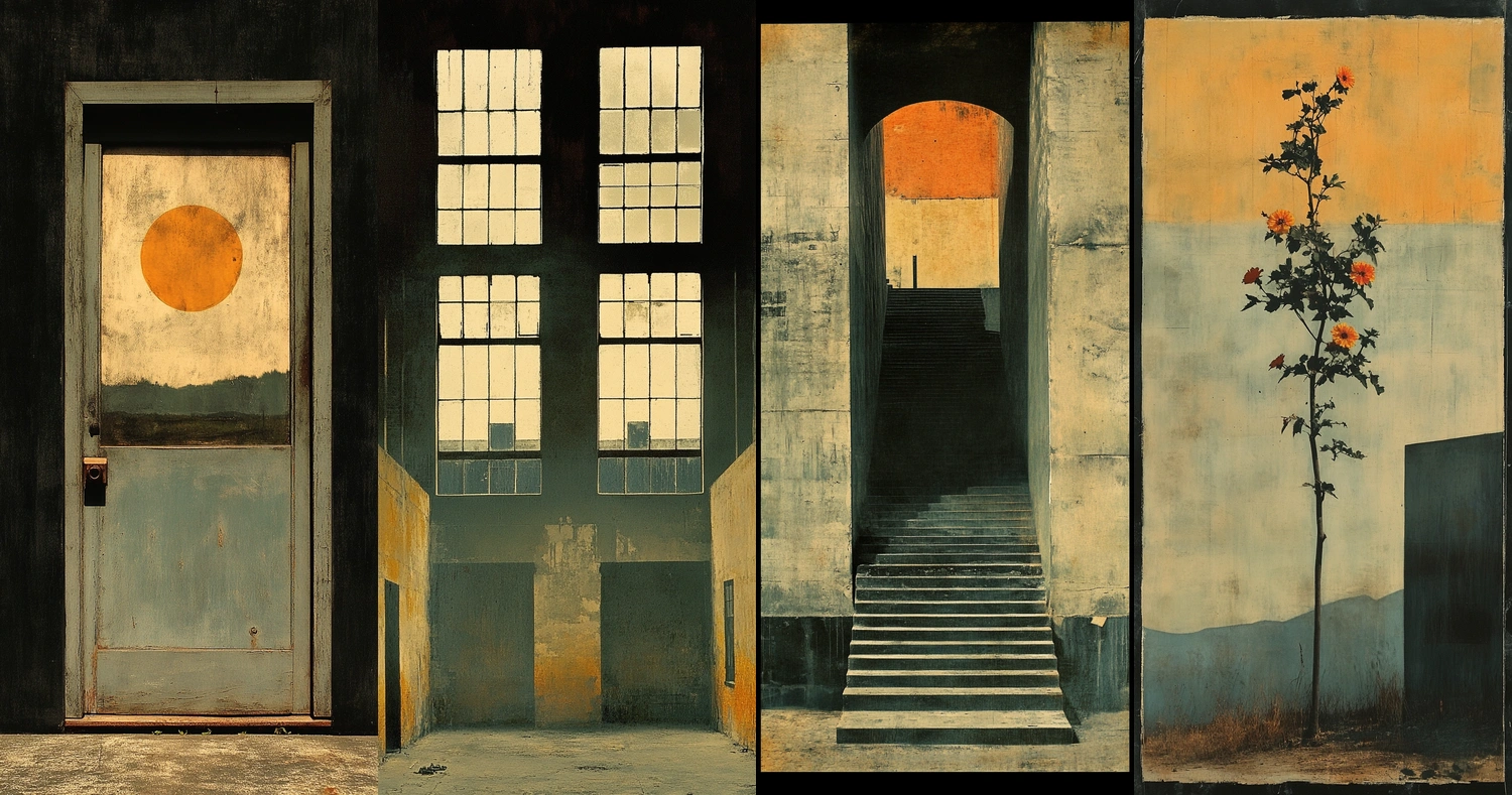 Subdued lighting highlights stark geometric forms, with contrasting muted colors emphasizing depth and structure across compositions. Textures appear worn, enhancing a sense of urban decay.