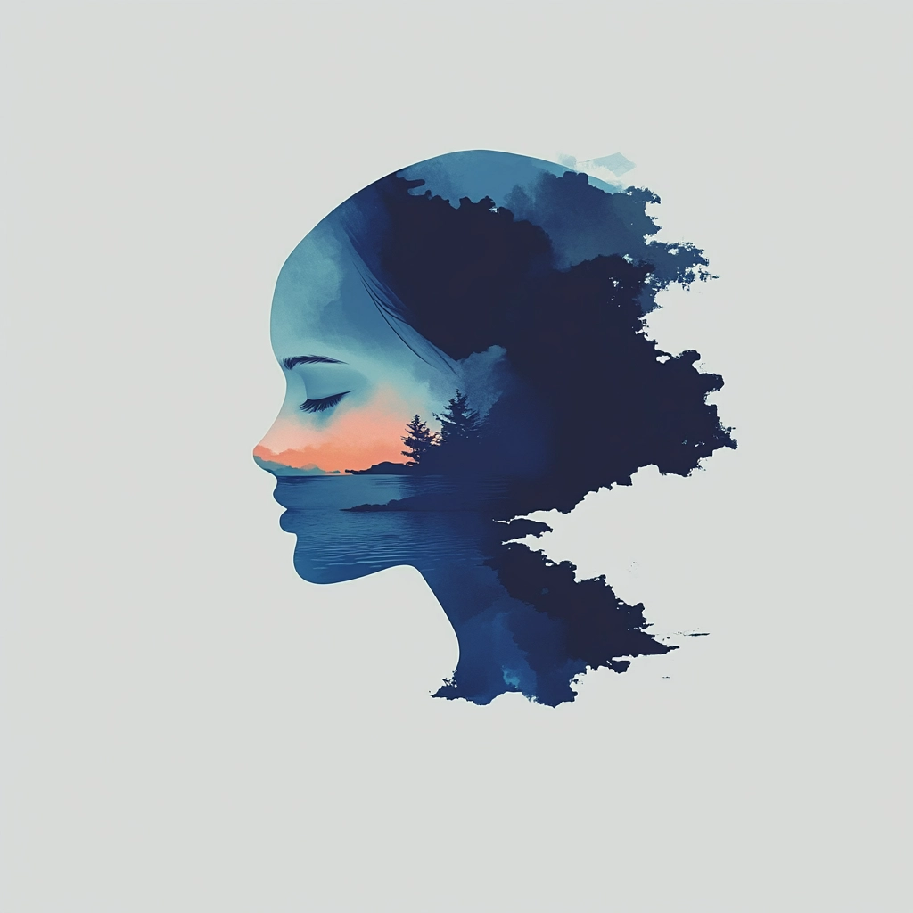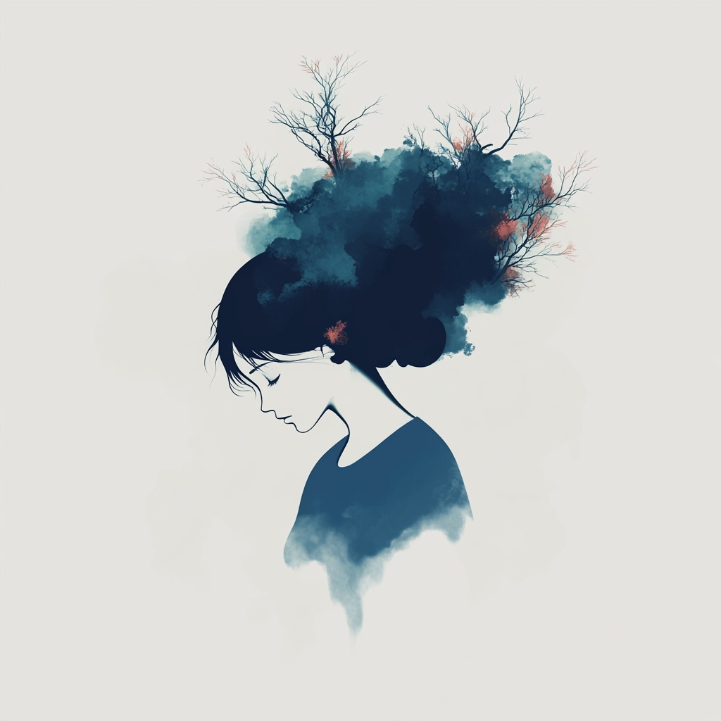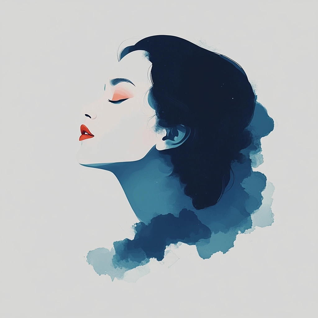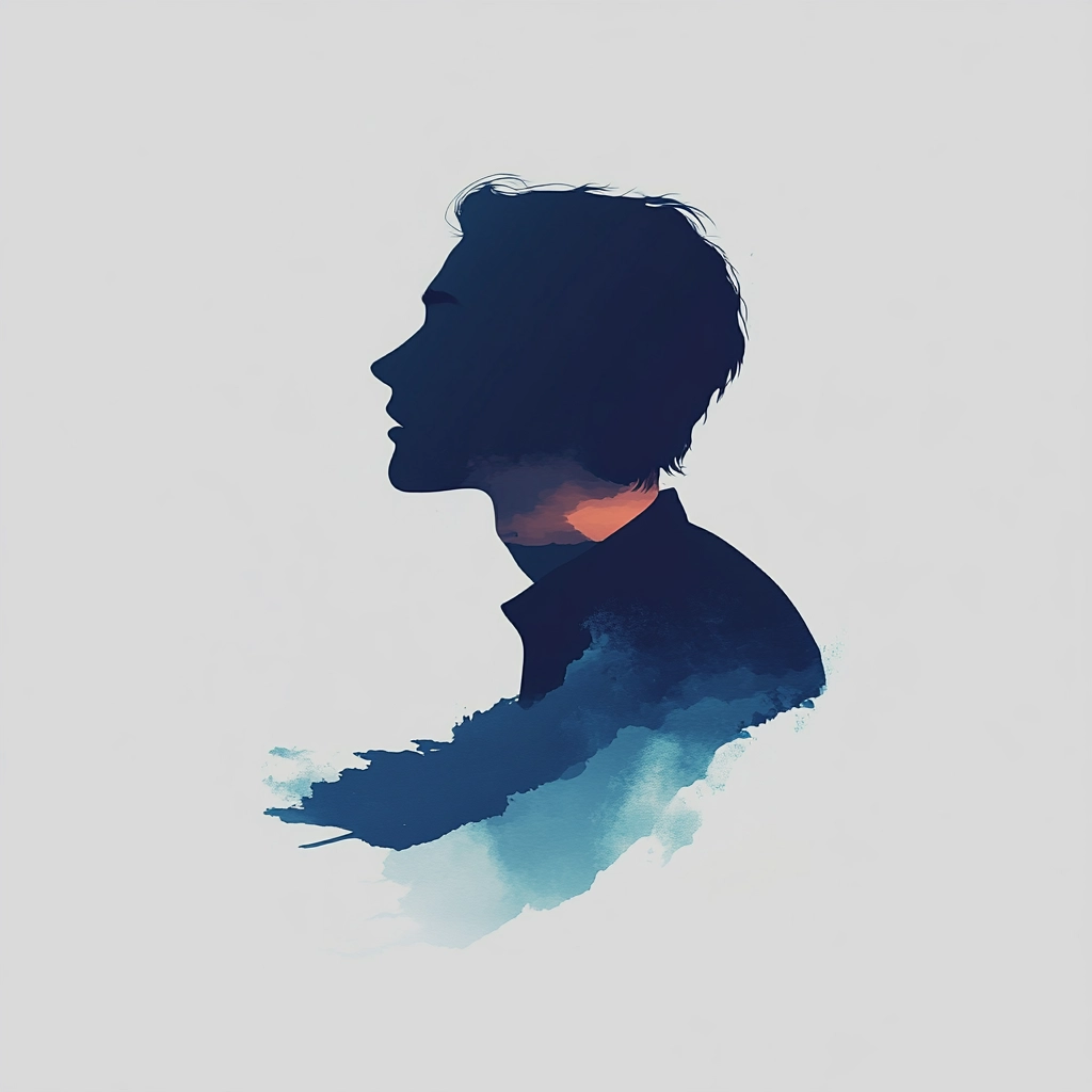 The use of watercolors creates subtle gradations that blend smoothly, while the silhouette form provides a distinct visual balance. The mix of dark and light hues enhances depth, and the use of minimal red highlights draws focus.