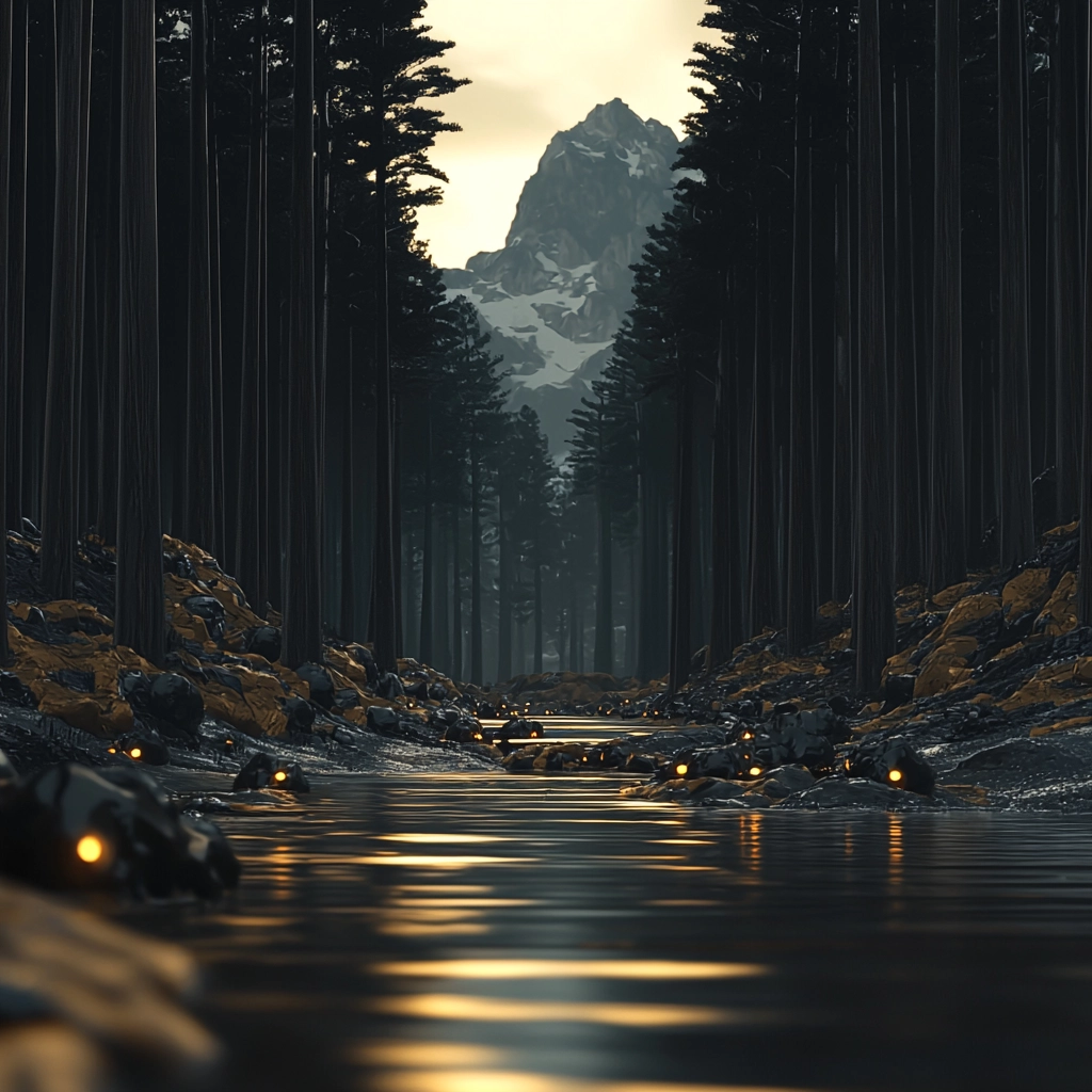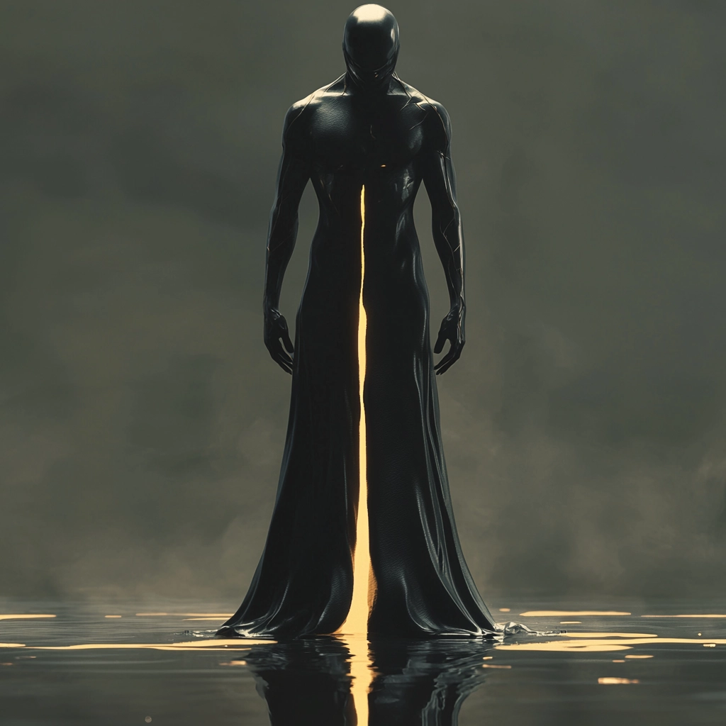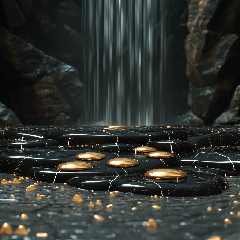 Imposing lighting casts deep shadows contrasted by gleaming gold accents. Texture is slick and fluid, amplifying reflections, while shadows deepen spatial perception and direct focus.