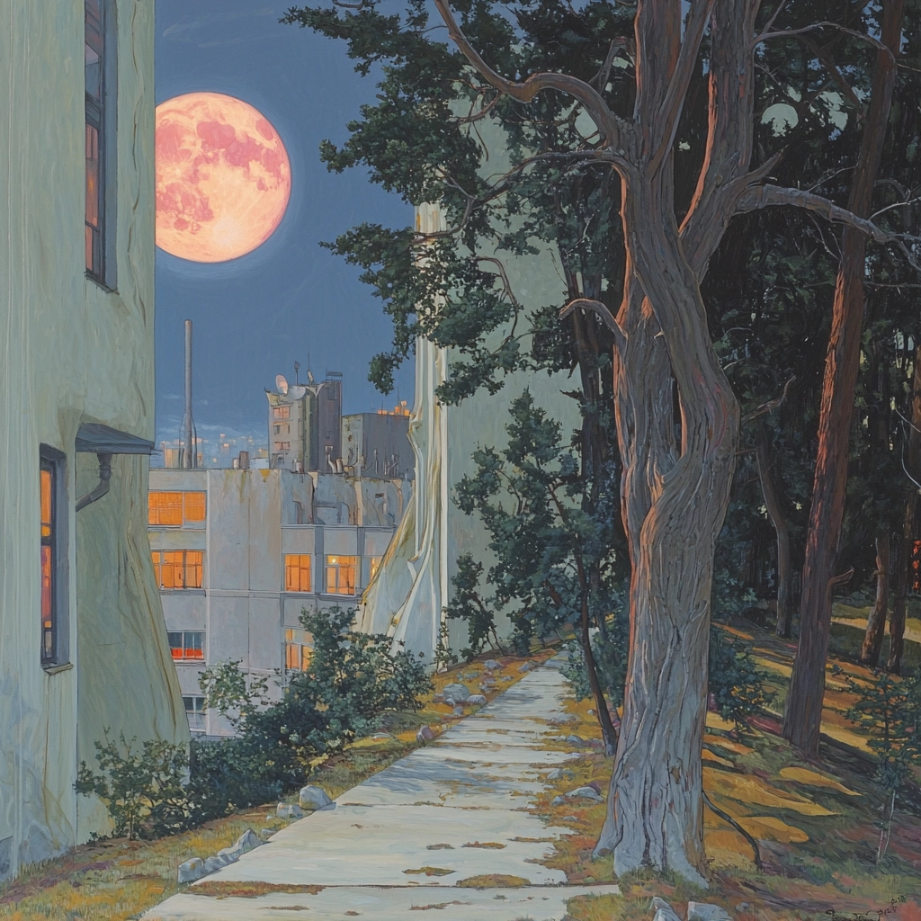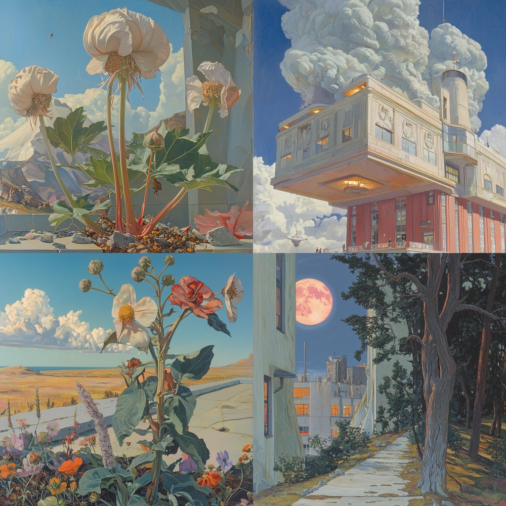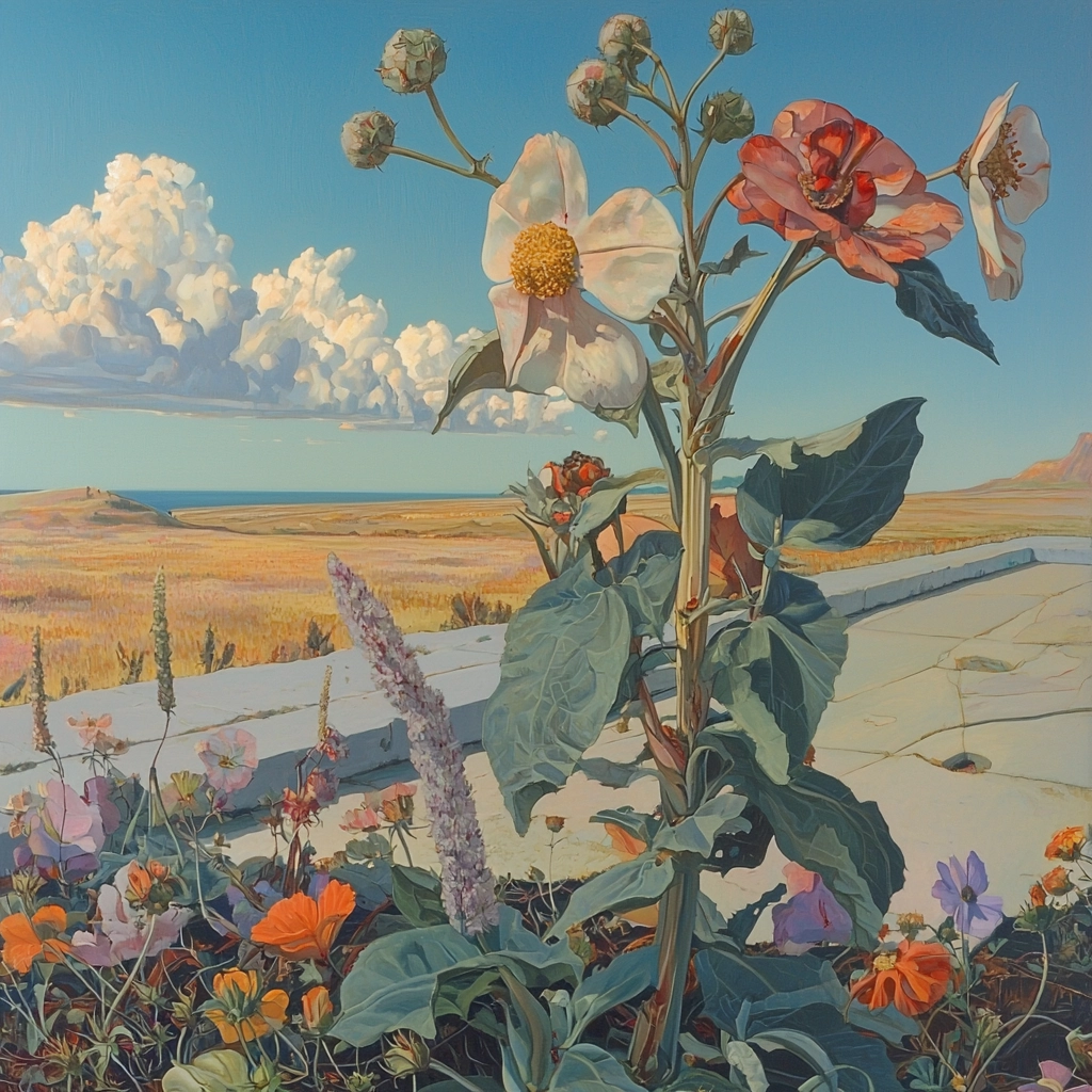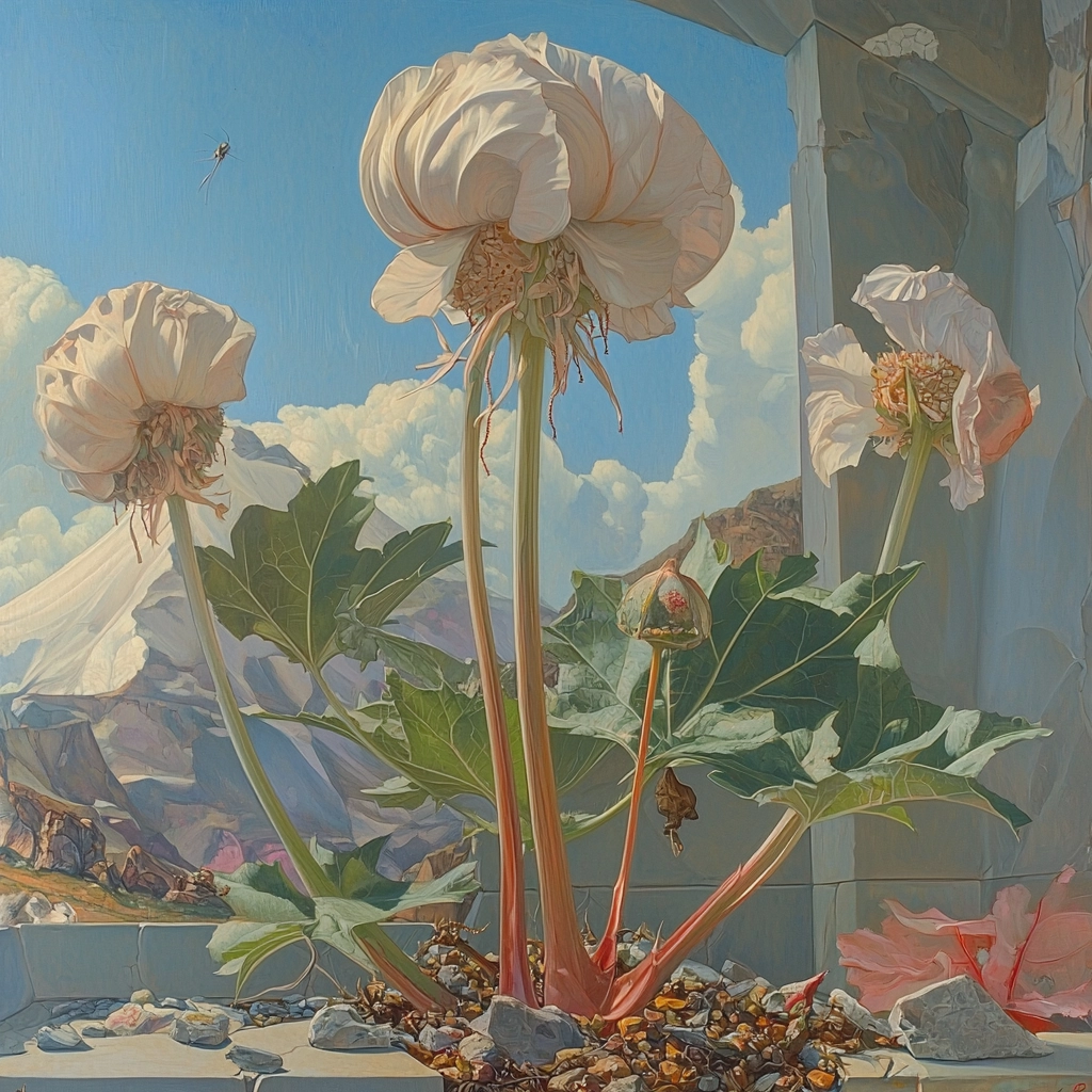 The lighting effects create a captivating blend of shadows and highlights, emphasizing the organic forms and surfaces within the arrangement. The colors are vibrant and varied, enhancing the contrasts and depth of each aspect. The spatial sense is well-defined, providing a realistic portrayal of distance and dimension which complements the detailed texture of each layer.