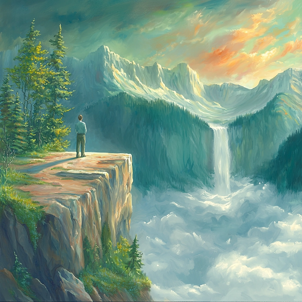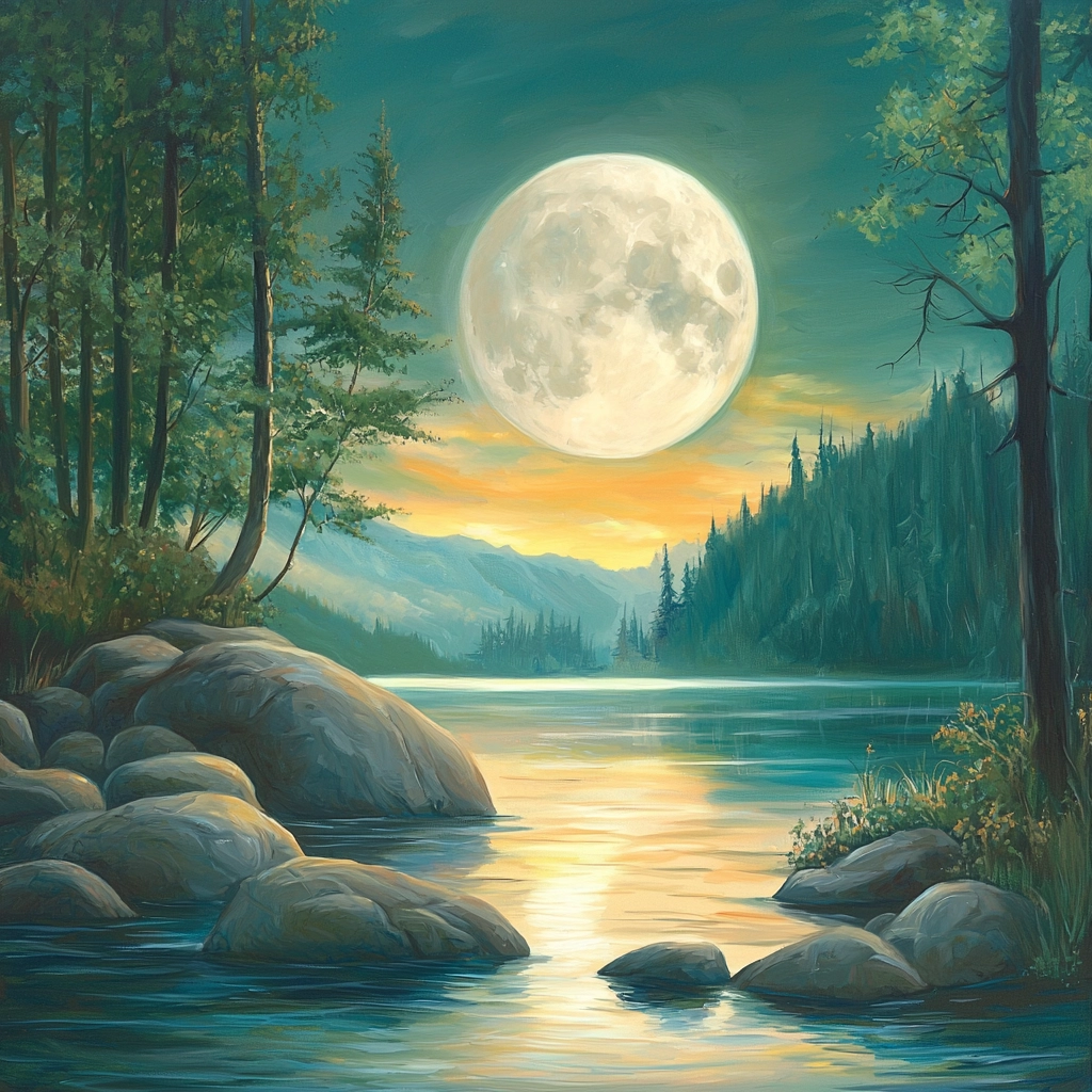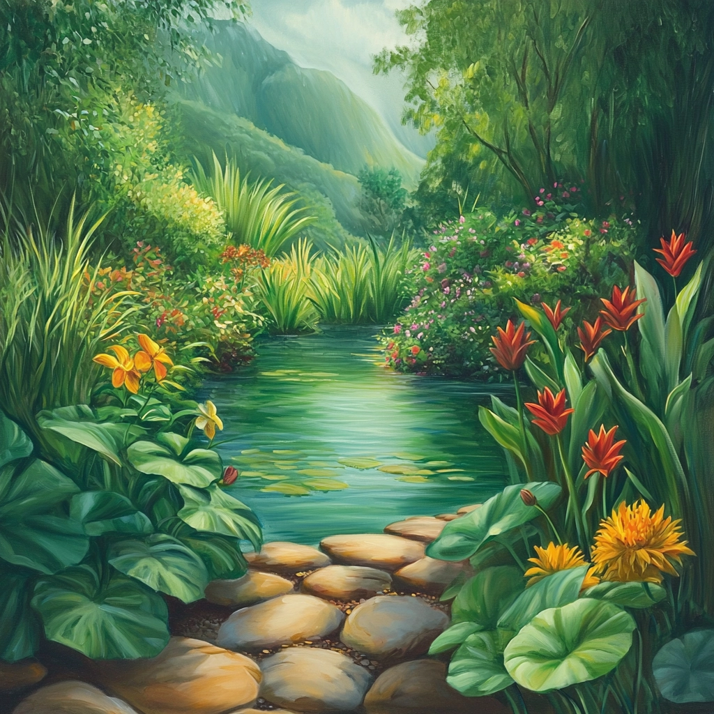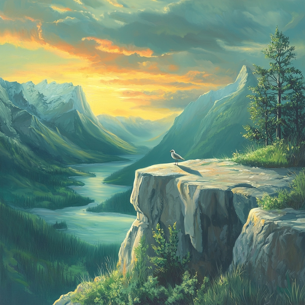 Prominent use of luminous contrasts between foreground and background elements create depth. Soft gradation of green hues offers a realistic depiction of plant life while vibrant oranges capture changing sky light. Detailed textures in plant foliage present an immersive tactile quality.