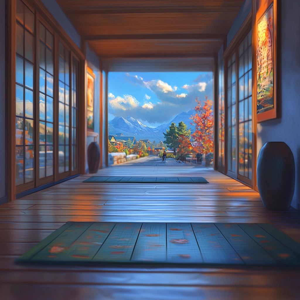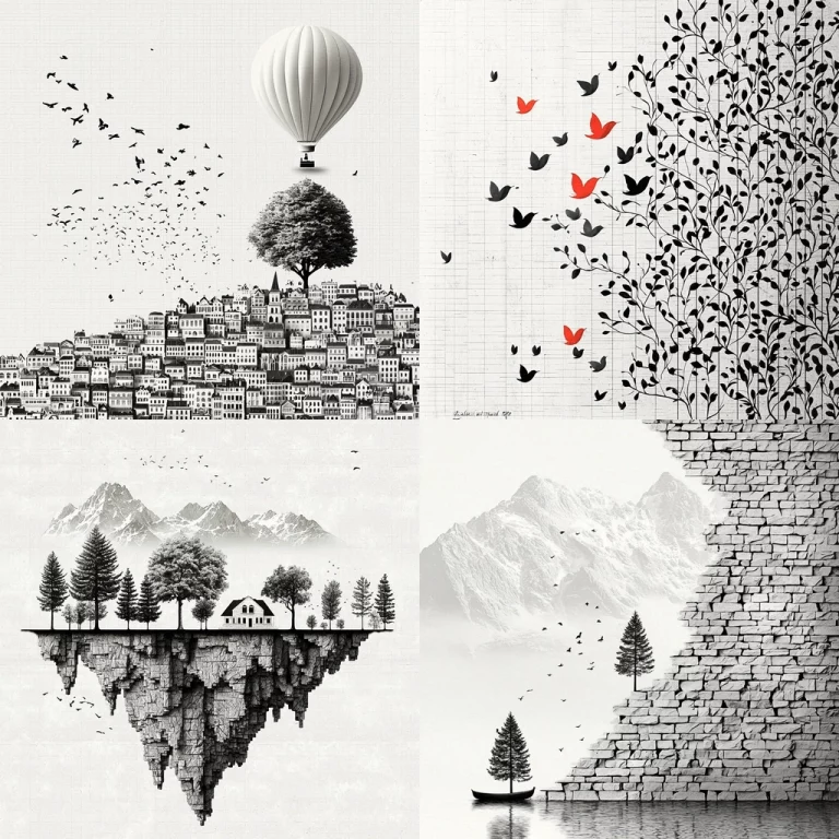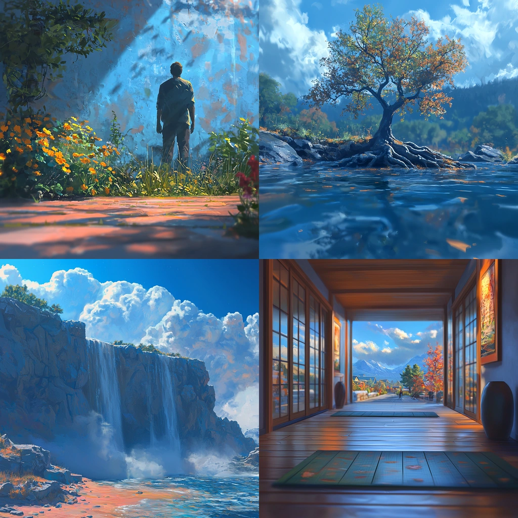 The scenes exhibit a vivid blend of nature and human elements through rich, vibrant colors and dynamic compositions.