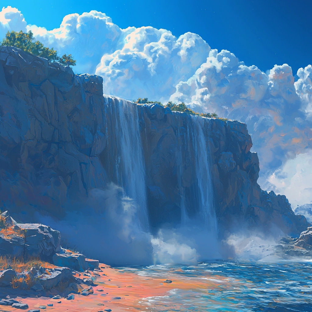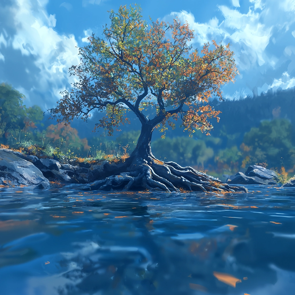 The lighting emphasizes contrasts between shadow and illuminated areas, enhancing the depth of the landscapes. Colors are vibrant and lush, creating a sense of spatial expanse, with textures that suggest smoothness in water and roughness in foliage.