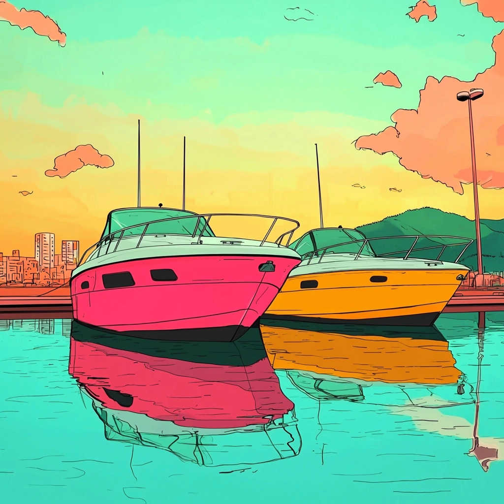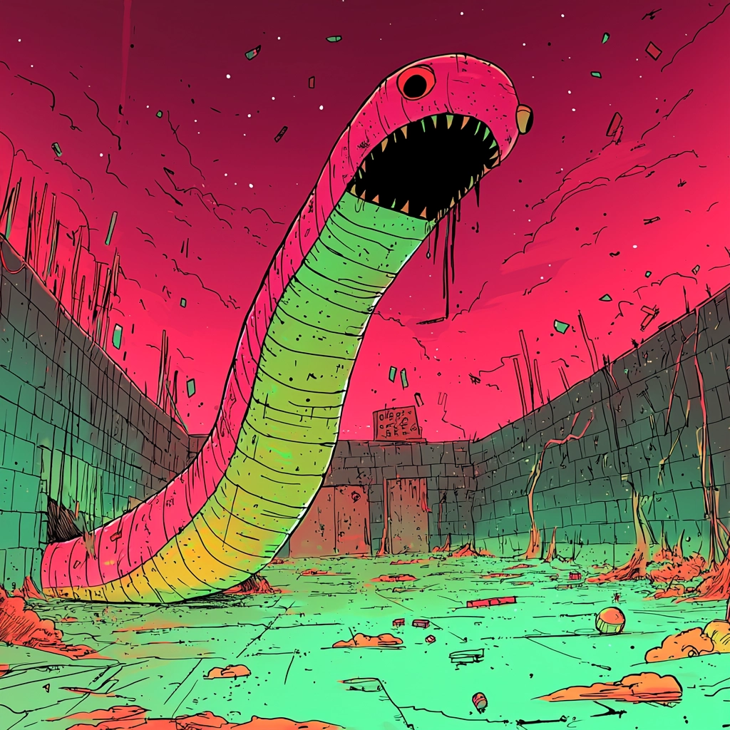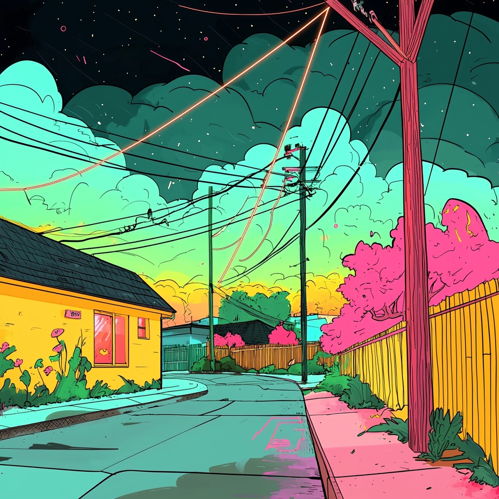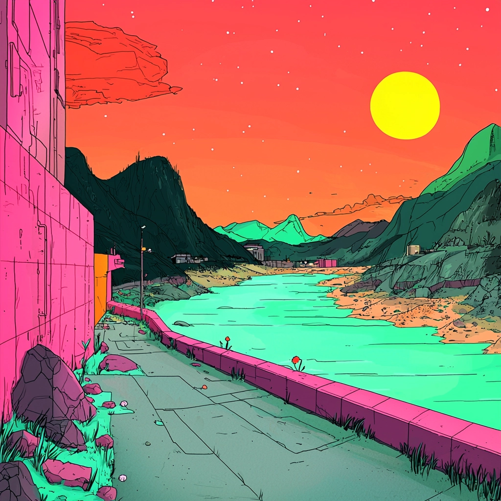 Bold neon palette with defined lines and vivid contrasts.