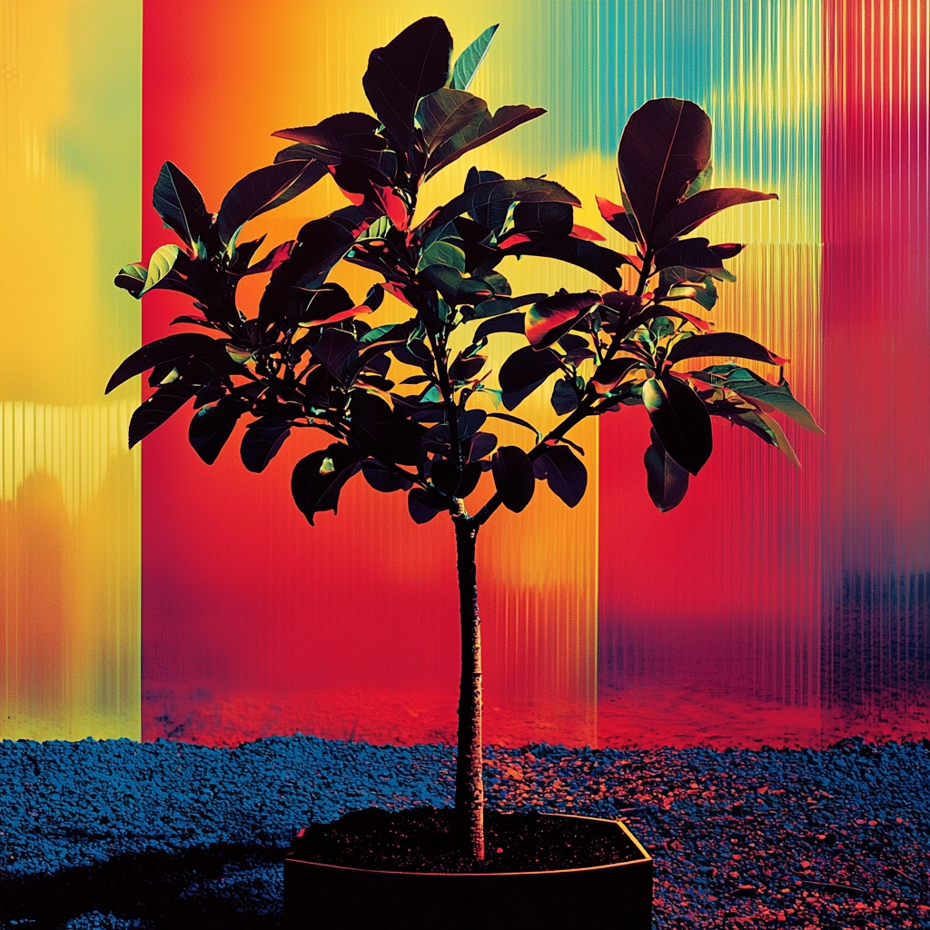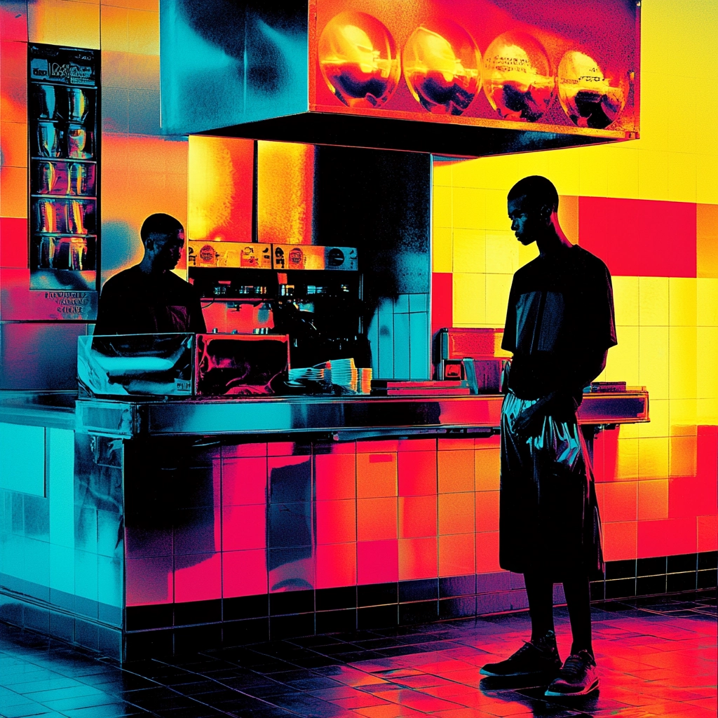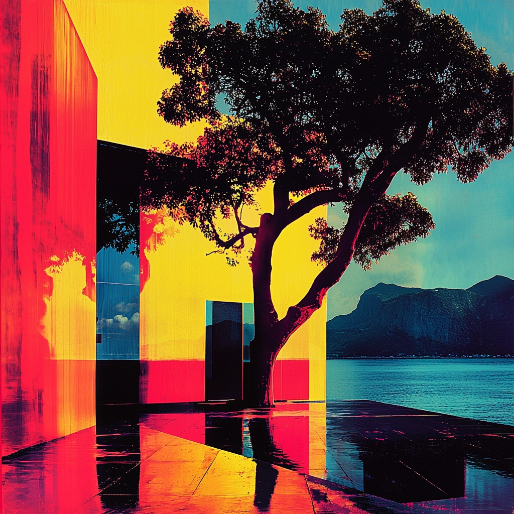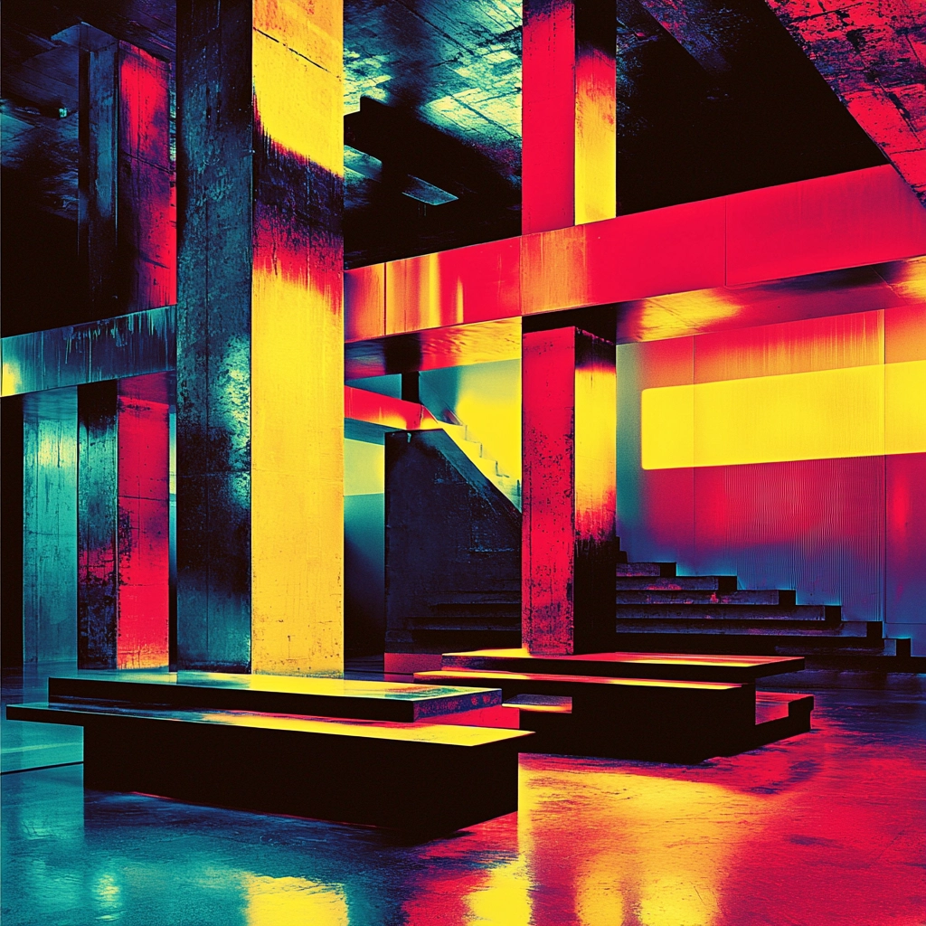 Illuminating light effects create dramatic contrast with deep shadows. Colors are saturated and bold, enhancing the graphic quality and delineating space with precision. Textures are sleek yet visually arresting.