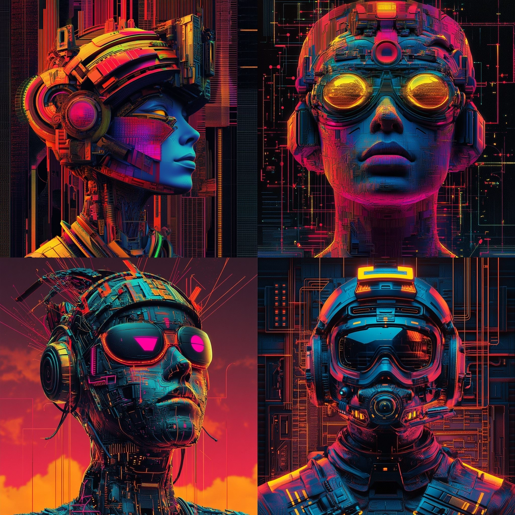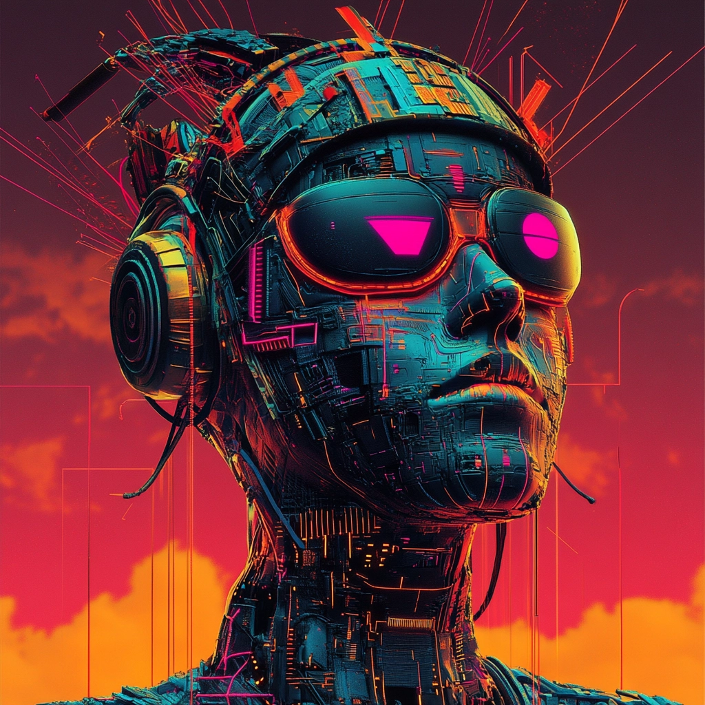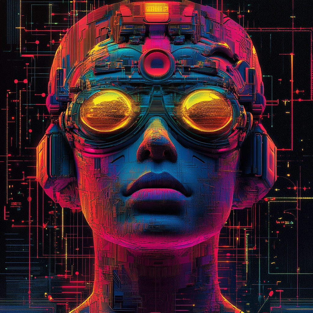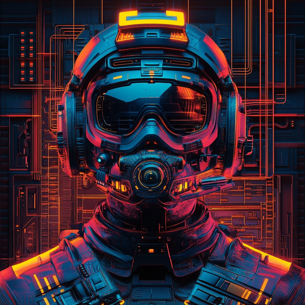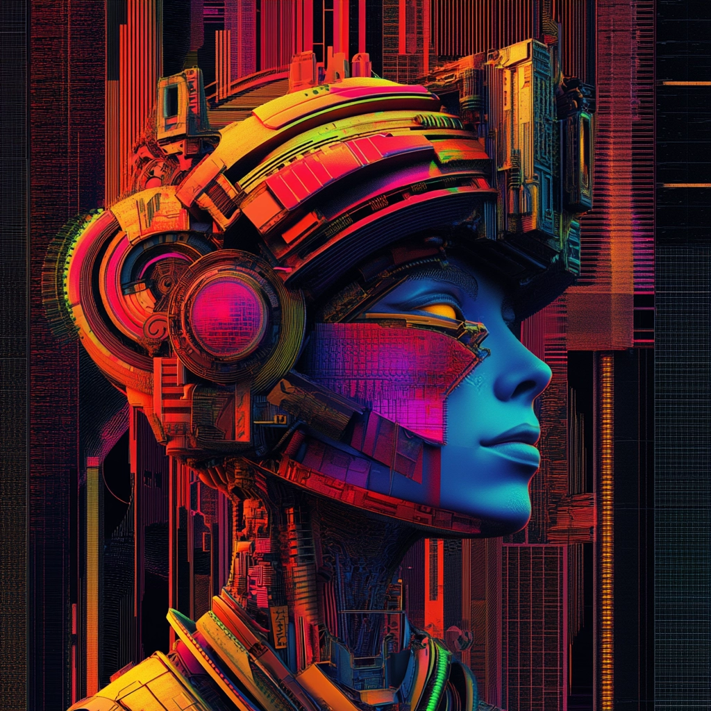 This composition utilizes neon color schemes with intricate mechanical textures and structured forms within a digital visual context.