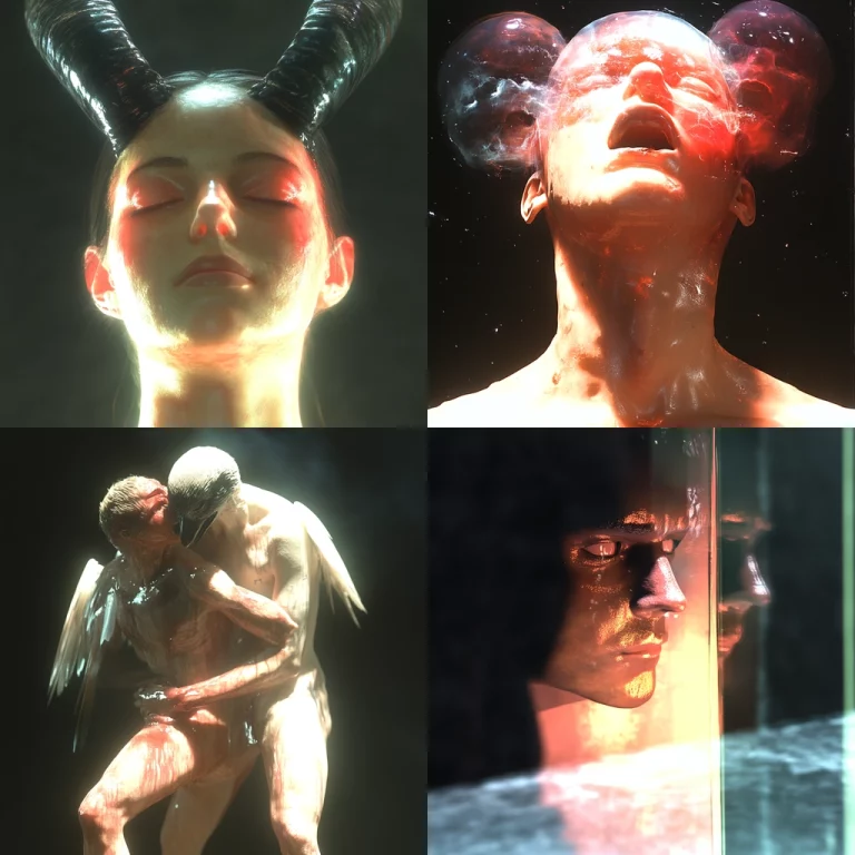 Strong lighting effects create a sense of depth through intense neon illumination. Colors are vivid and sharply defined, generating a dynamic tension across the composition. Textures are implied, giving a smooth yet striking visual feel.
