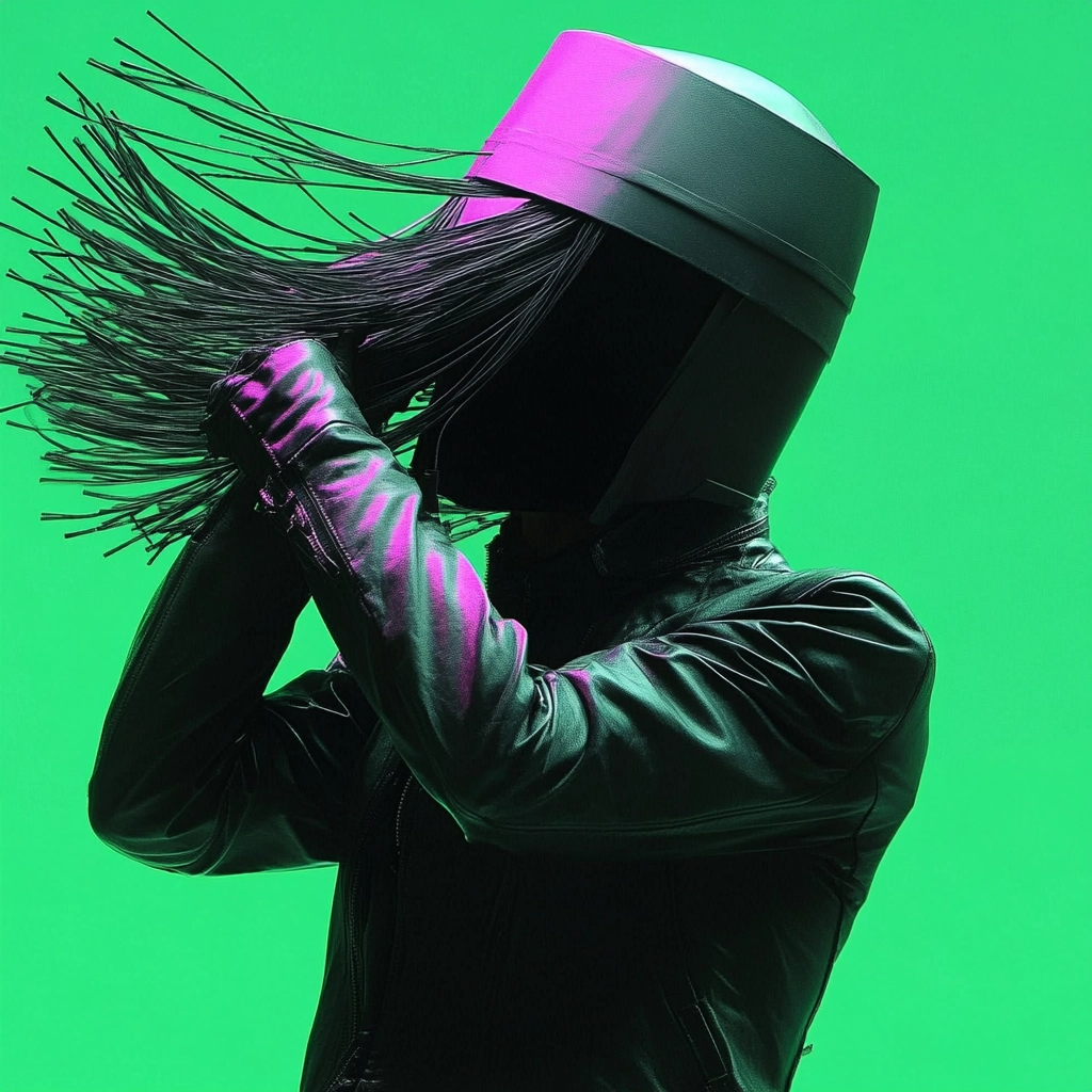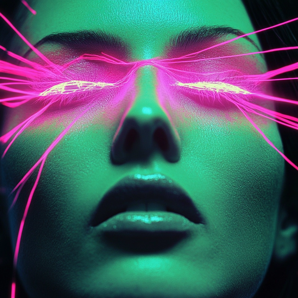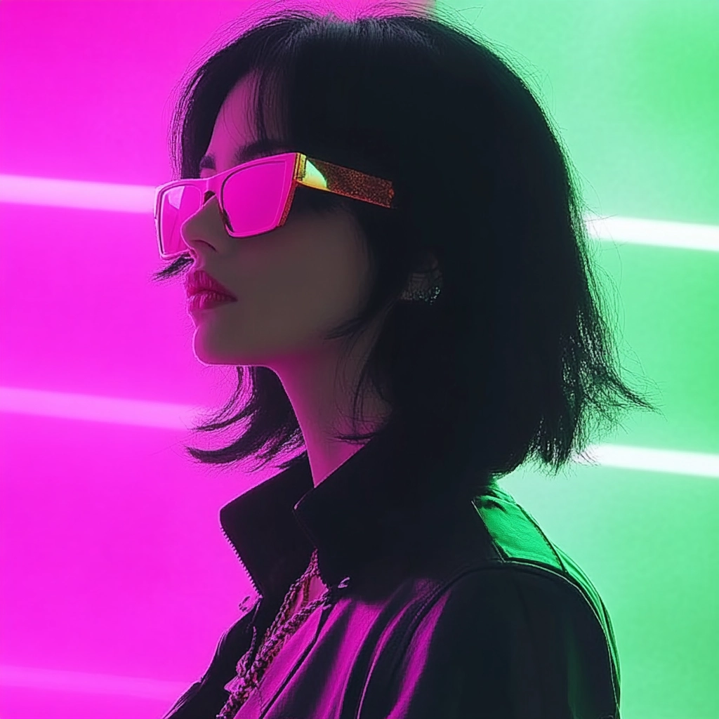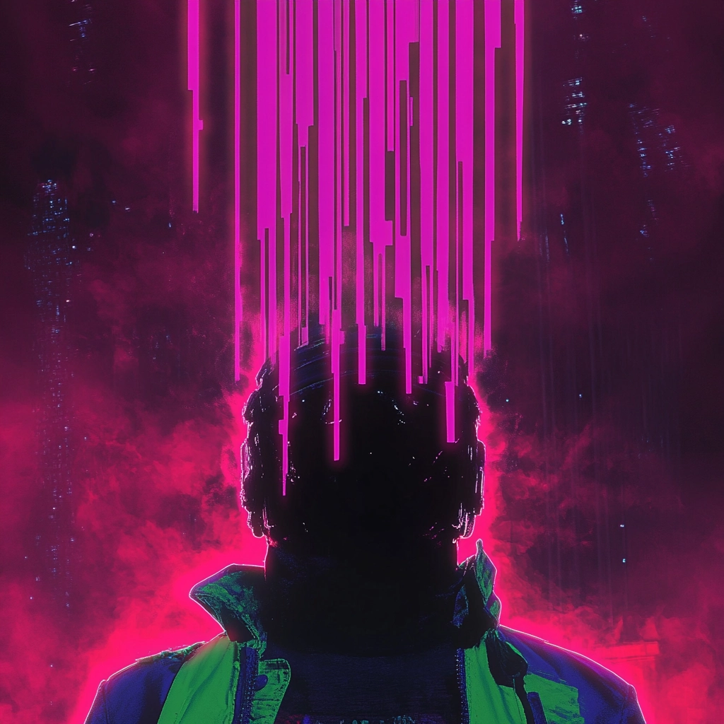 Vivid neon hues sharply contrast with dark elements, enhancing a futuristic aura.