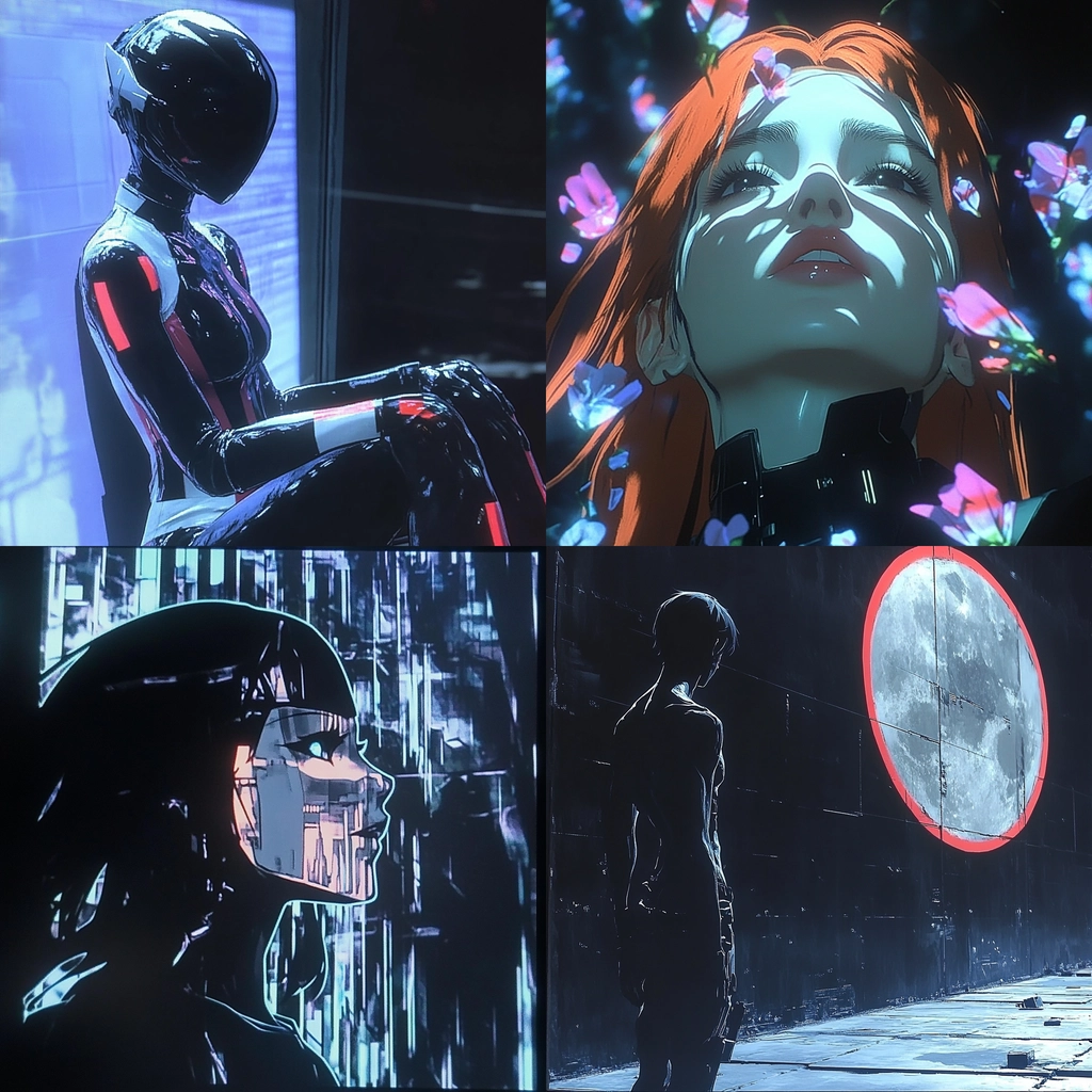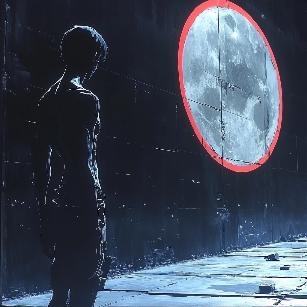 The graphic intensity features high-contrast color schemes and sharp light reflections, immersing the viewer in a spatially layered digital realm. Blue and red tones dominate, with glowing accents creating dramatic depth.