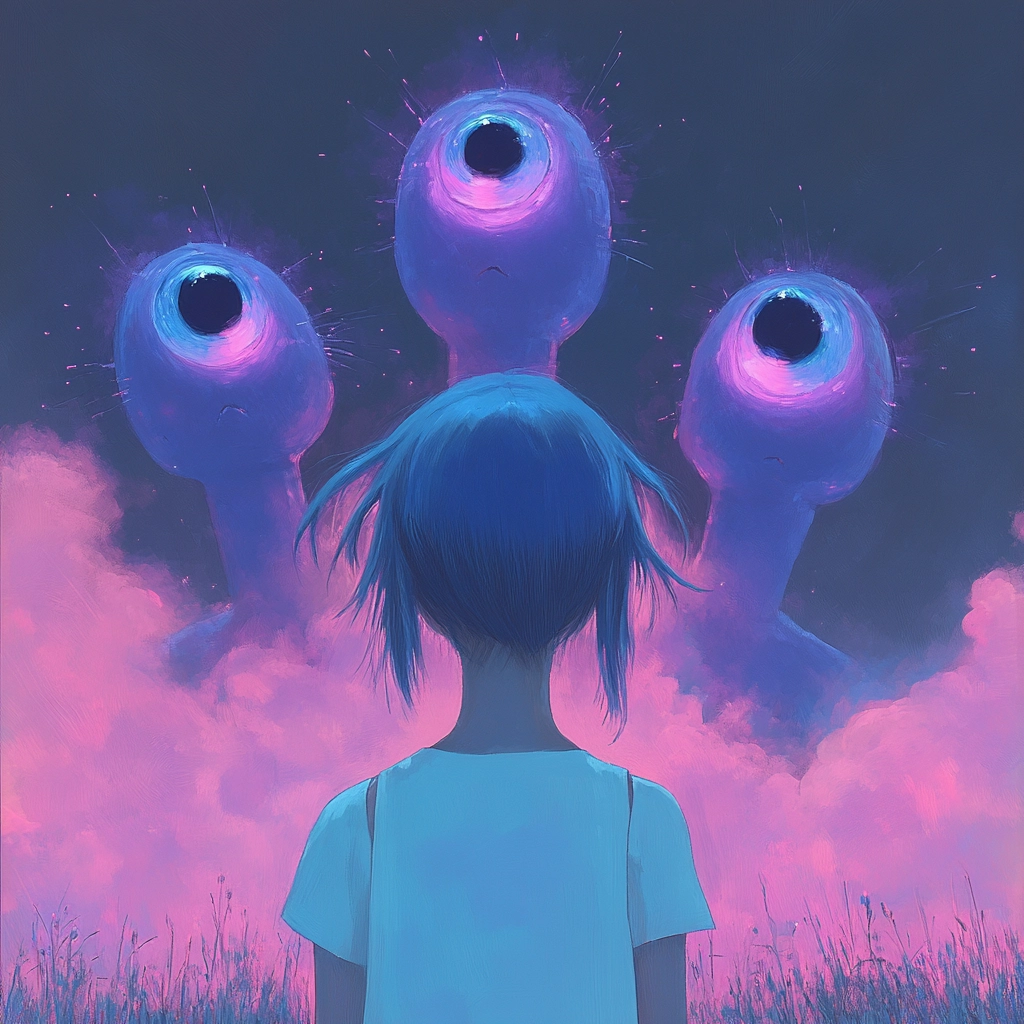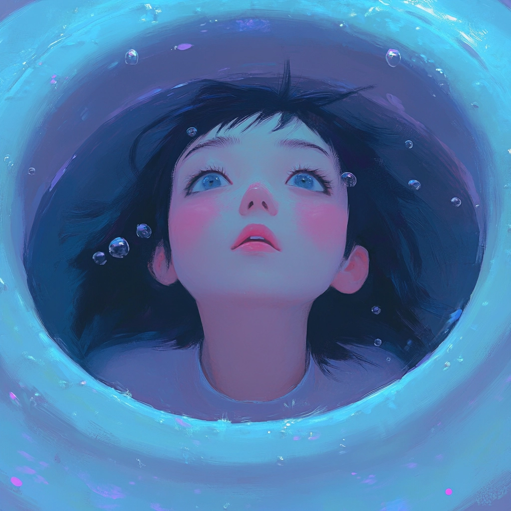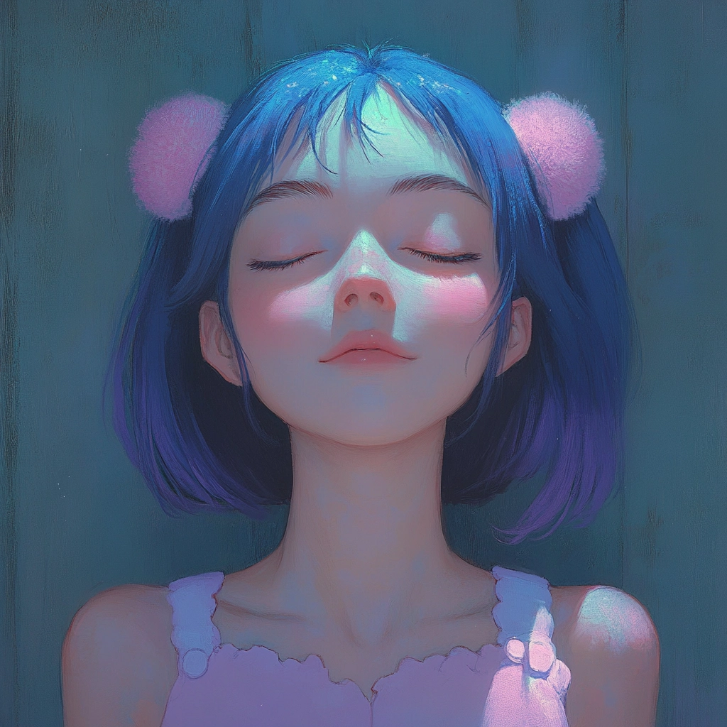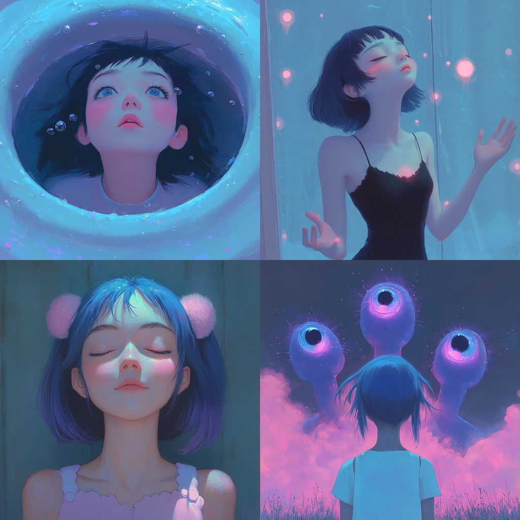 The lighting effects highlight the subjects and enhance the mood through soft, diffused illumination. Colors range from bright neon tones to soothing pastels, contributing to an overall sense of depth. Textures are smooth and fluid, reinforcing the ethereal quality of the visual elements.