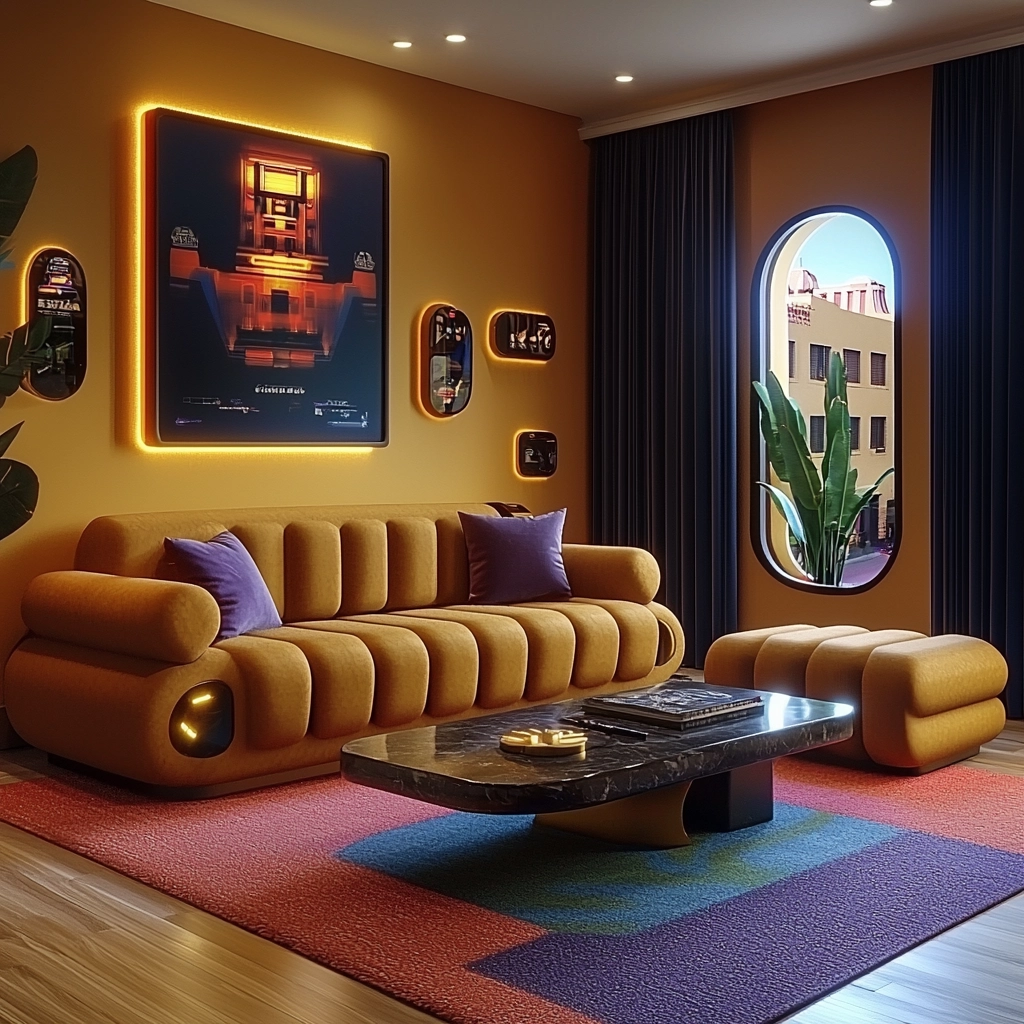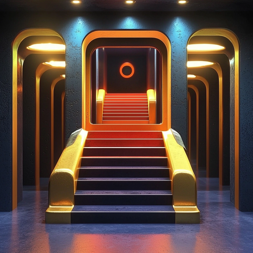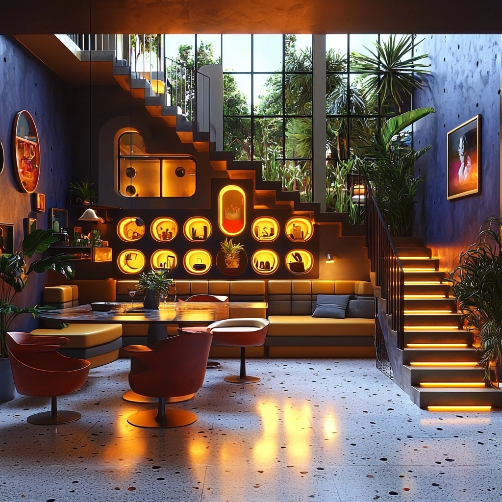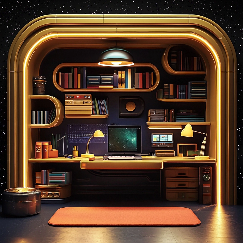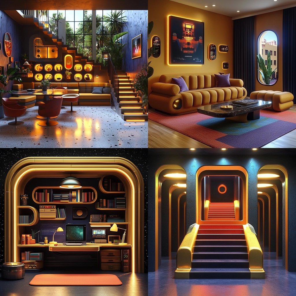 The lighting is precise and highlights key areas with a warm, glowing effect. Color use is bold and creates high contrast, enhancing the spatial sense and making objects pop. Textures are smooth and polished, contributing to a retro yet modern feel.
