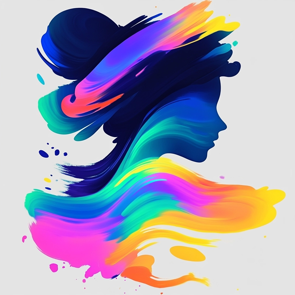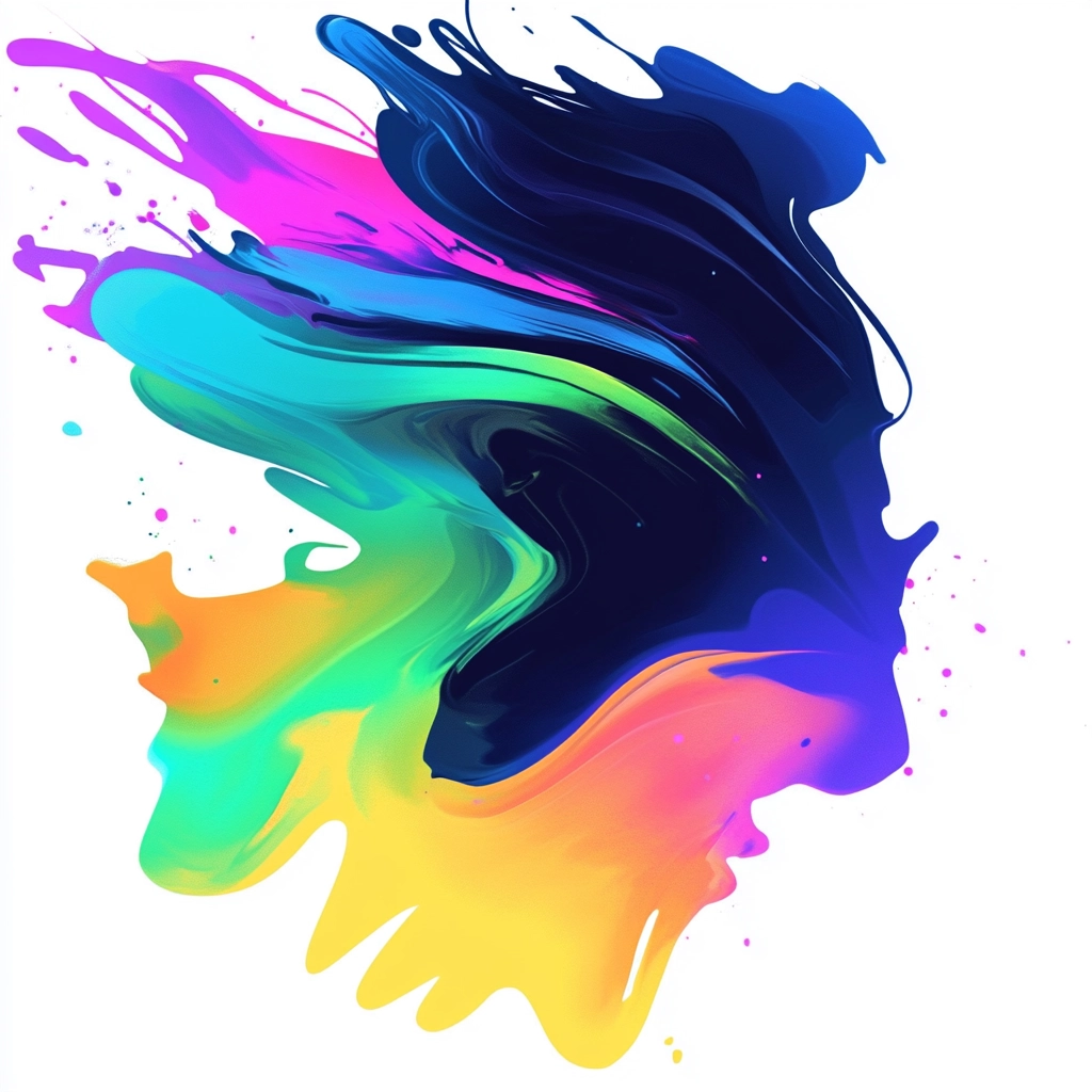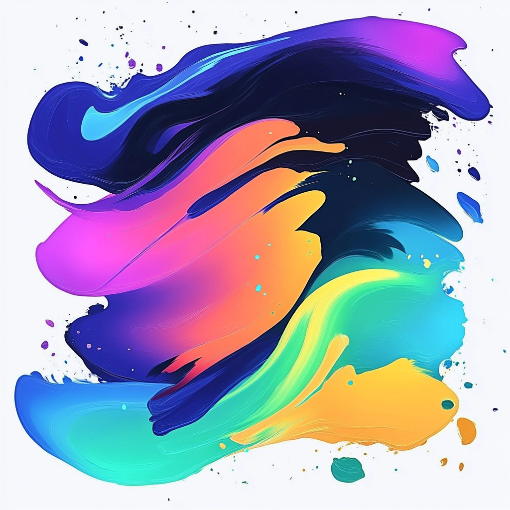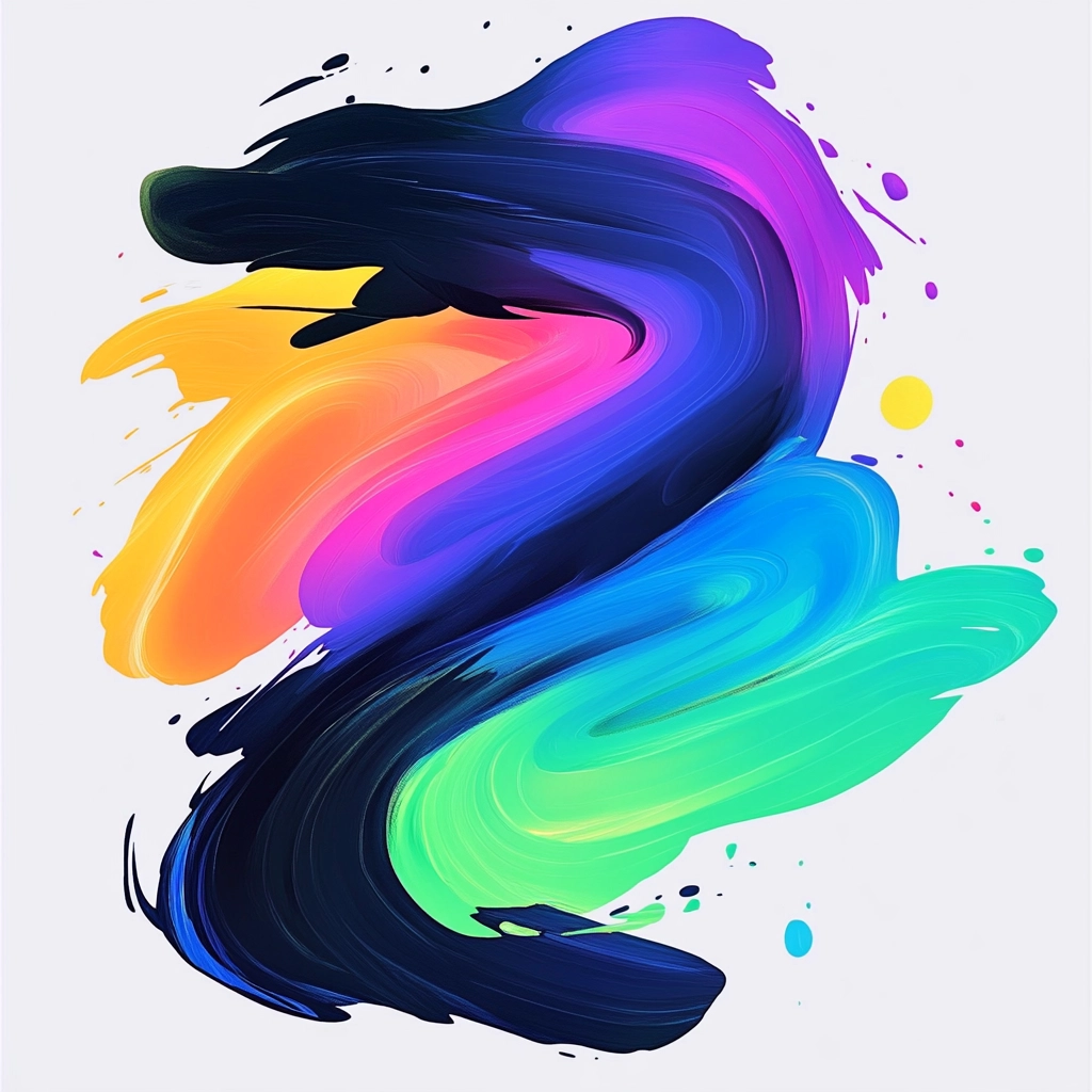 The brushstrokes exhibit luminous neon colors contrasted with deep indigo tones. Lighting effects highlight the fluidity and gradation of hues, generating a vivid sense of spatial depth. Textures appear smooth and flowing, enhancing the dynamic composition.