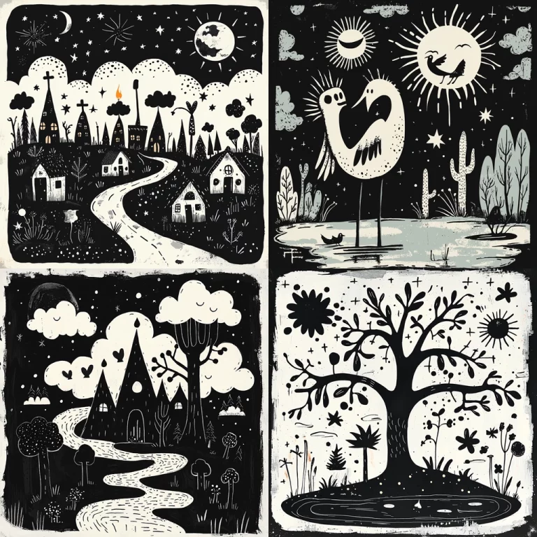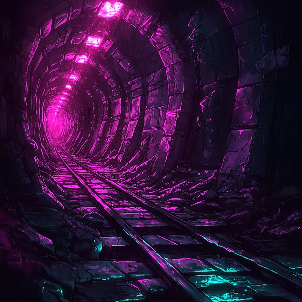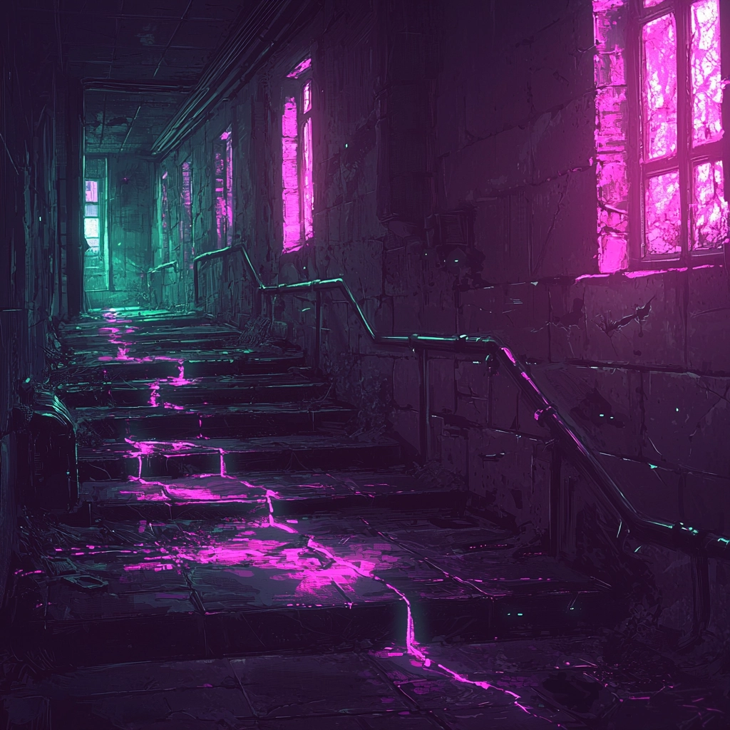 The lighting effects are primarily dominated by glowing pink hues contrasted against deep, shadowy backgrounds, creating a striking visual impact. Textures vary from smooth surfaces to rugged details, enhancing the spatial depth portrayed in each segment.
