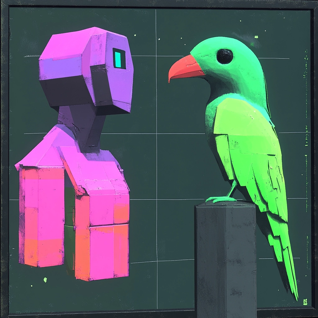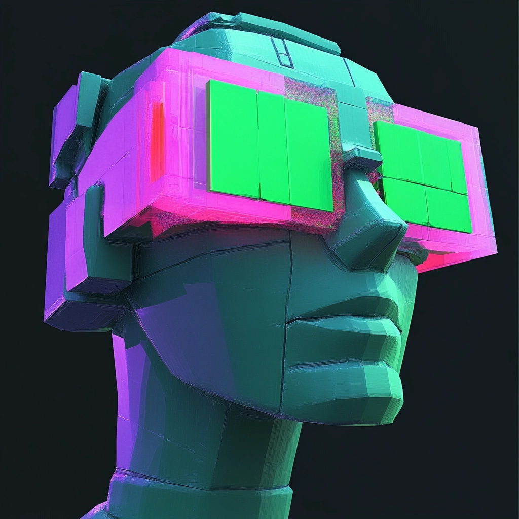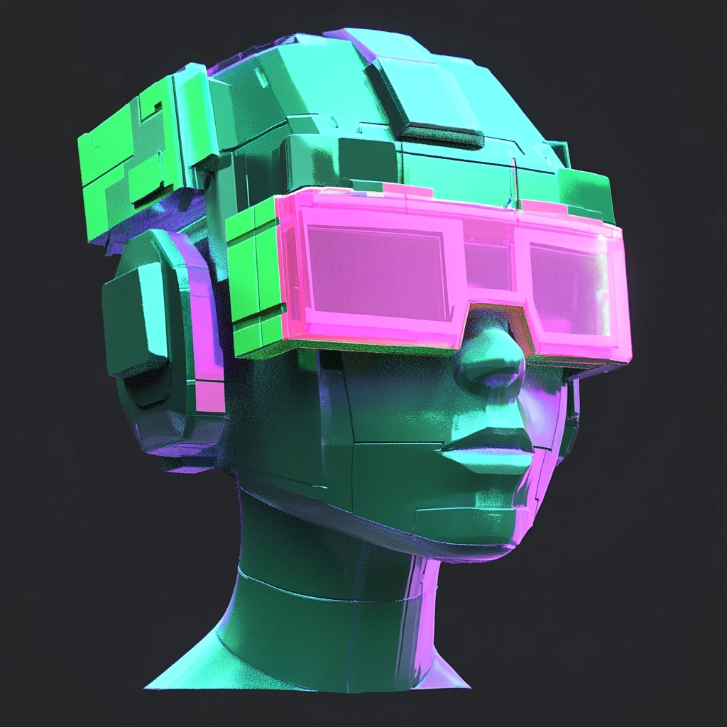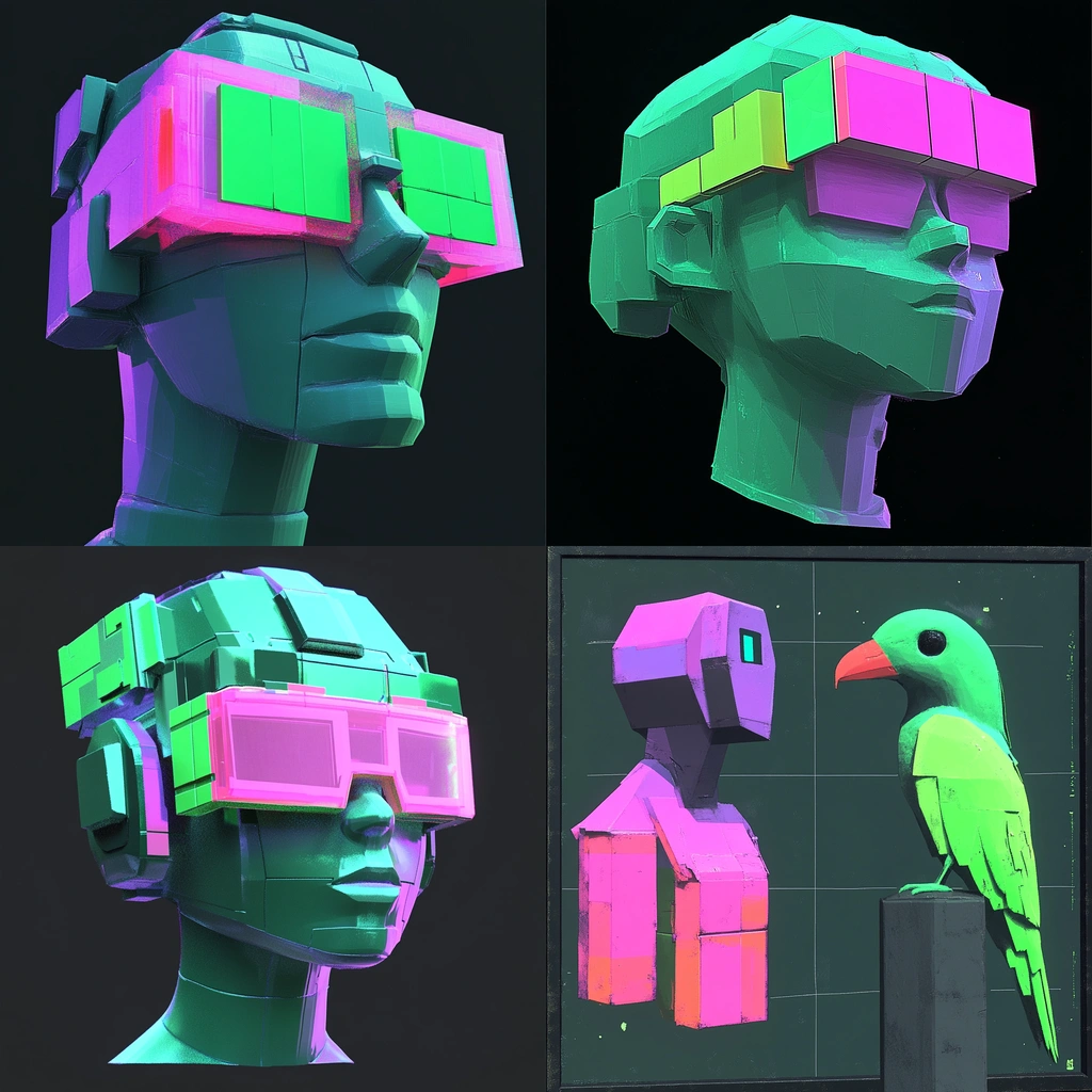 Distinct lighting accentuates sharp edges and smooth surfaces, enhancing spatial depth. Bold color contrasts merge with clear textures, offering a 3D appearance that highlights technological influences.