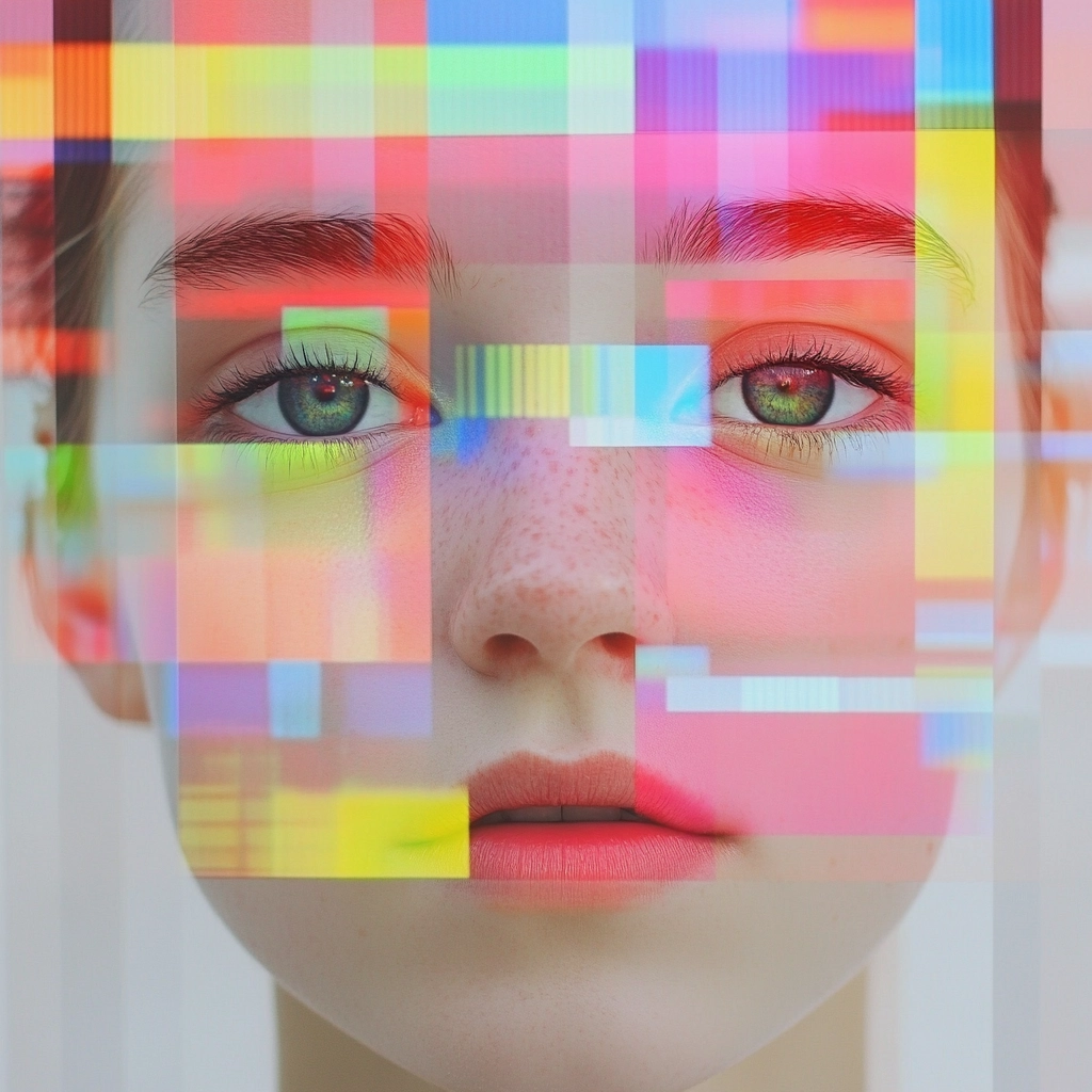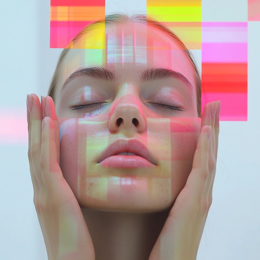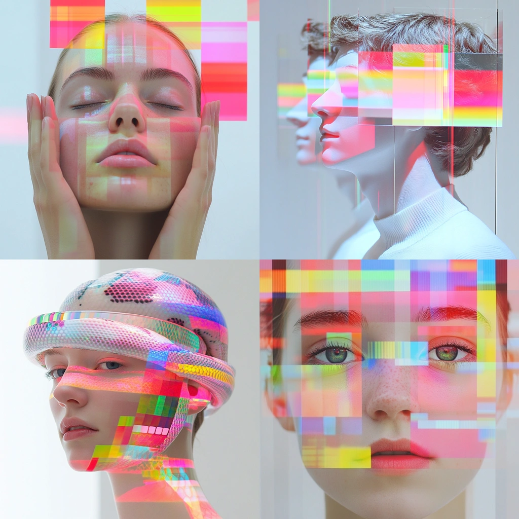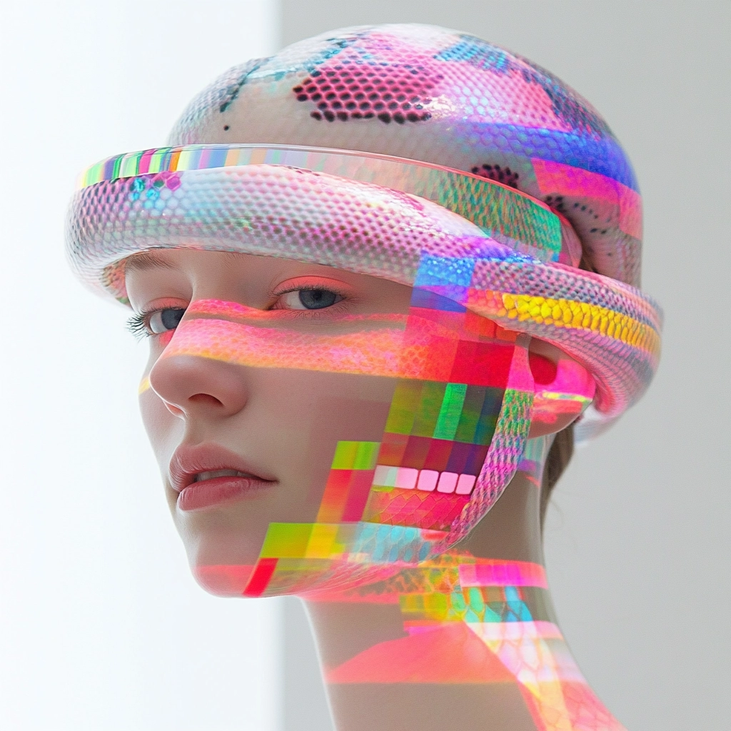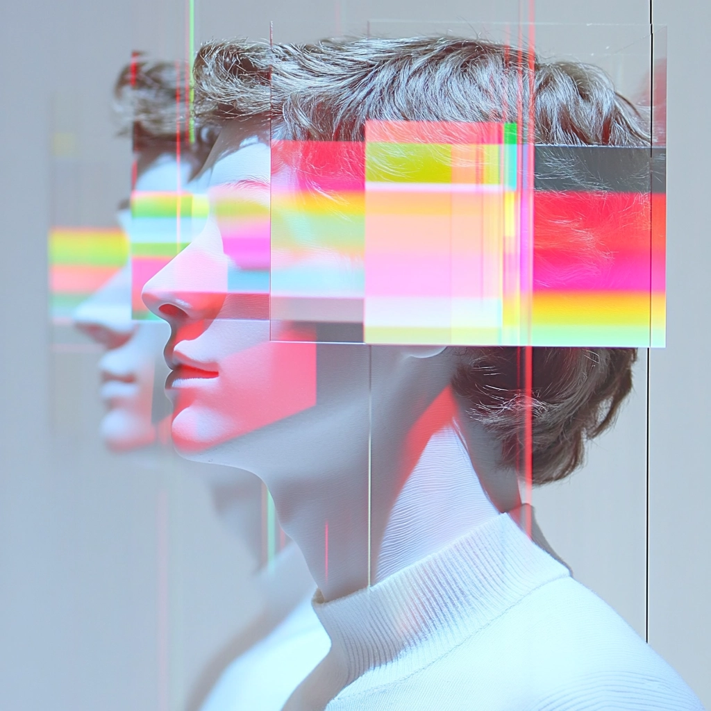 The lighting accentuates intense neon colors creating a juxtaposition with glitch effects. The texture alternates between smooth and disrupted, generating a spatial play of light and dark. The overall effect captures a fractured digital reality.