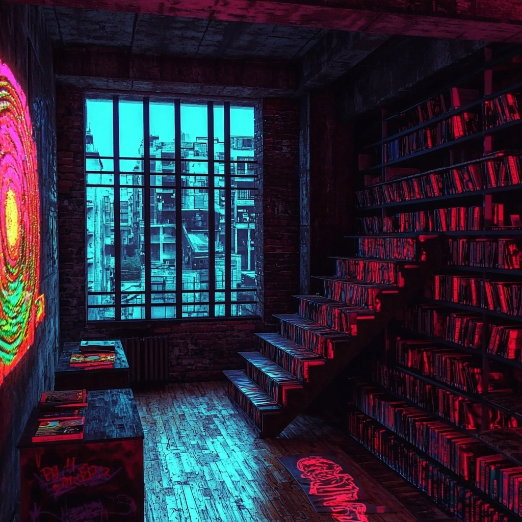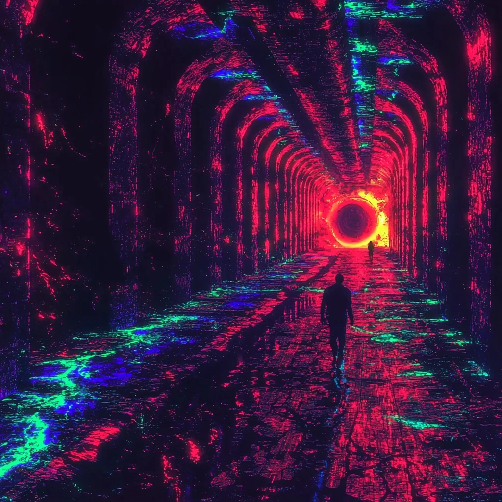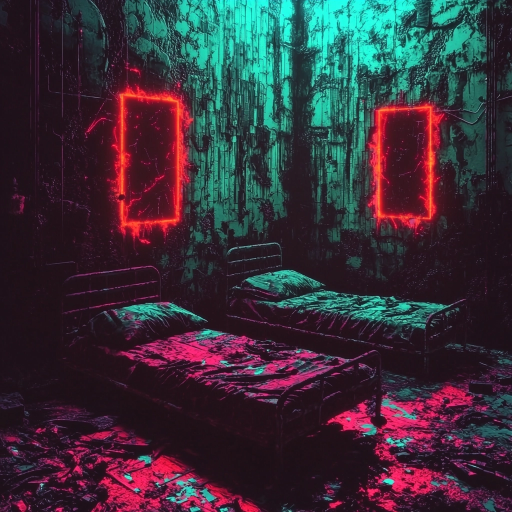 Illuminated with neon lights, the color palette juxtaposes dark blue and magenta. Sharp textures and dynamic lighting present a distinct spatial tension, enhanced by glitch-like visual distortions adding depth and intricacy.