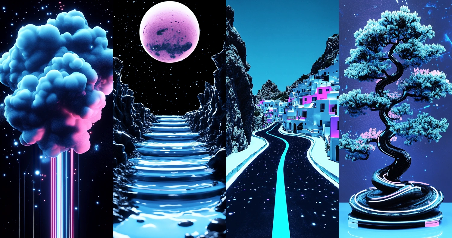 Vivid neon colors contrast sharply against dark backgrounds.