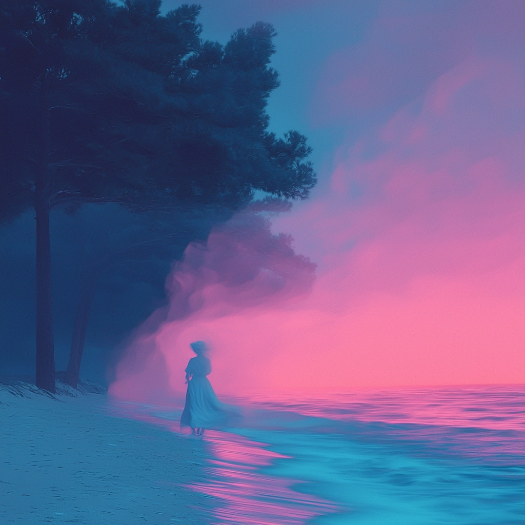 Vibrant pink and blue hues dominate soft forms.
