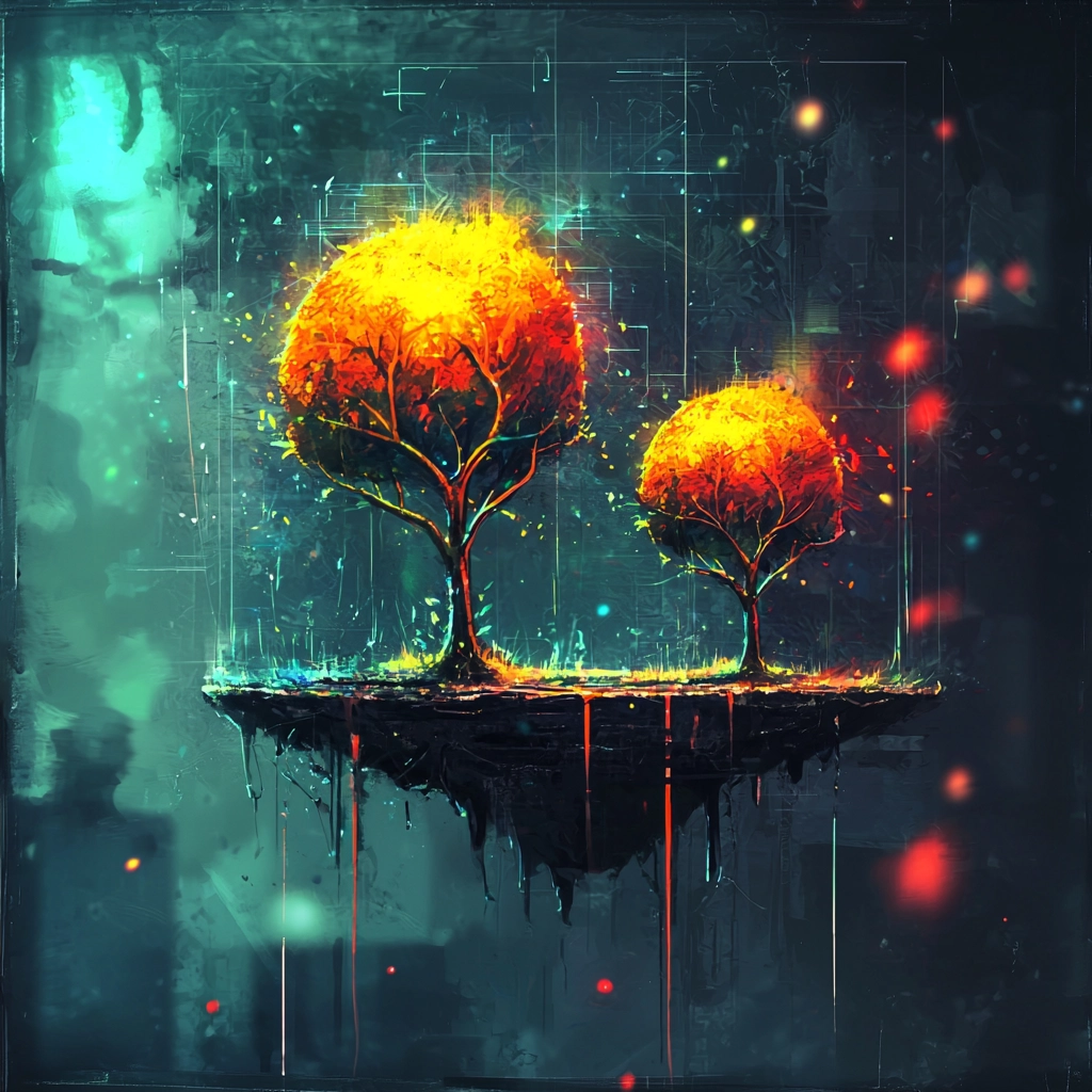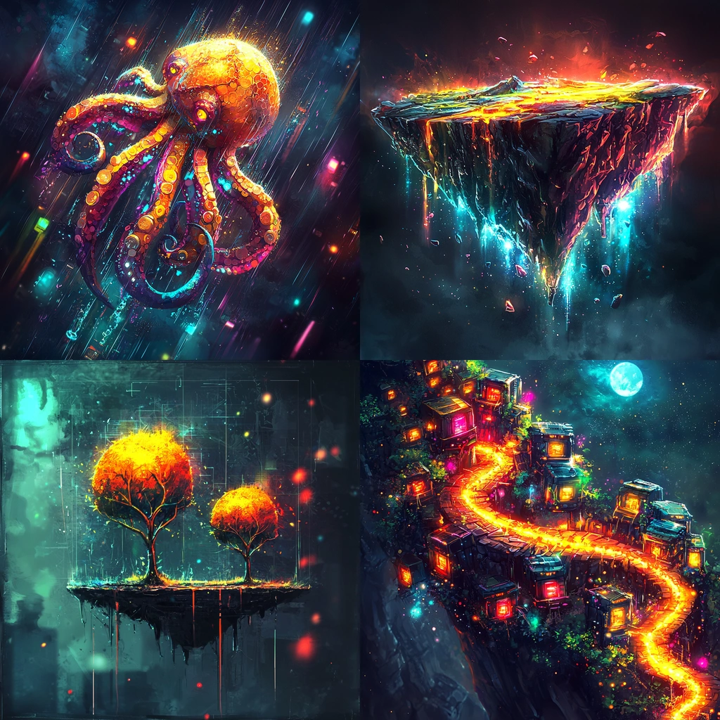 Bold neon colors are juxtaposed against dark backdrops, creating a striking visual impact.