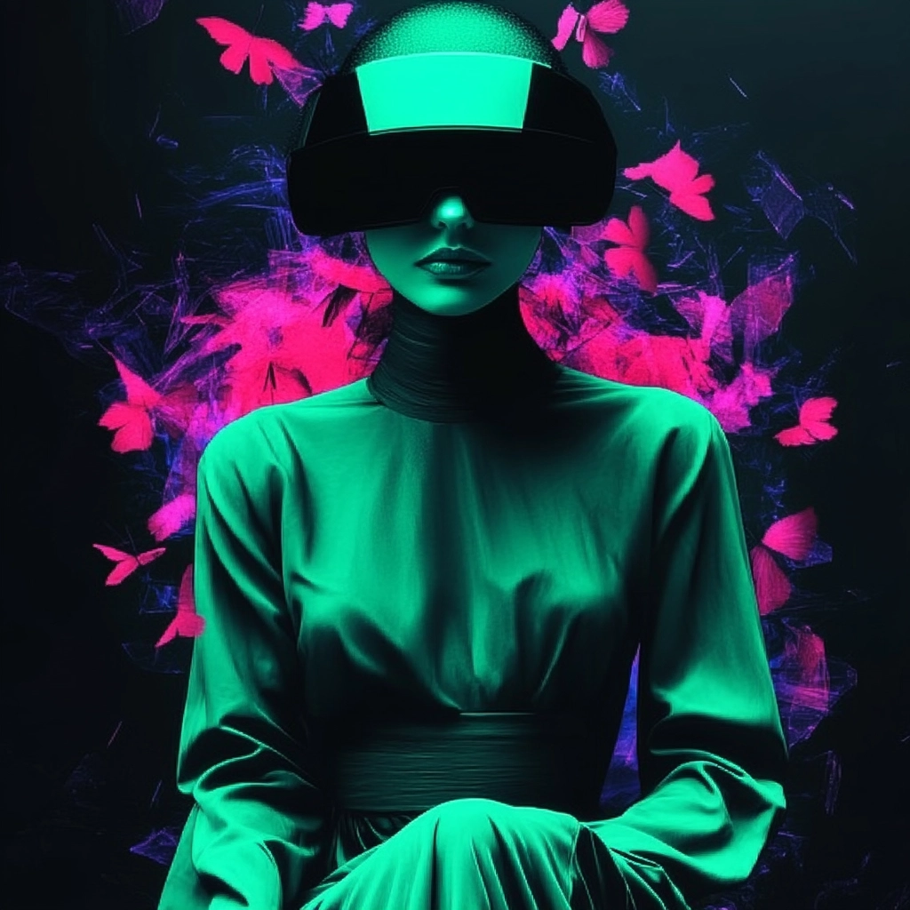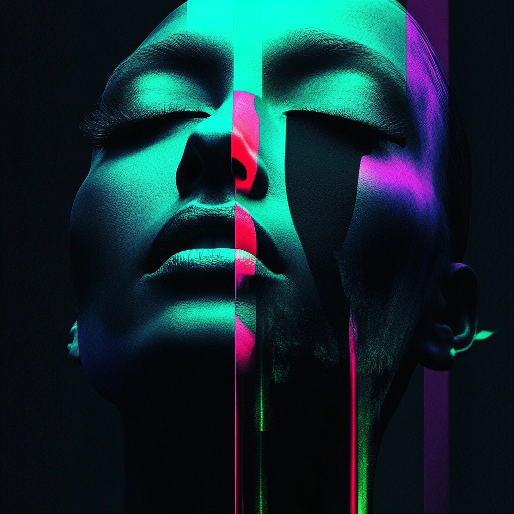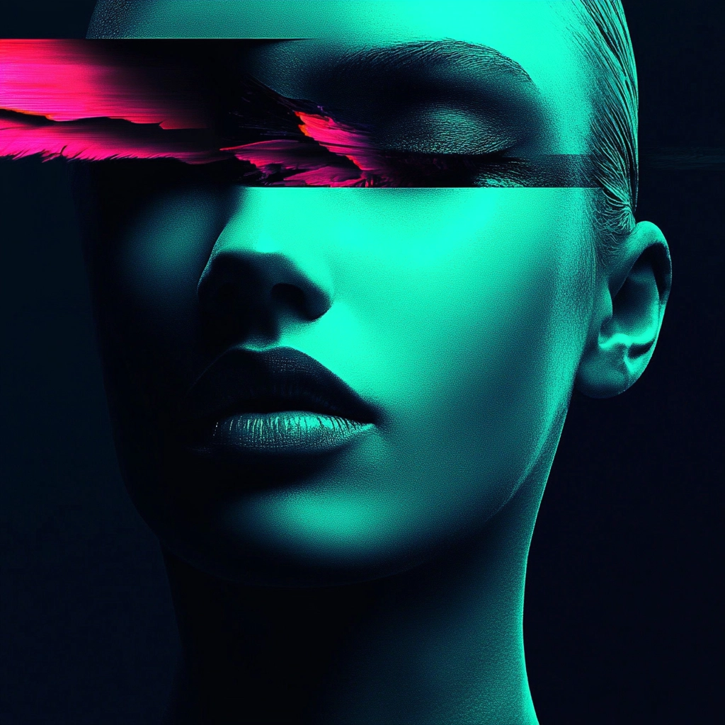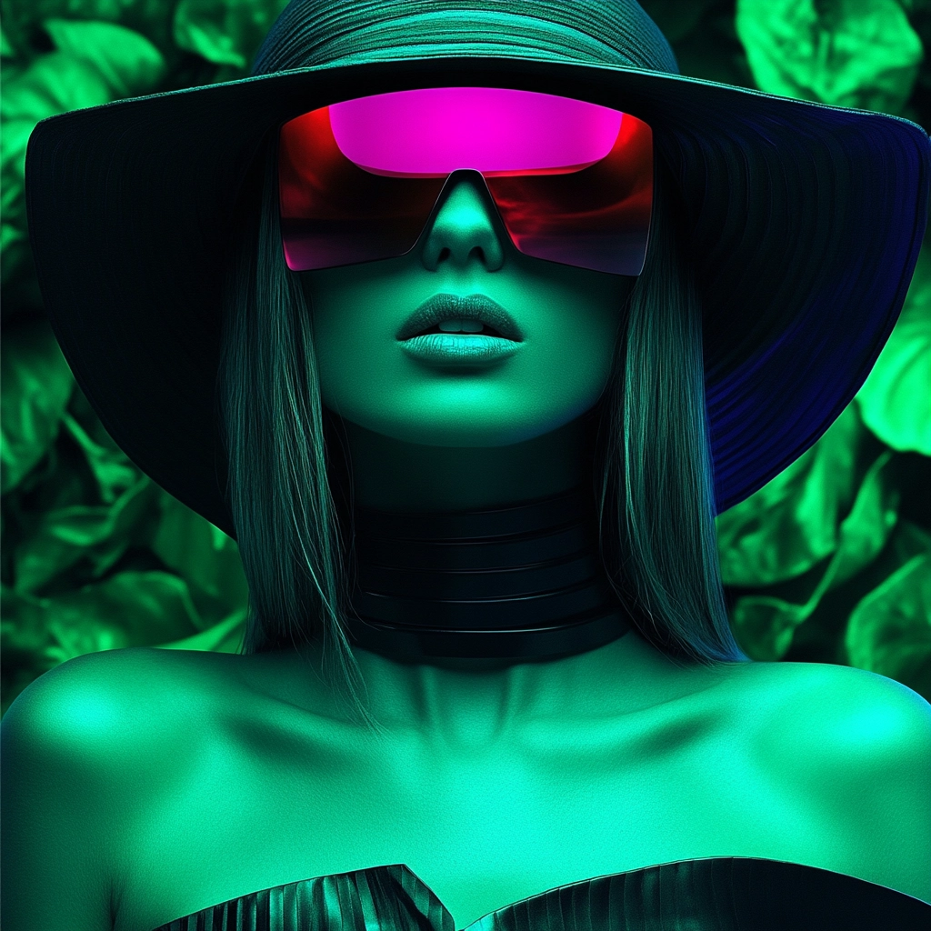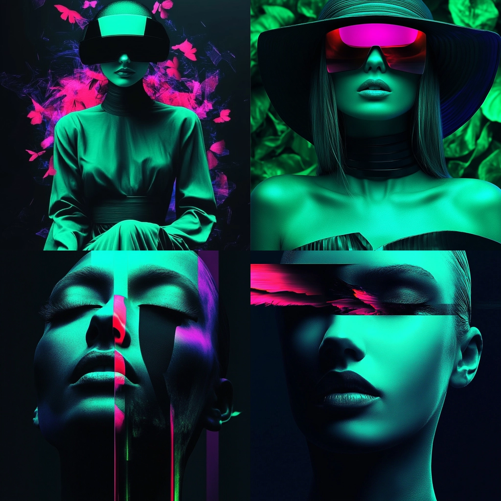 The use of dramatic lighting accentuates rich neon colors against dark backgrounds.